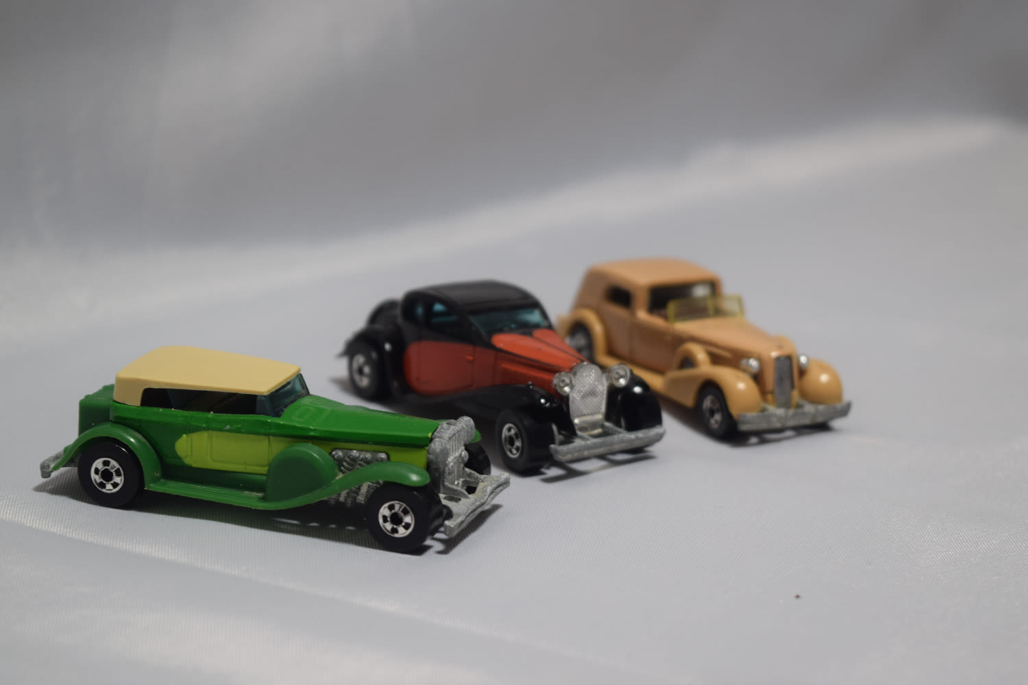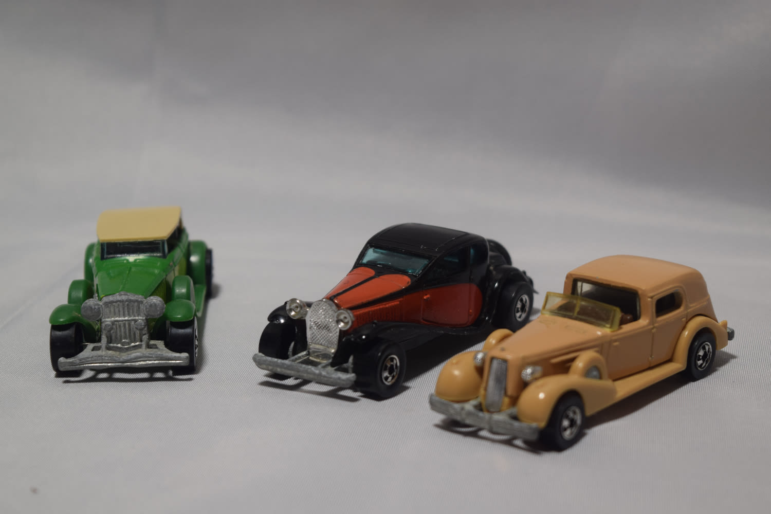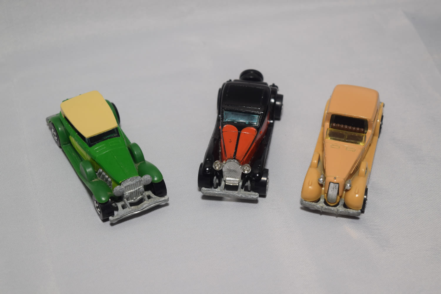 1976 31 DOOZIE, 1981 35 CLASSIC CADDY, 1980 37 BUGATTI ALL HOT WHEELS EDITION. NO BOX INCLUDED