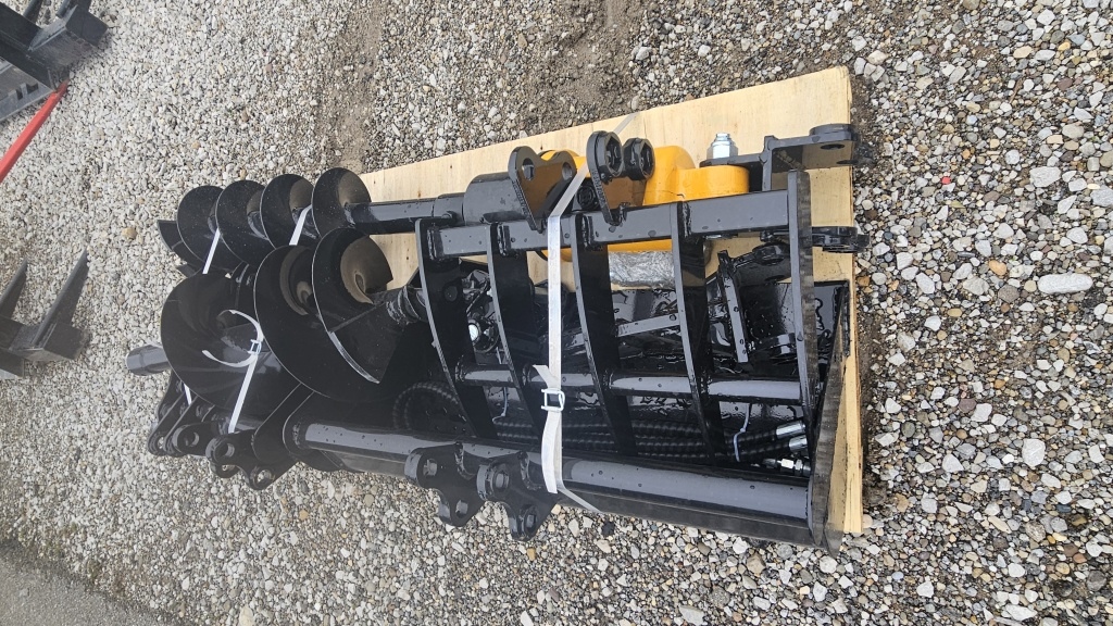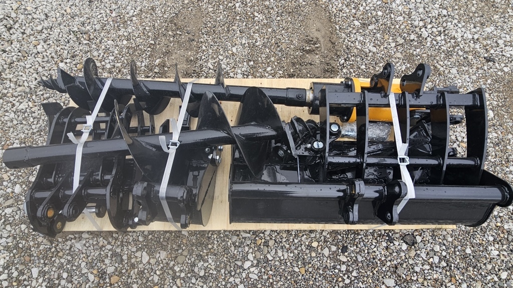 NEW FUTURE MINI EXCAVATOR PALLET FULL OF ATTACHMENTS (RAKE, RIPPER, 3 BUCKETS, AUGER & 3 BITS (ROUGH SIZES 8″, 12″,16″))
