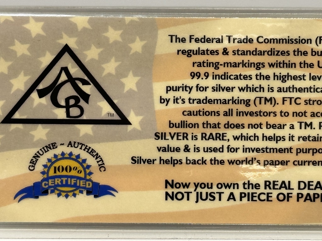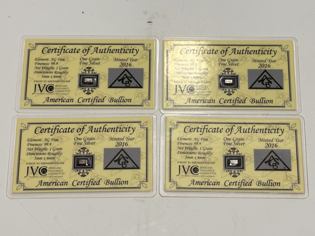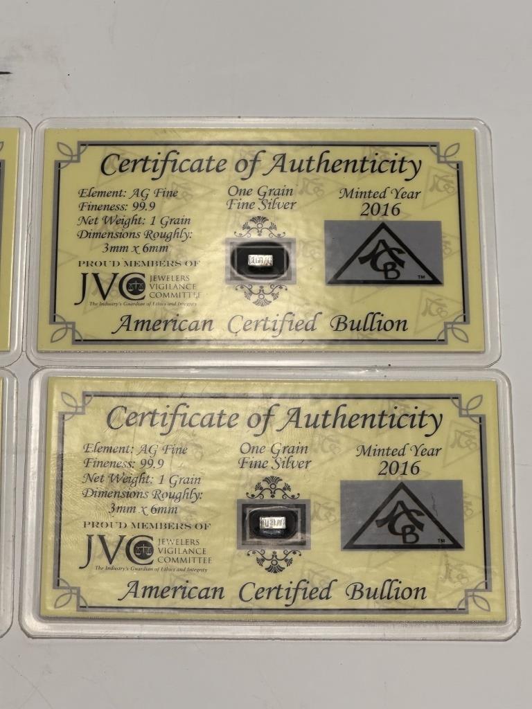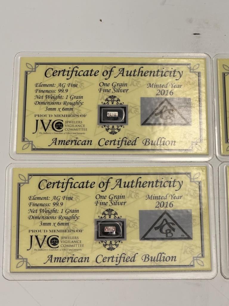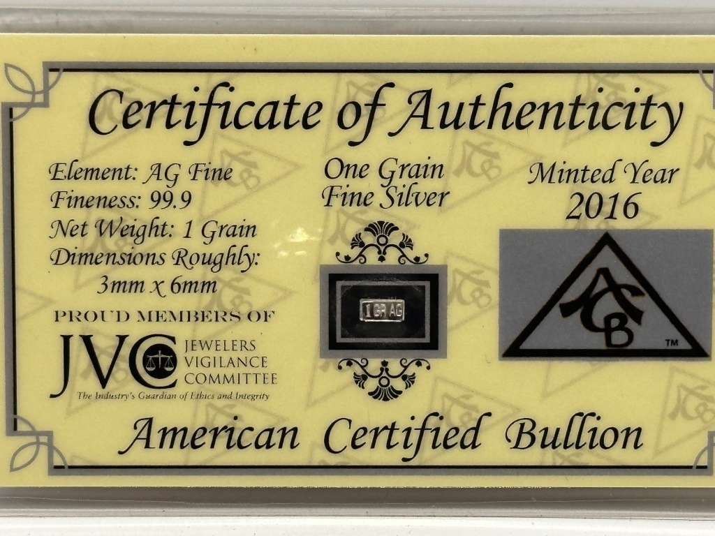 ONE GRAM SILVER WITH CERTIFICATE OF AUTHENTICITY AMERICAN CERTIFIED BULLION AG FINE 99.9 1 GRAIN 3MMX6MM