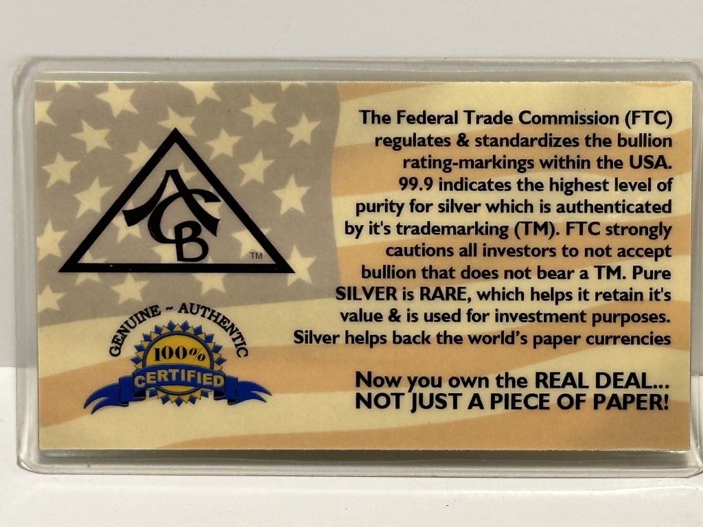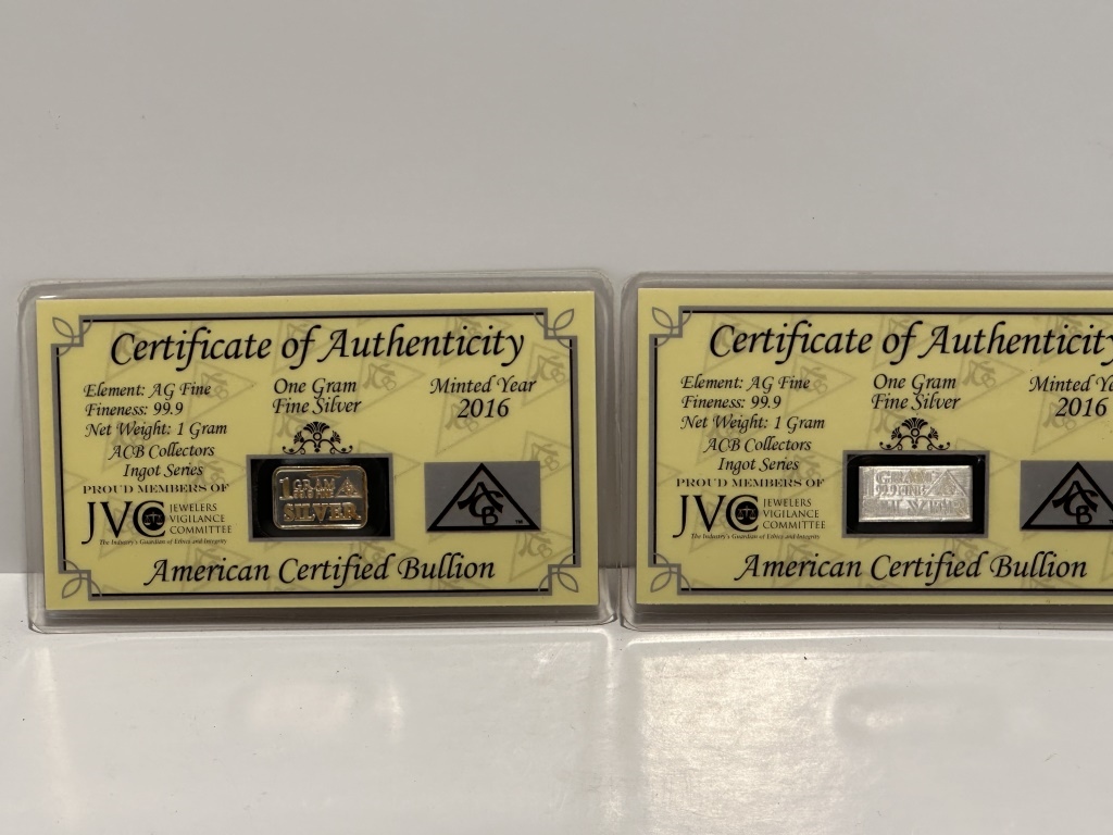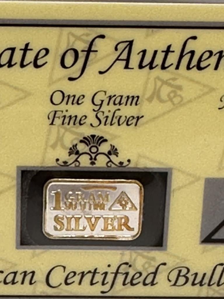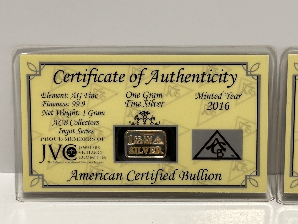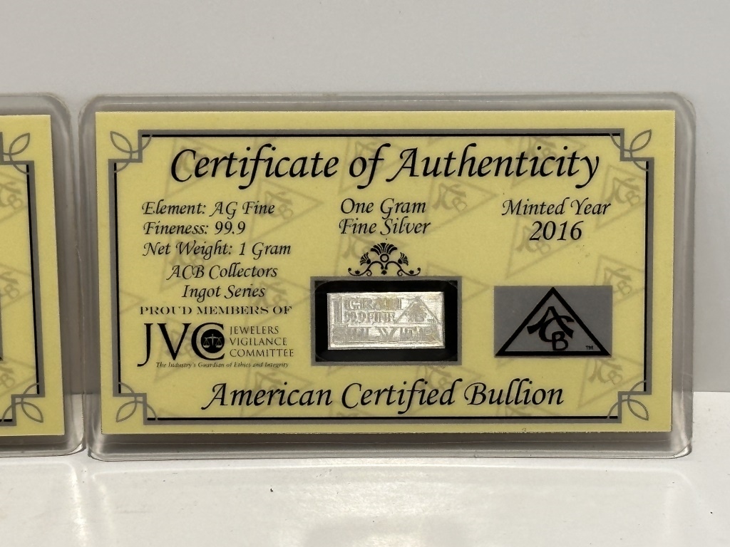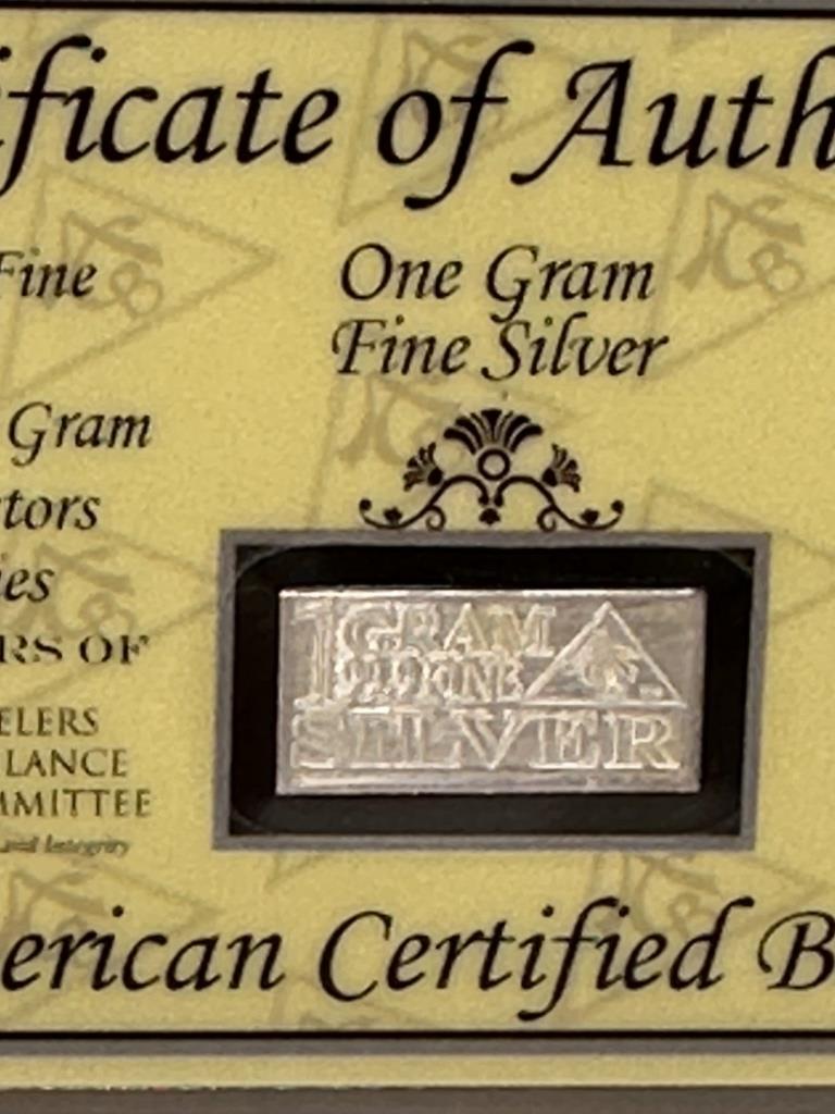 ONE GRAM SILVER WITH CERTIFICATE OF AUTHENTICITY AMERICAN CERTIFIED BULLION AG FINE 99.9 1 GRAIN ACB COLLECTORS INGOT SERIES