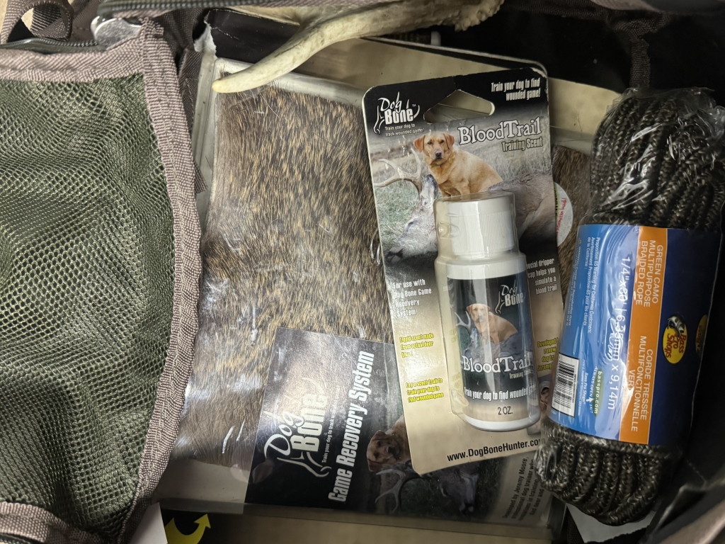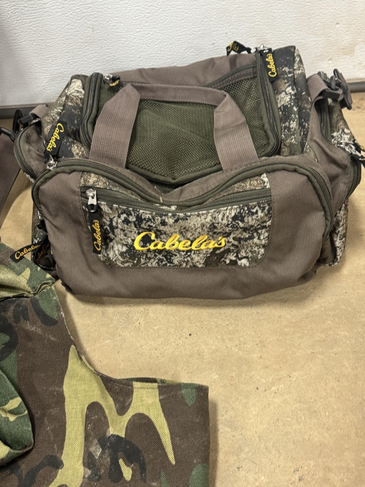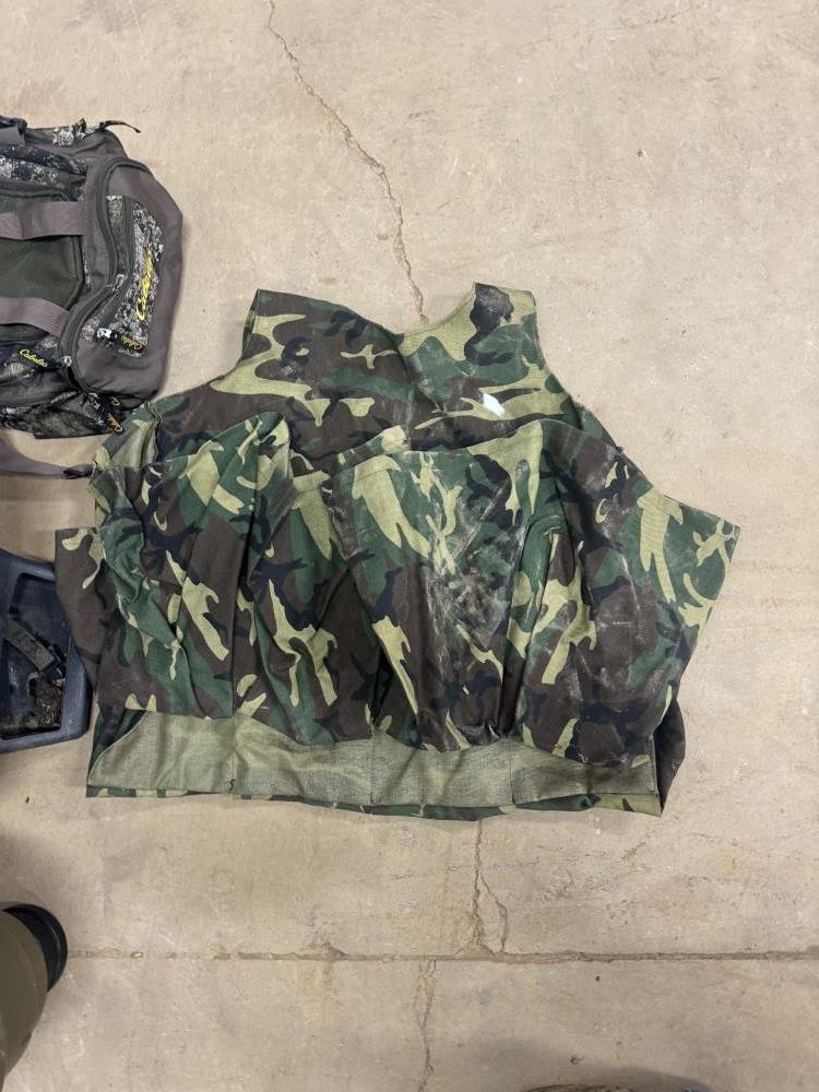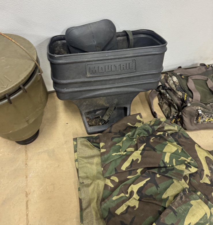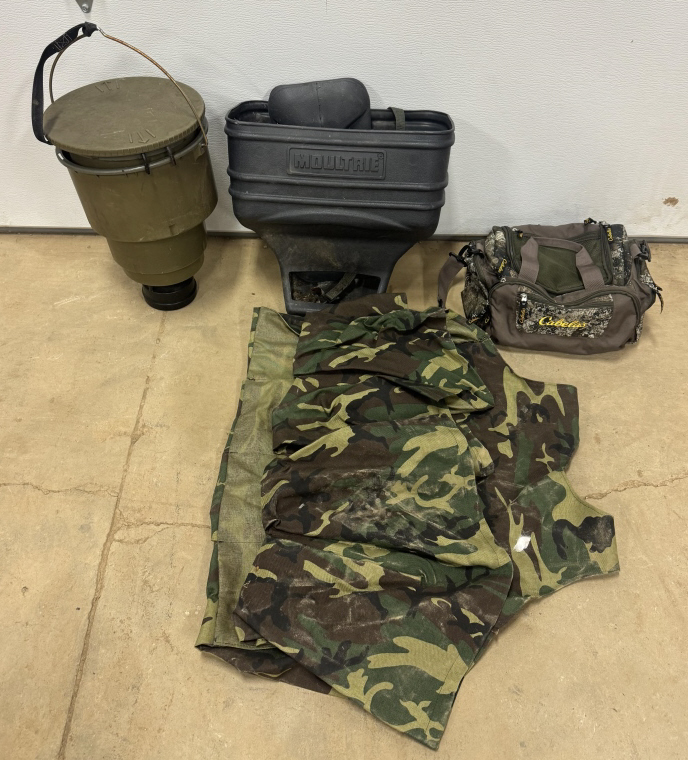 TWO DEER FEEDERS, HUNTING CLOTHING AND CABELLAS HUNTING BAG WITH ANTLER SCENT AND MORE!