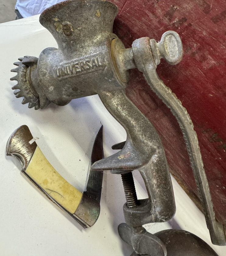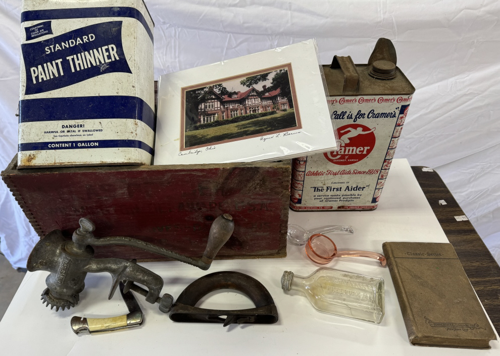 ADVERTISING BOX & TINS WITH MEAT GRINDERBOOKS AND GLASSWARE