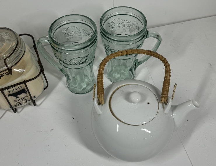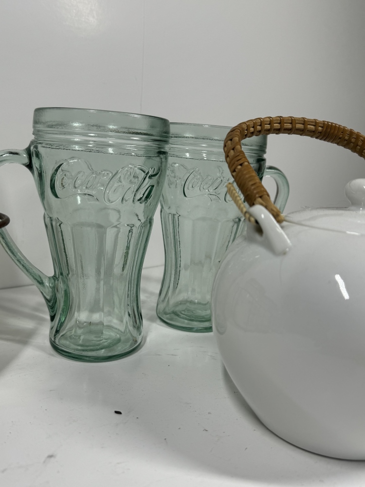 TWO CANDLES AND CANDLE HOLDER WITH THE TEA SET AND GLASS WARE