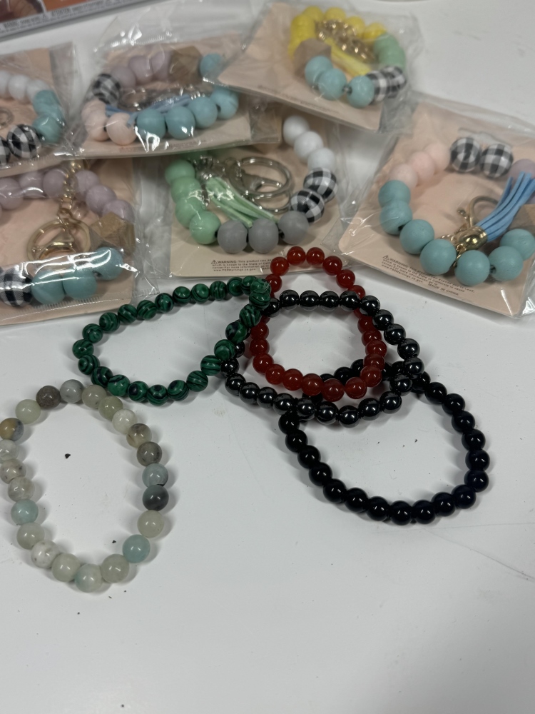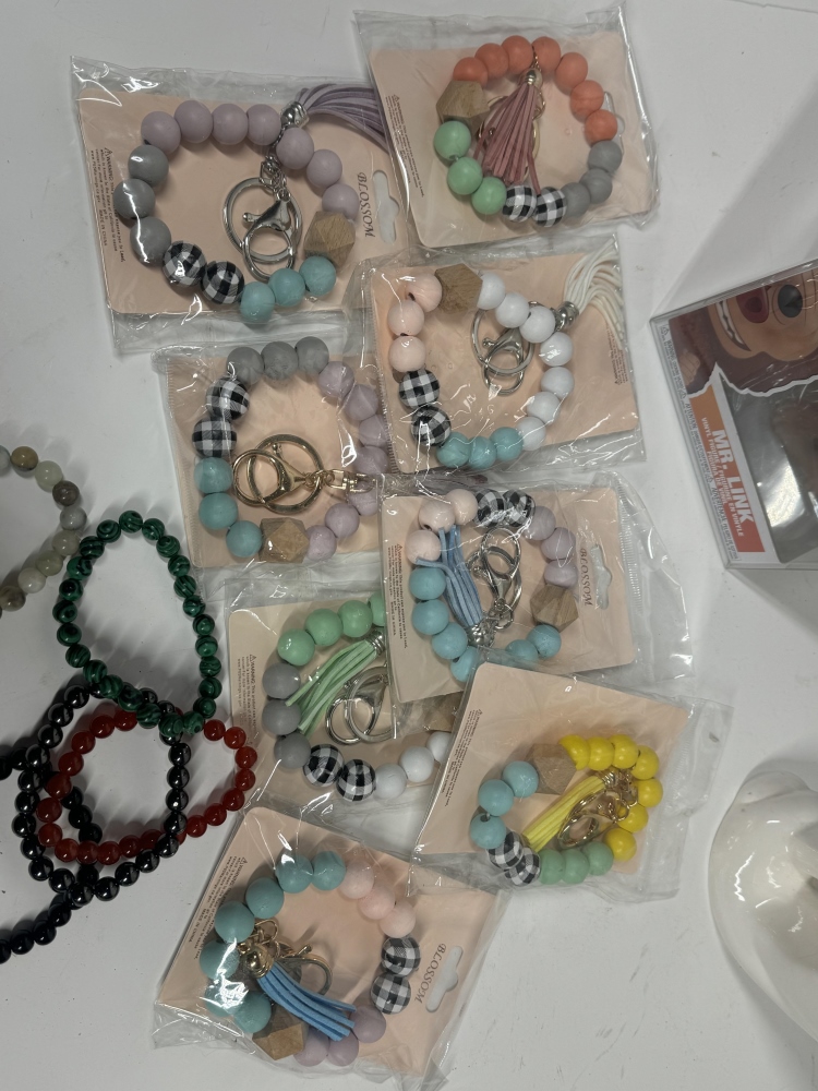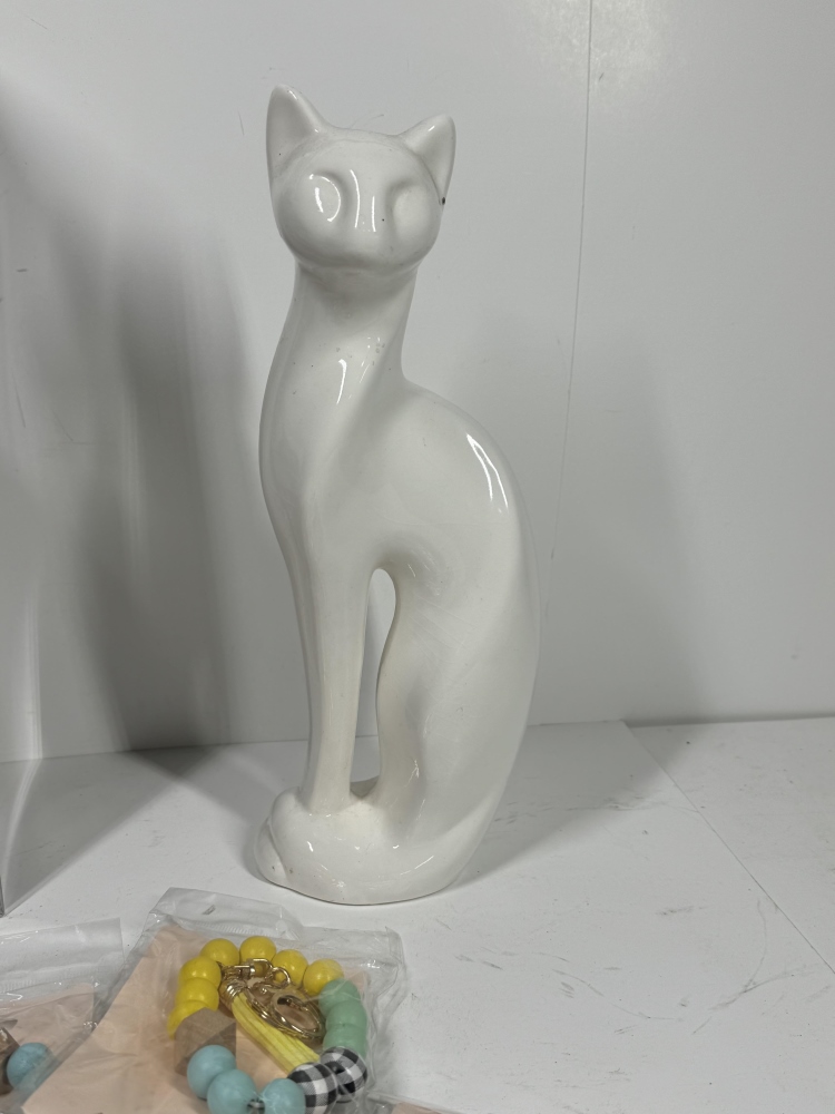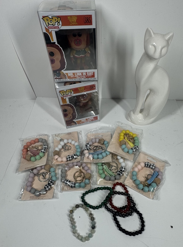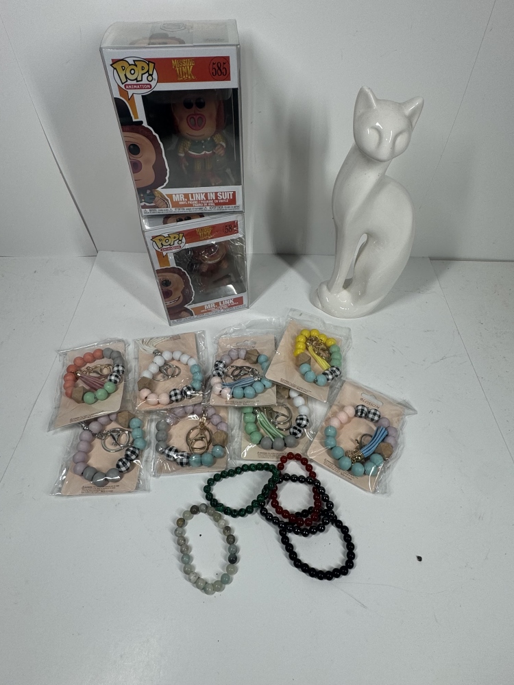 THIRTEEN NEW WRISTBANDS WITH TWO MR LINK TOYS & AMAZING CAT SCULPURE
