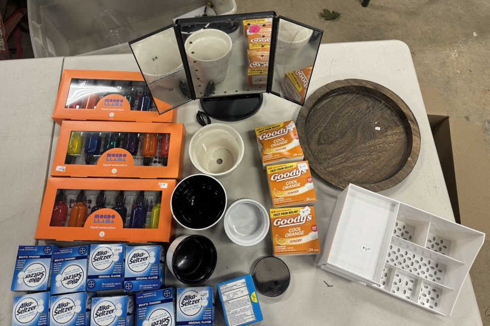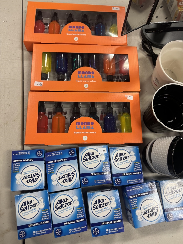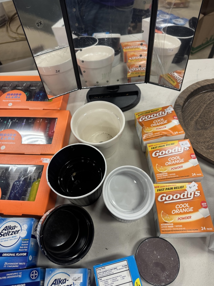 LIQUID COLOR SETS, ALKA SELTZERS, GOODS, MIRROR, PLASTIC ORGANIZOR & CUPS