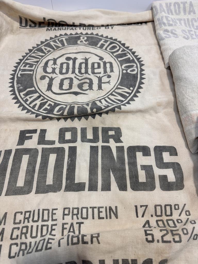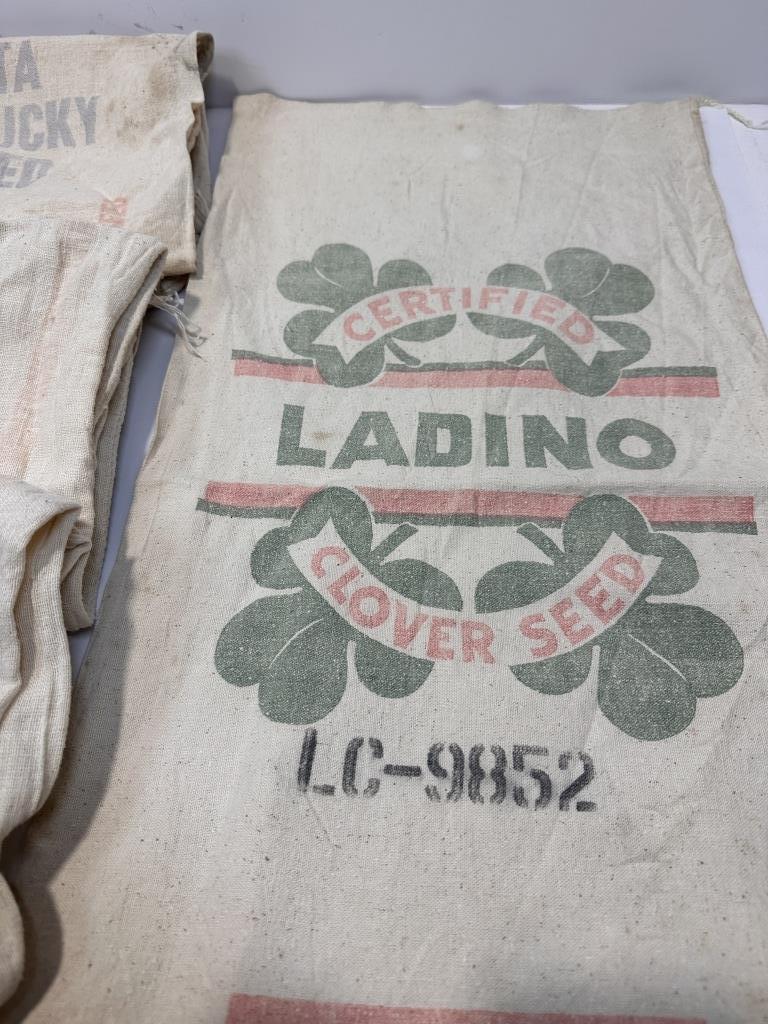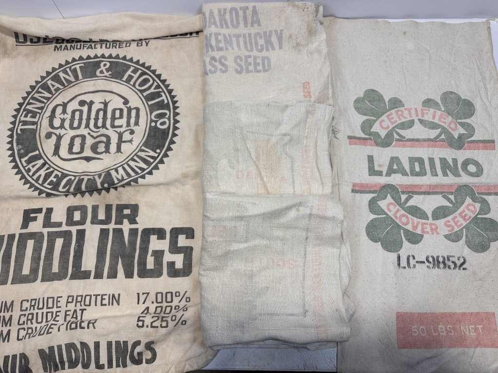 SOUTH DAKOTA CERITIFIED BLUEGRASS FEED SACK, LADINO CLOVER FEED SACK, FLOUR MIDDLINGS FEED SACK. TOTAL OF 5 SACKS