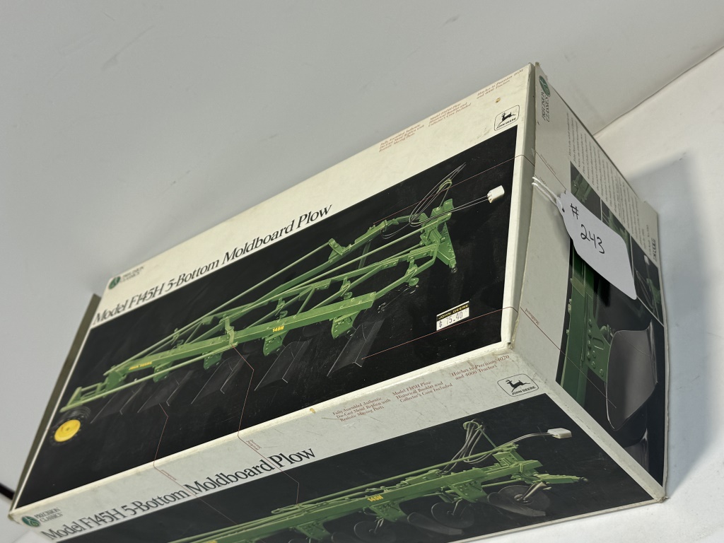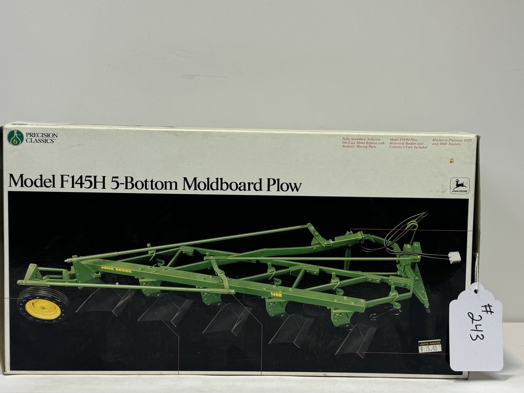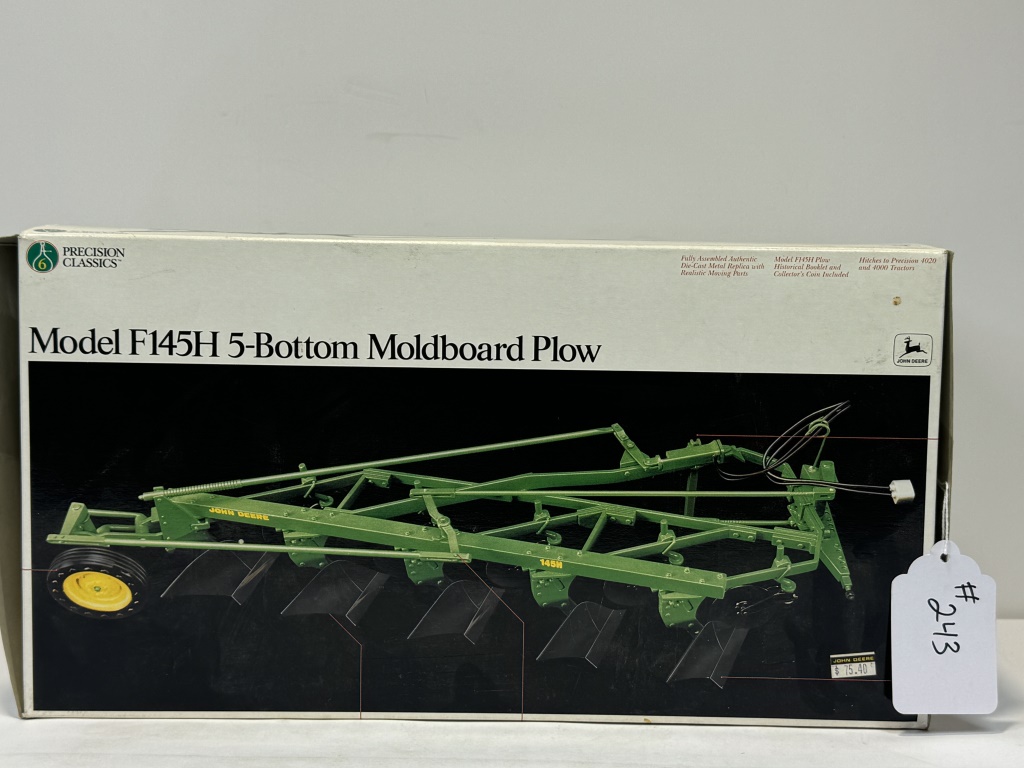 PRECISION CLASSICS ERTL JOHN DEERE MODEL F145H 5-BOTTOM MOLDBOARD PLOW 1/16 SCALE DIECAST METAL NIB INCLUDES MODEL F145H PLOW HISTORICAL BOOKLET AND COLLECTORS COIN