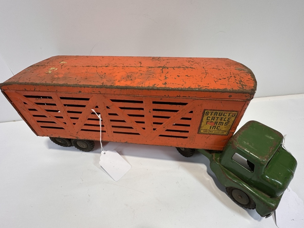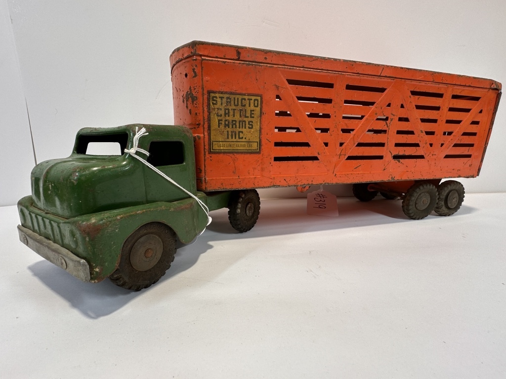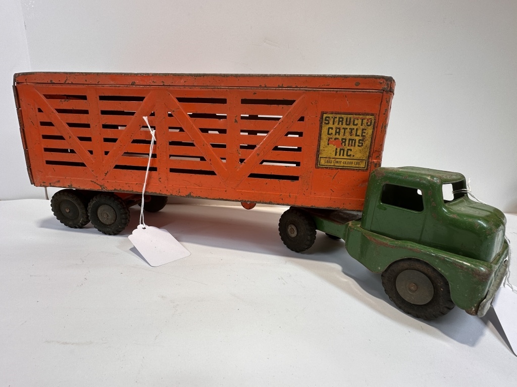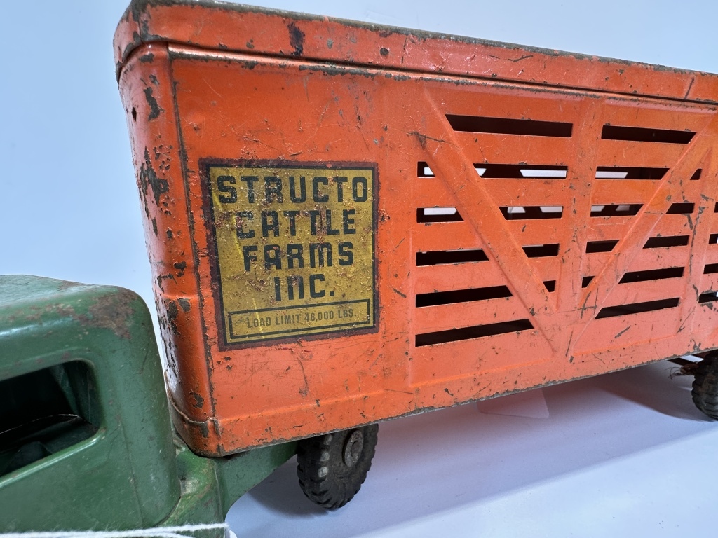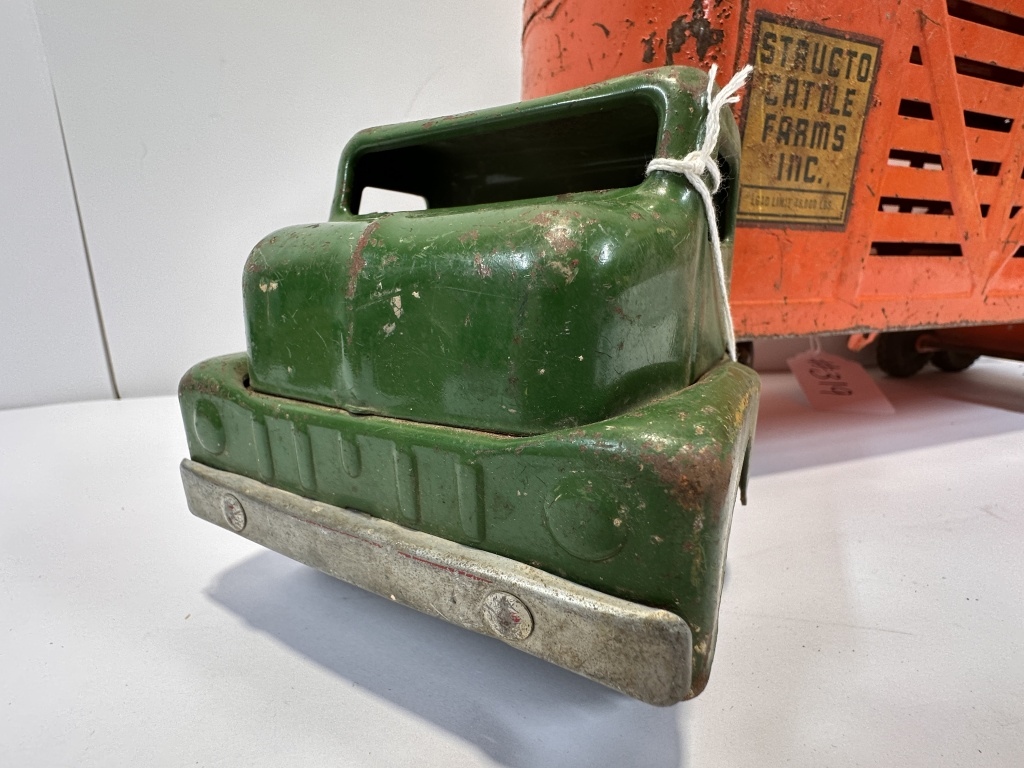 1960’S STRUCTO CATTLE FARMS INC. CATTLE TRAILER AND GREEN SEMI TRUCK 24″X7.5″