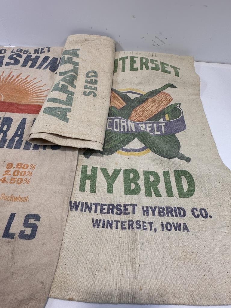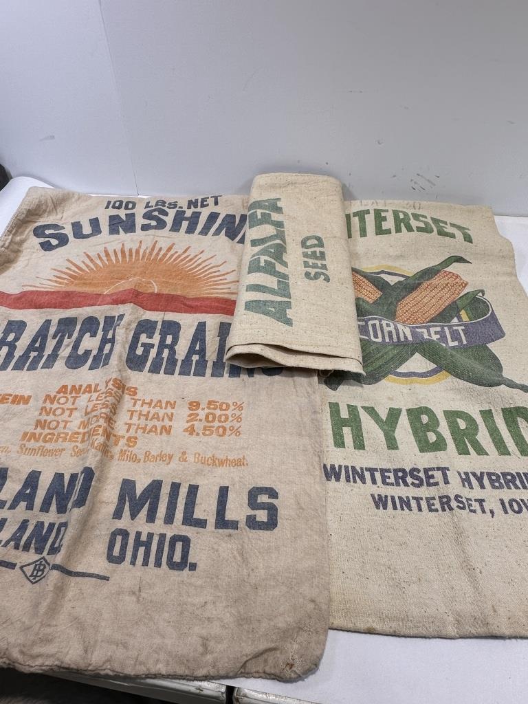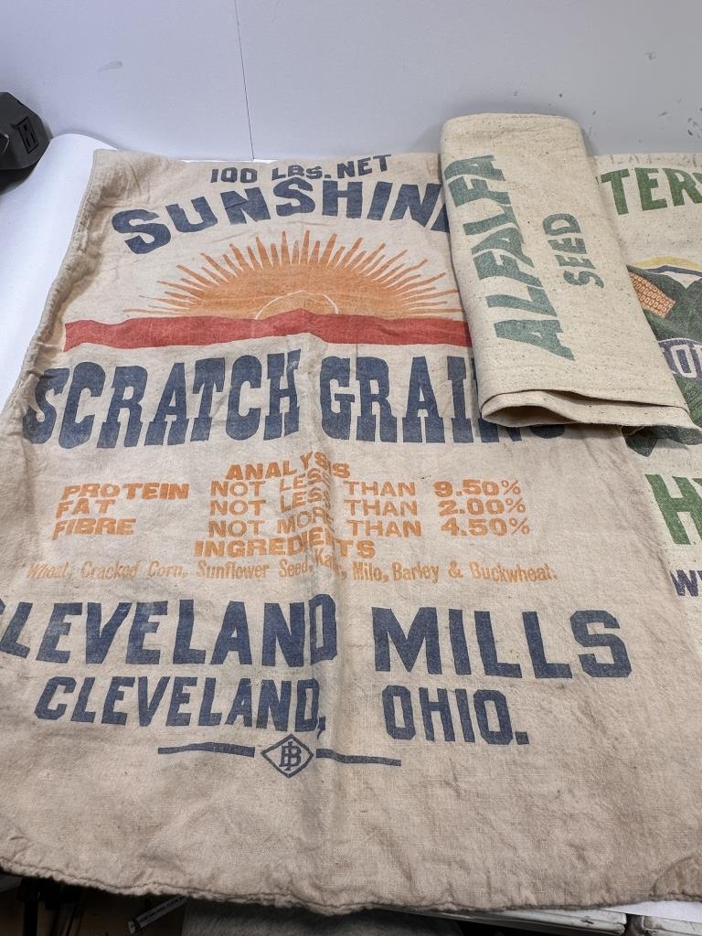 SUNSHINE SCRATCH GRAINS FROM THE CLEVELAND MILLS, WINERSET CORN BELT FROM WINTERSET IOWA, SARANAC ALFALFA SACK TOTAL 3 SACKS