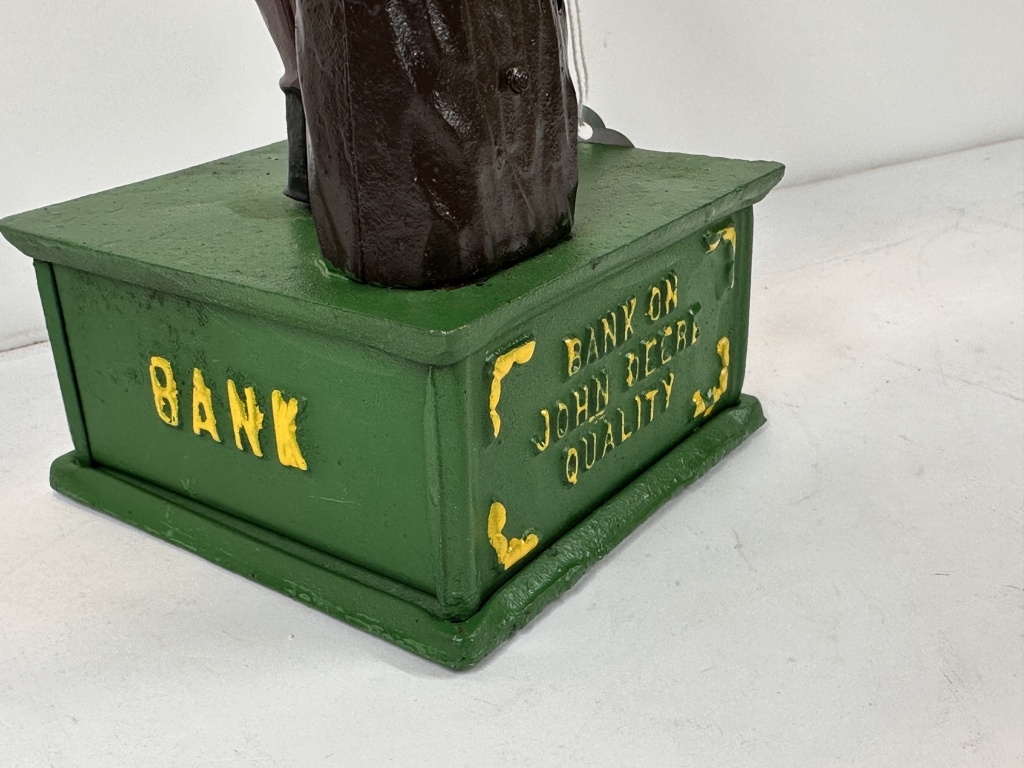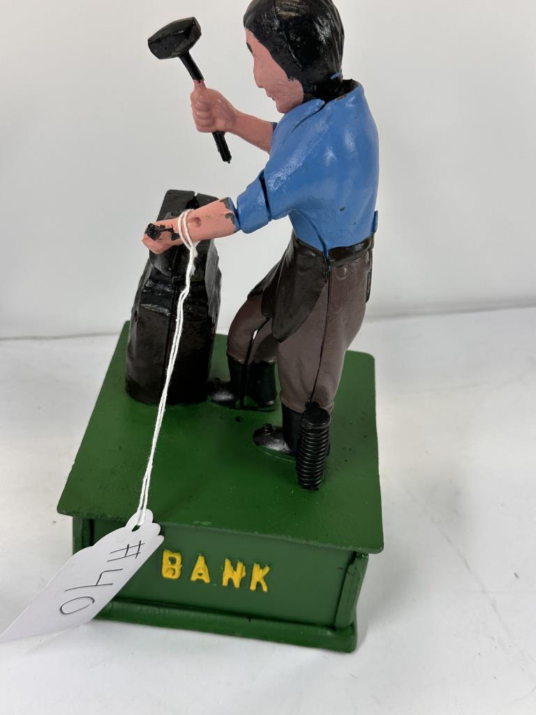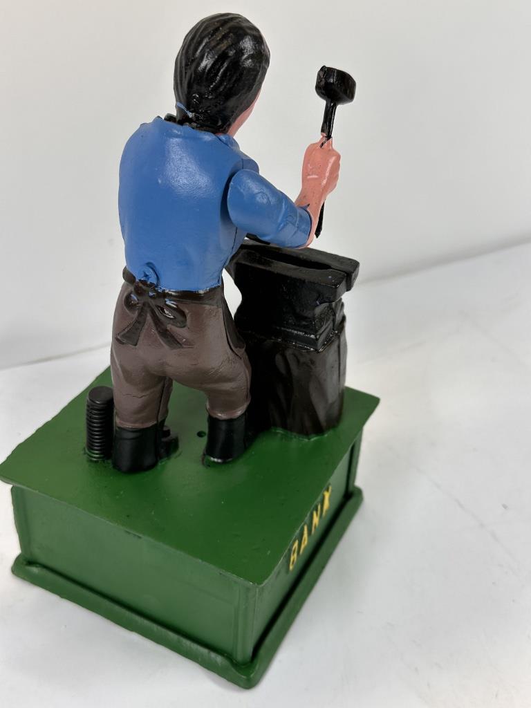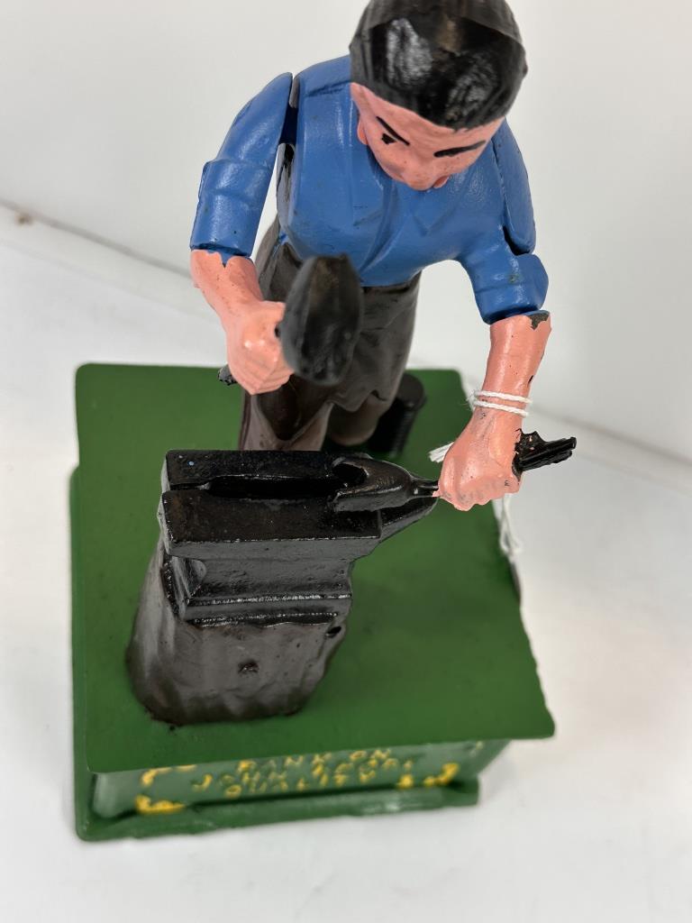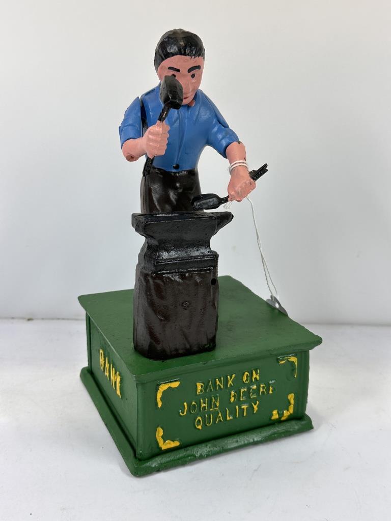 MAN STRIKES ANVIL TO INSERT COIN. BANK ON JOHN DEERE QUALITY CAST IRON MECHANICAL BLACKSMITH WITH ANVIL