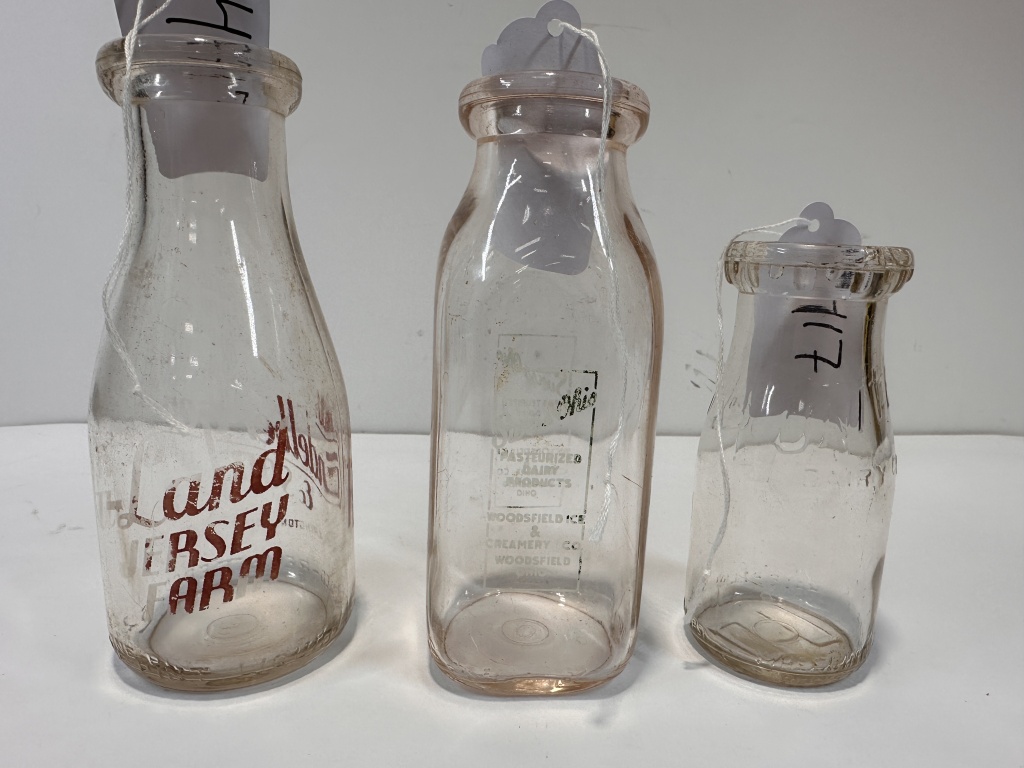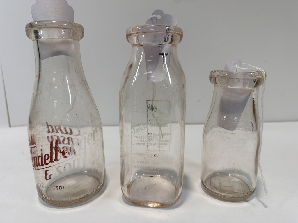 LOT OF THREE MILK BOTTLES FROM G.W. KINDELLERGER & SONS CLARINGTON, OHIO, SWISS OHIO PASTERIZED DAIRY PRODUCTS WOODSFIELD OHIO & UNITED DAIRY SMALLER BOTTLE