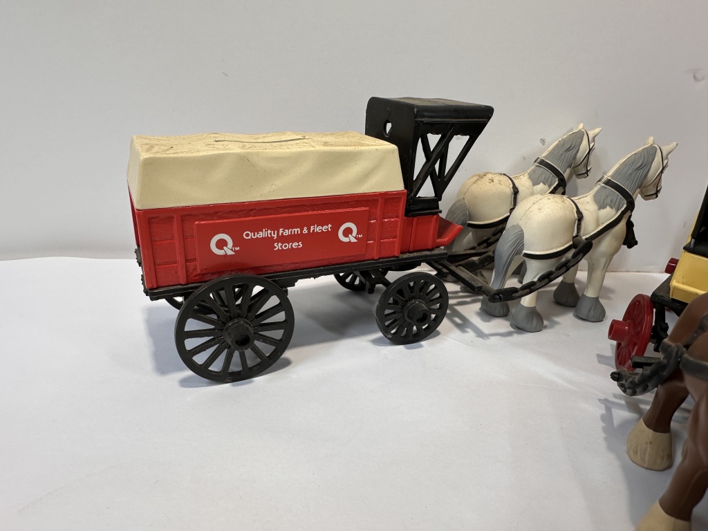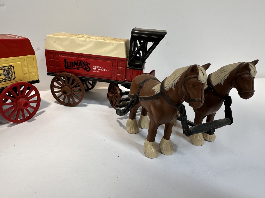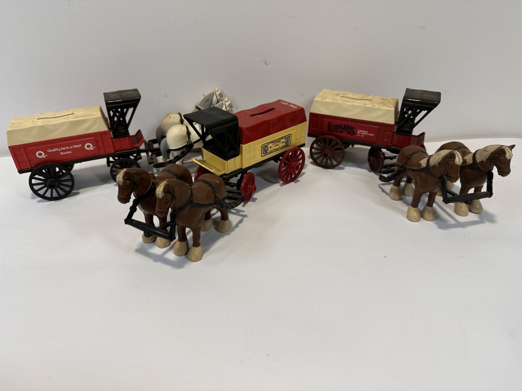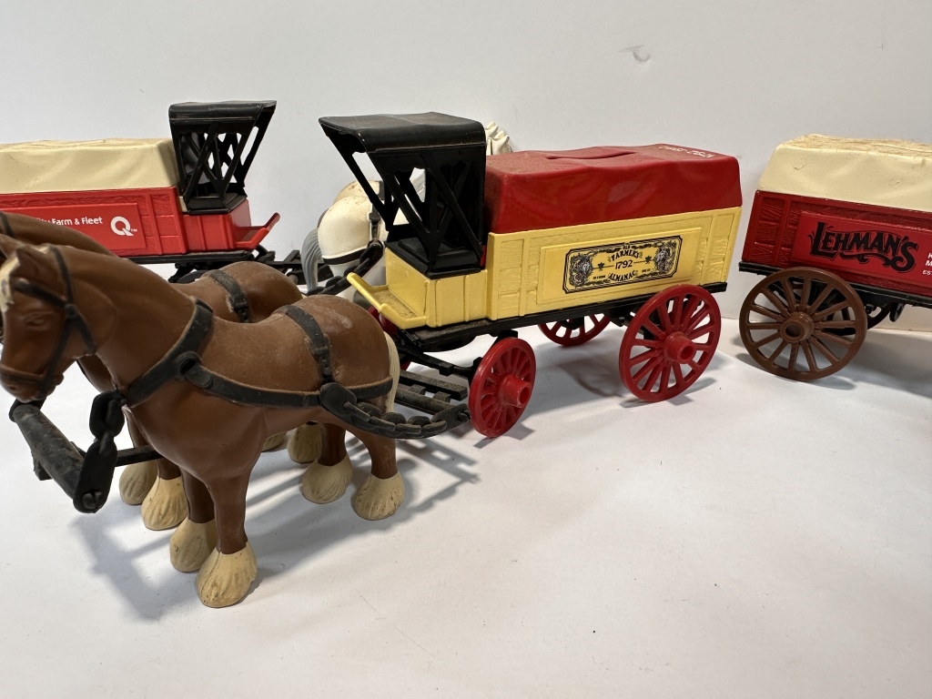 TOTAL OF THREE STATION WAGON COIN BANKS WITH ADVERTISING ON THEM. LEHMANS KIDRON/ MT HOPE OHIO, FARMERS ALAMANAC 1792, AUALITY FARM & FLEET STORES