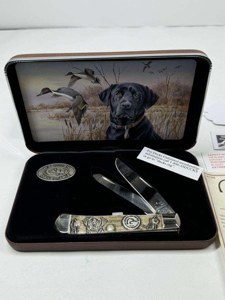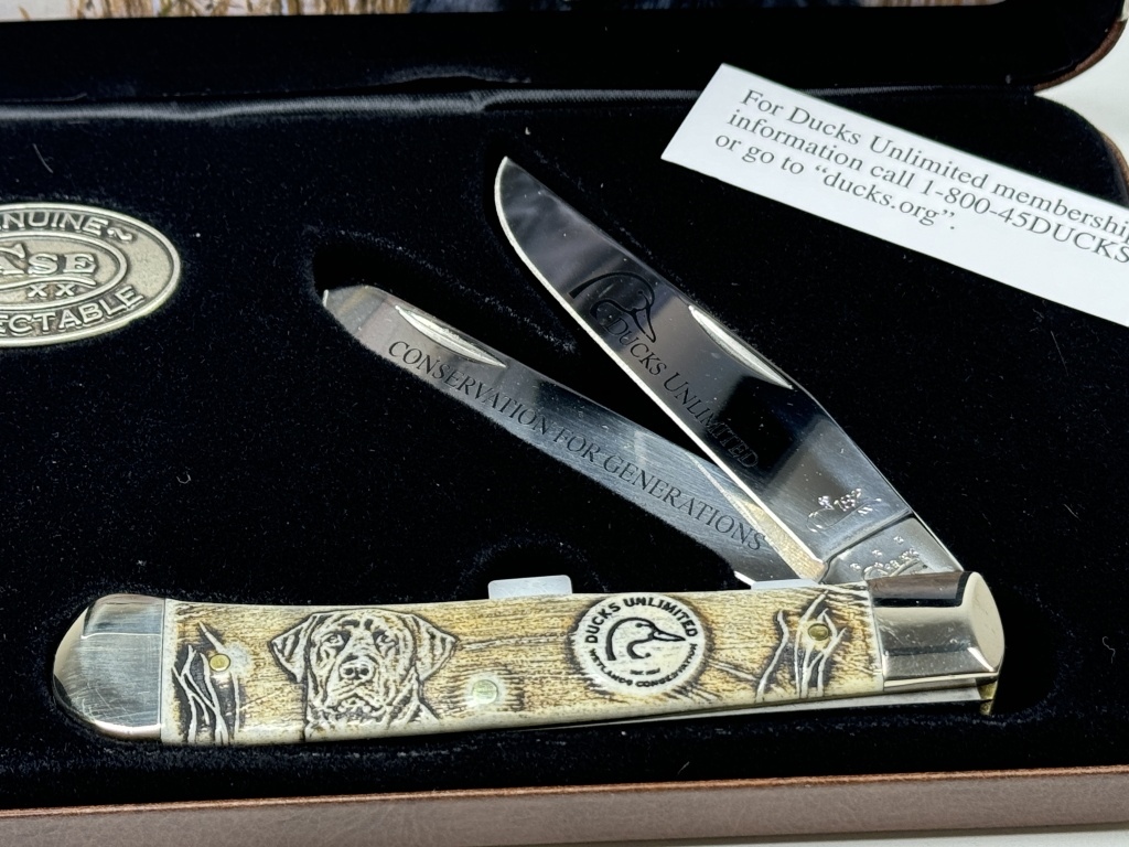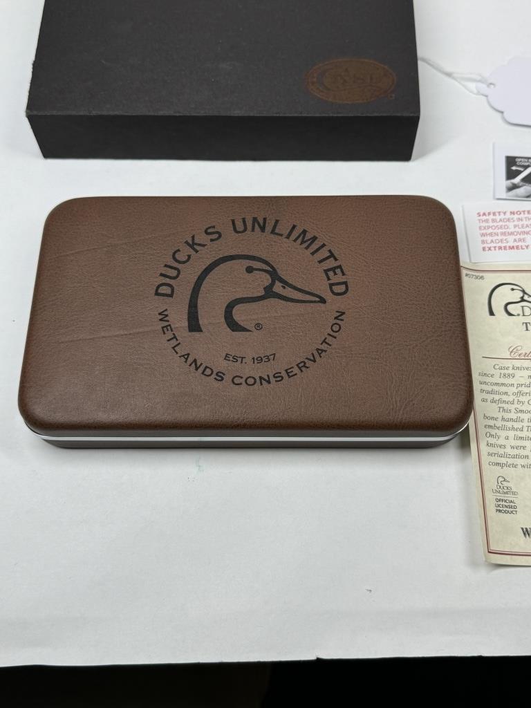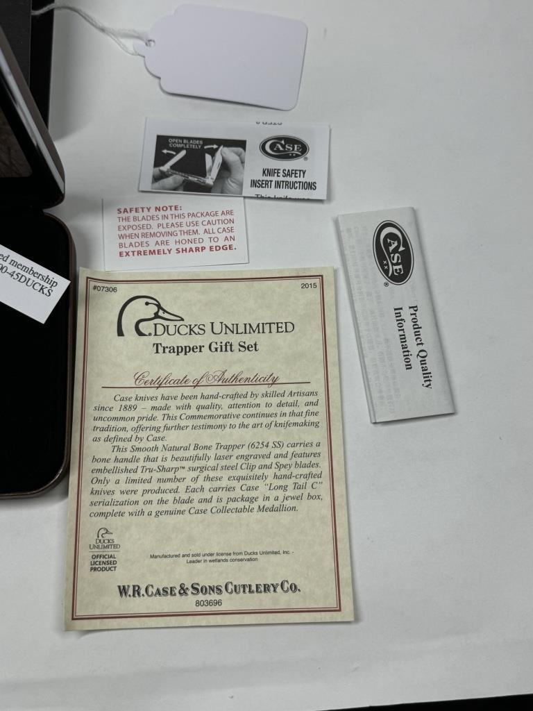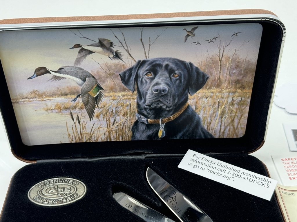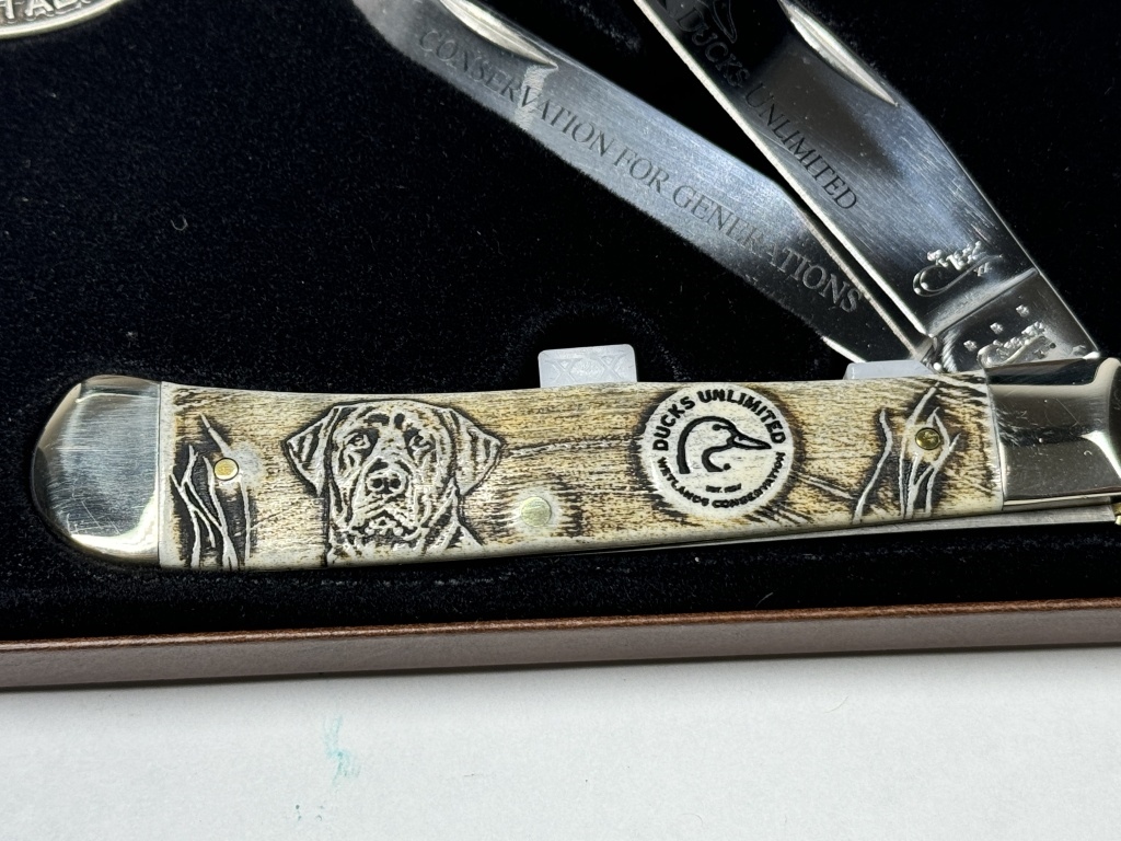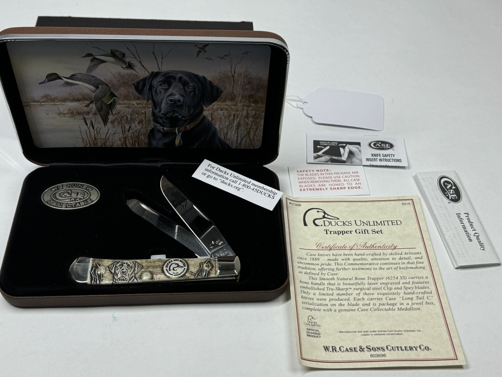CASE DUCK UNLIMITED WETLAND CONSERVATION KNIFETRAPPER GIFT SET #07306 2015 CERTIFICATE OF AUTHENTICITY HIGHLY DETAILED ON THE BLADE & SIDE OF KNIFE INCLUDES LEATHER BOX WITH DOG AND DUCK BACKROUND