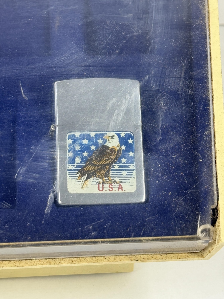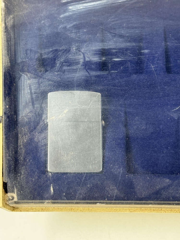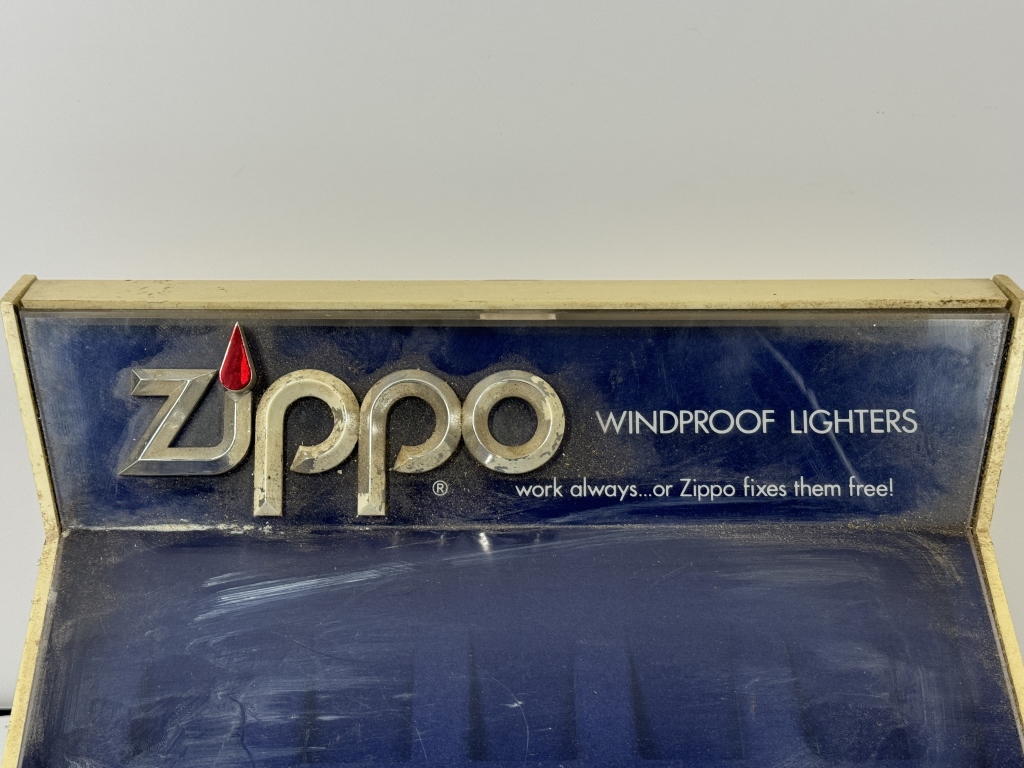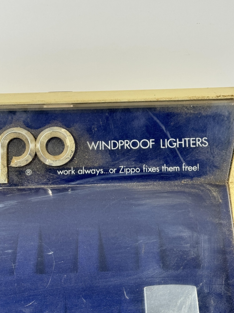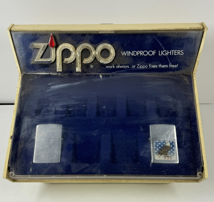 ZIPPO LIGHTER STORE SHOW CASE INCLUDES TWO LIGHTERS DISPLAY CASE SEEMS TO BE IN GOOD CODTION