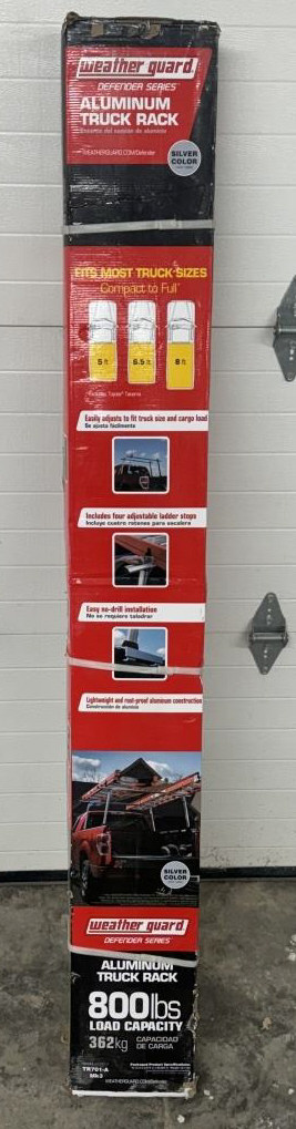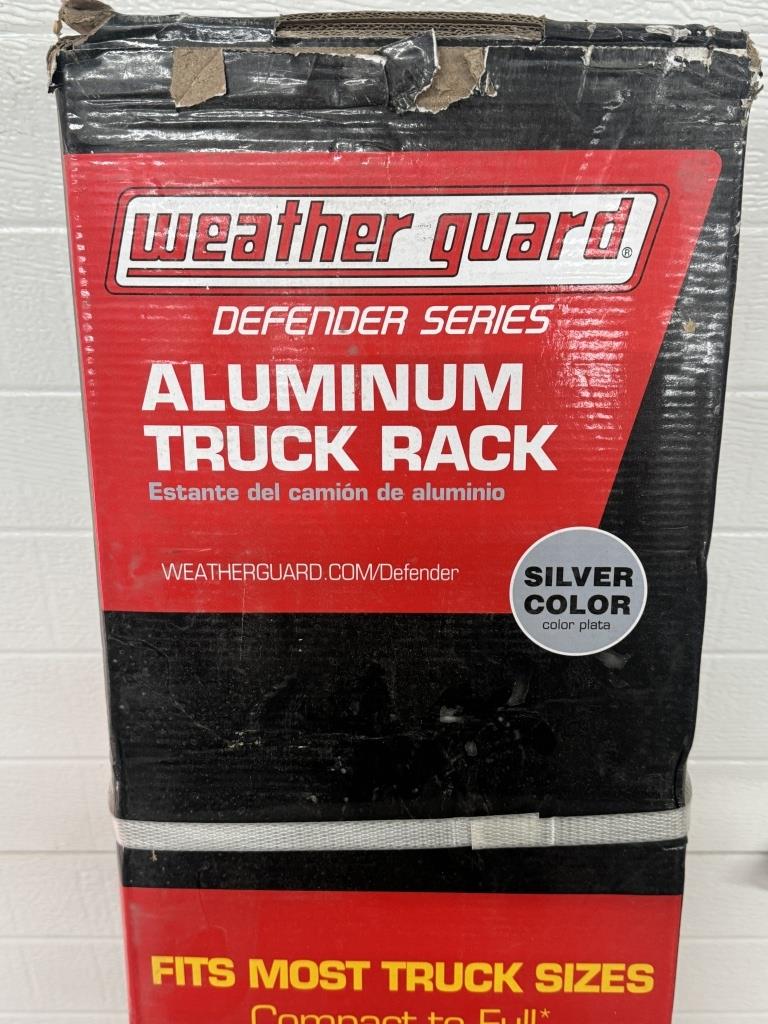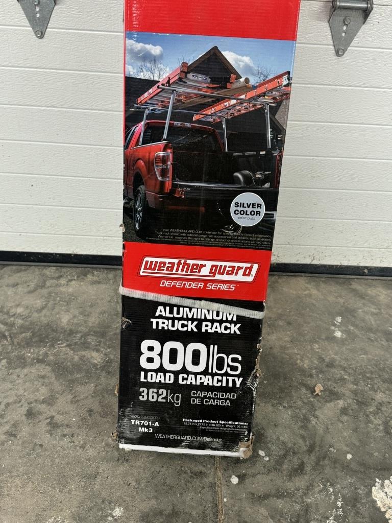 WEATHER GUARD ALUMINUM TRUCK RACK. INCLUDES 4 ADJUSTABLE LADDER STOPS, 800 LBS CAPACITY NEW IN BOX