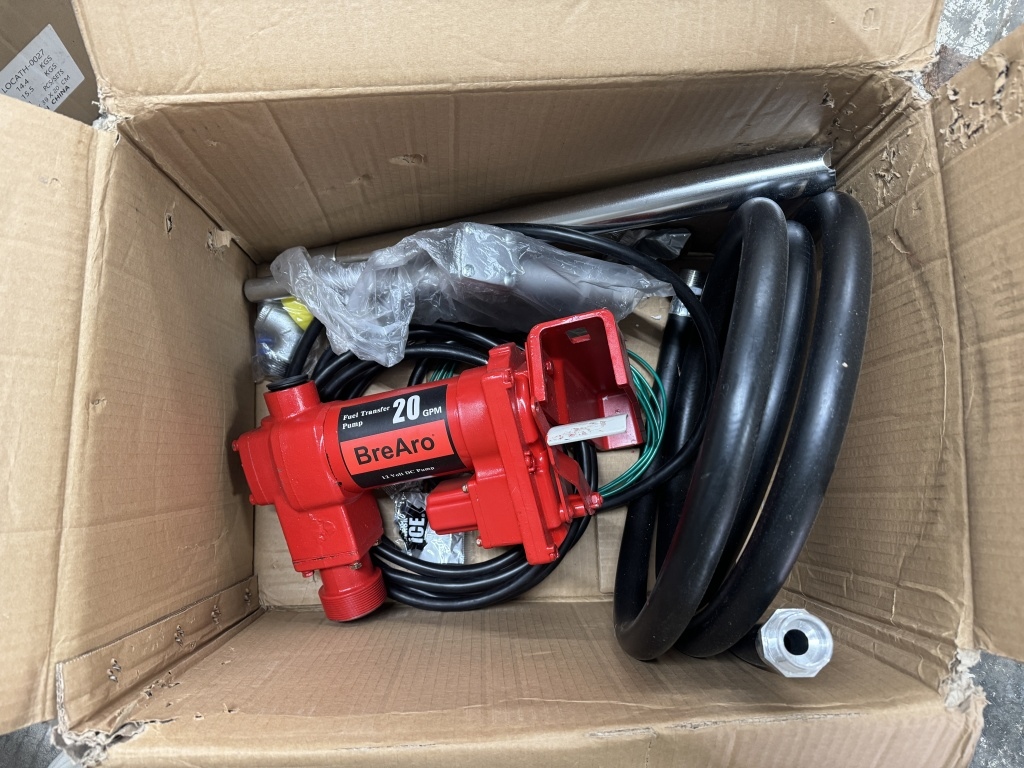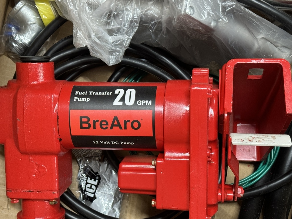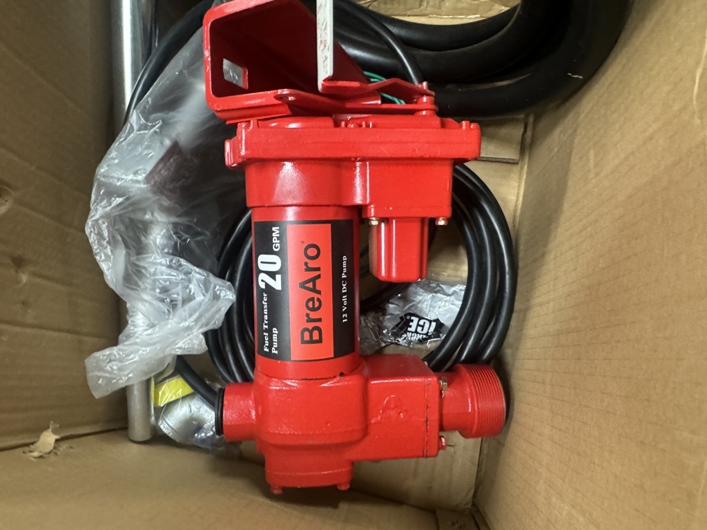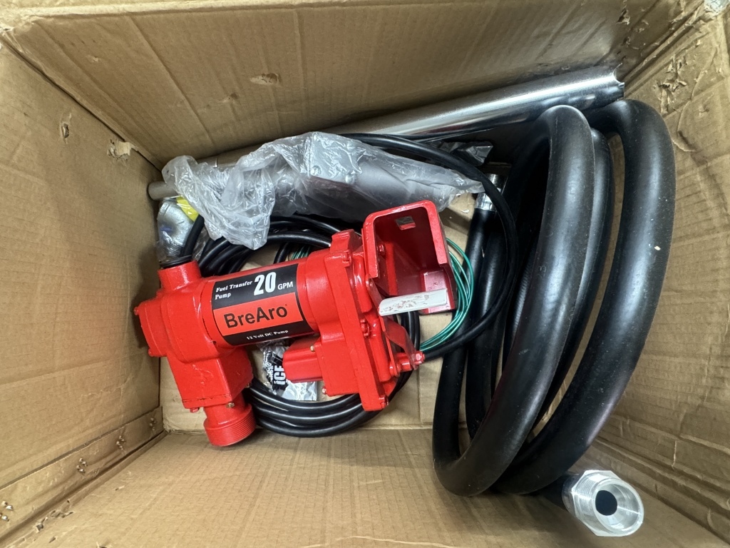 RED BREARO TRANSFER FUEL PUMP 20 GPM 12VOLT DC PUMP INCLUDES PUMP SUCTION TUB, HOSE, FUEL HANDLE, AND WIREING HOOK UP