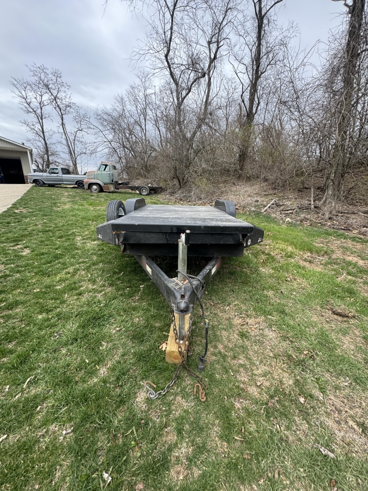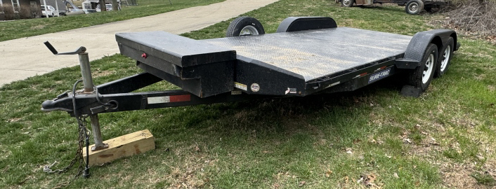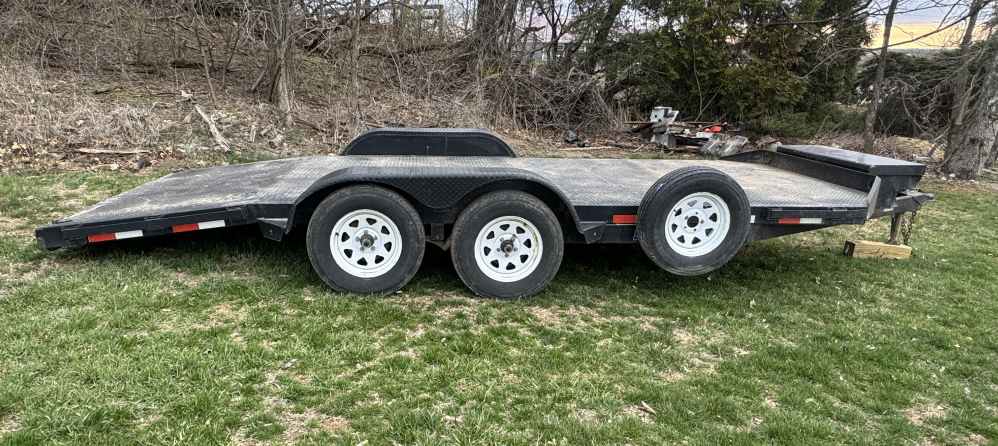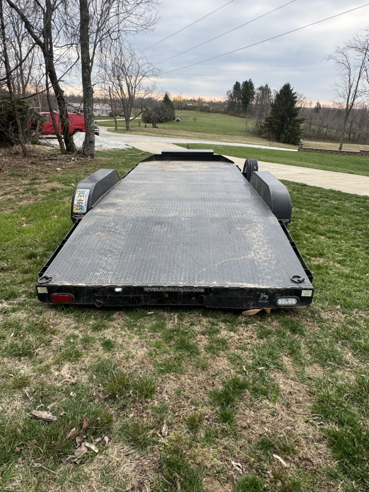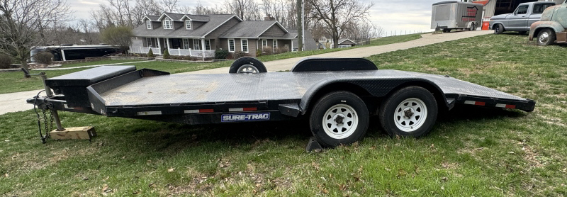 SURE-TRAC CAR TRAILER WITH RAMPS NEW TIRES ALL THE WAY AROUND WITH LESS THAN 500 MILES ON THEM, SPARE TIRE, TOOL BOX IN THE FRONT