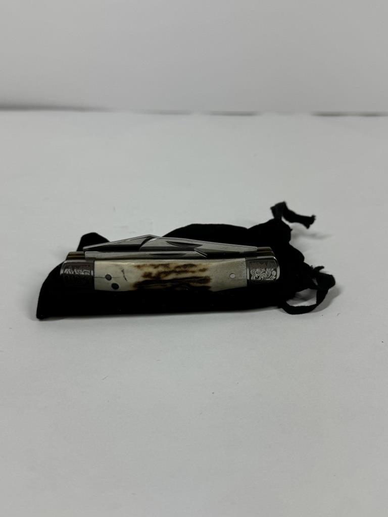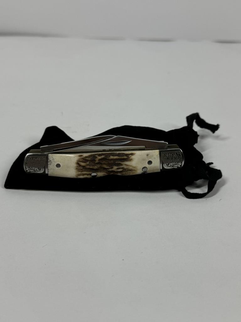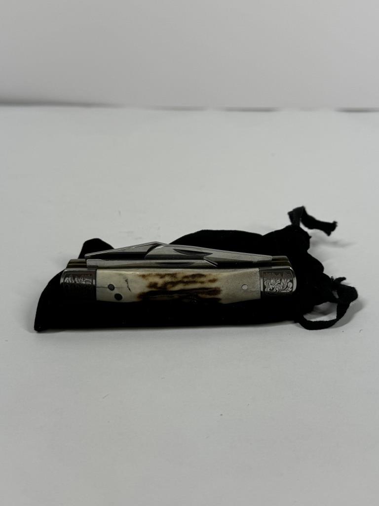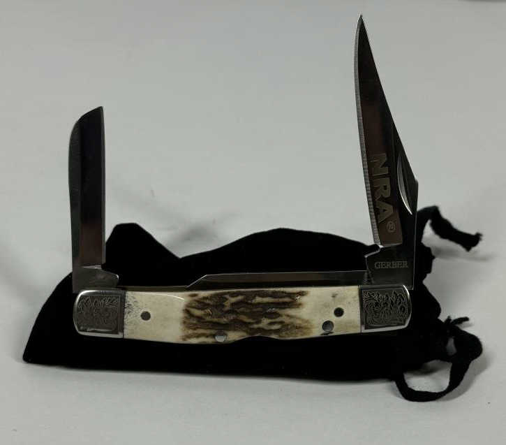 NRA GERBER KNIFE IN BOX AND CLOTH STAG STOCKMAN POCKET KNIFE, TRIPLE BLADE HIGHLY DETIALED MODEL #01036