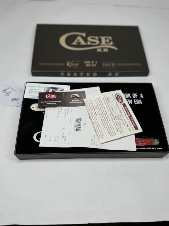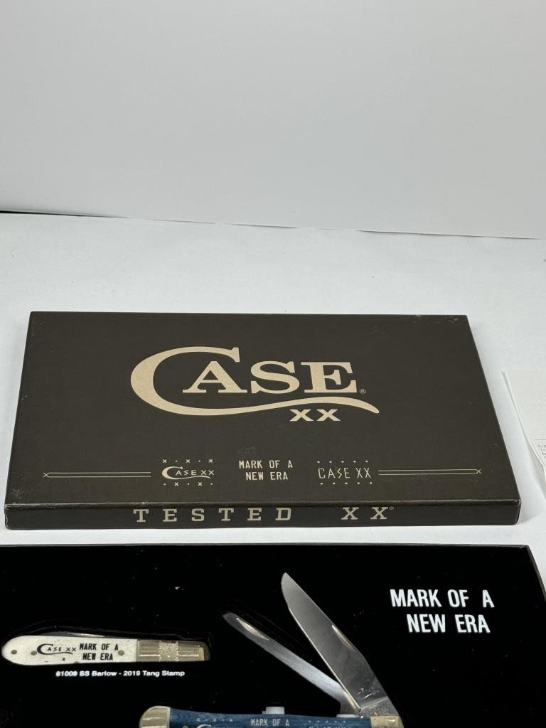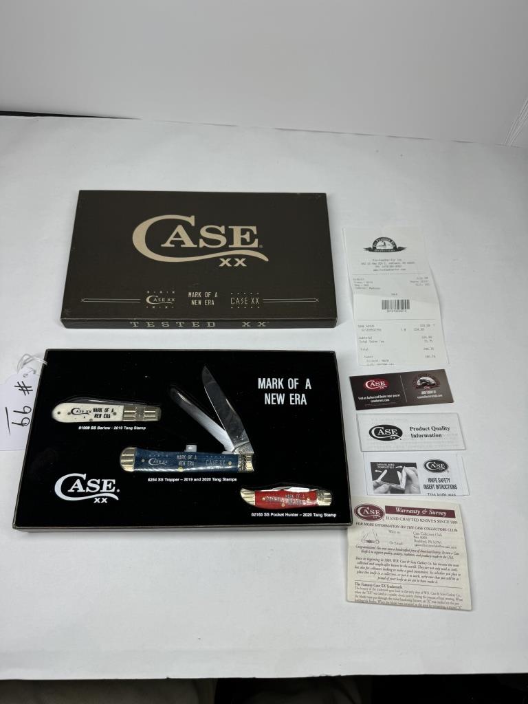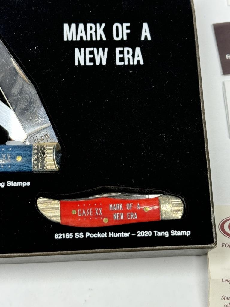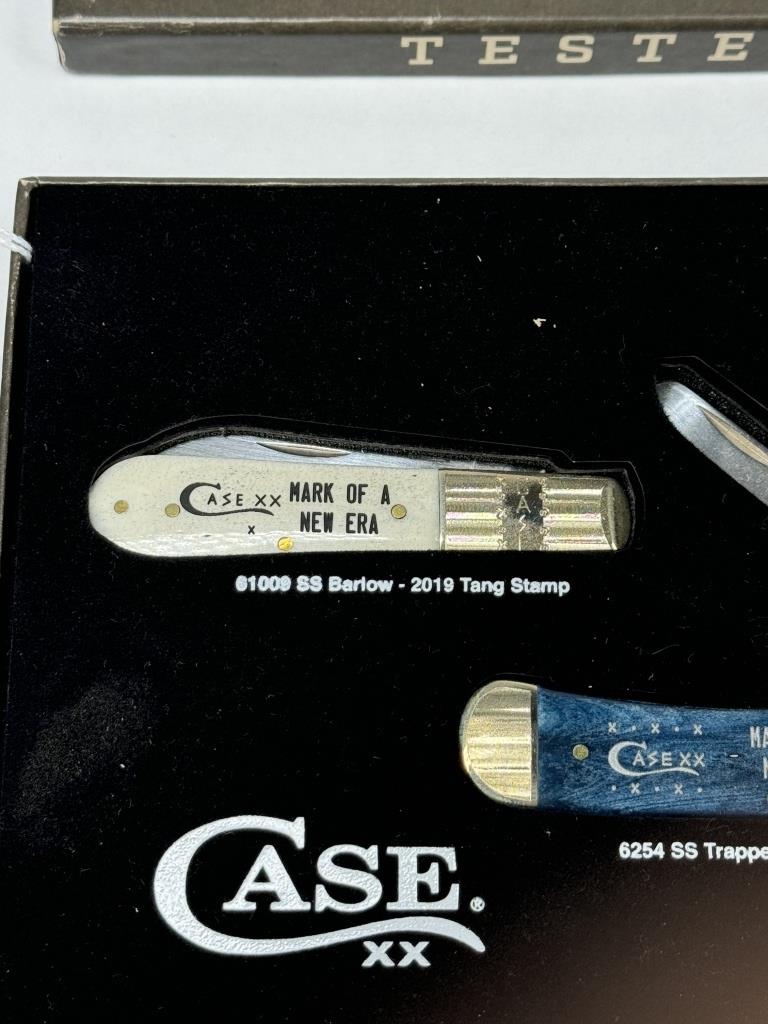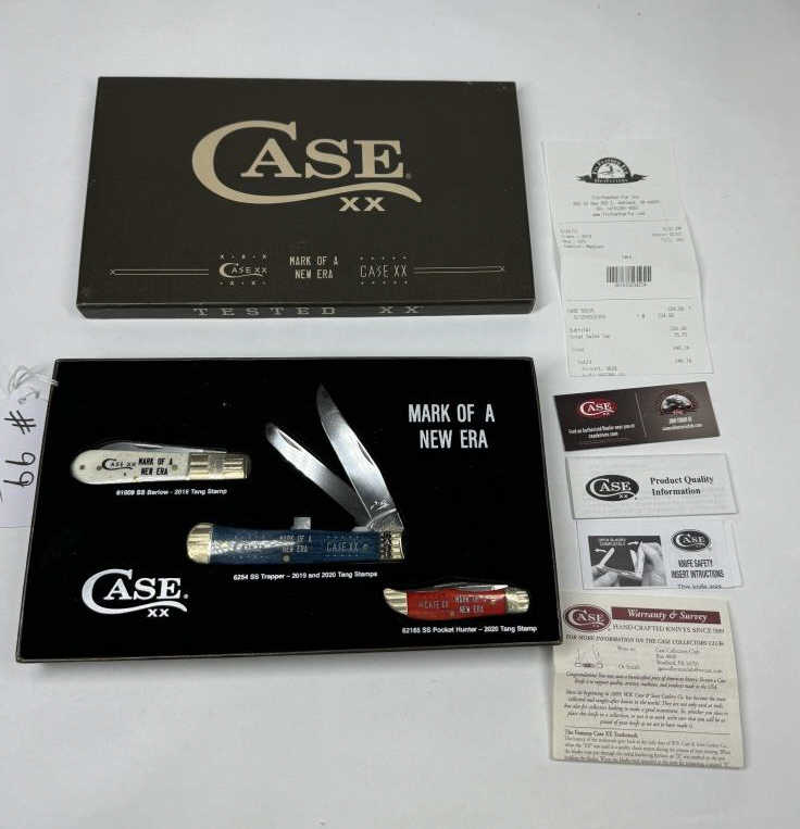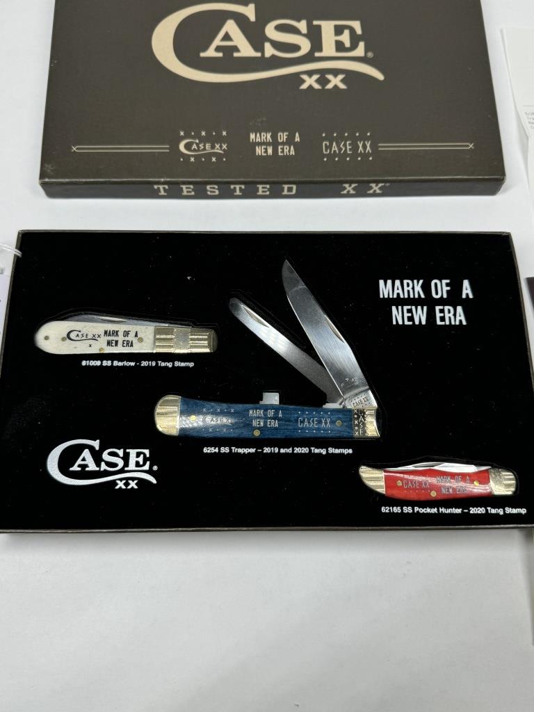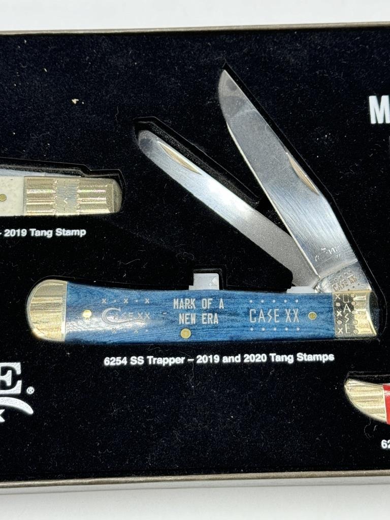 SET OF THREE CASE KNIVES TESTED XX “MARK OF A NEW ERA” WHITE-61008 SS BARLOW- 2019 TANG STAMP BLUE-6254 SS TRAPPER- 2019 & 2020 TANG STAMPS RED-62165 SS POCKET HUNTER – 2020 TANG STAMP