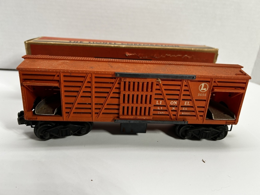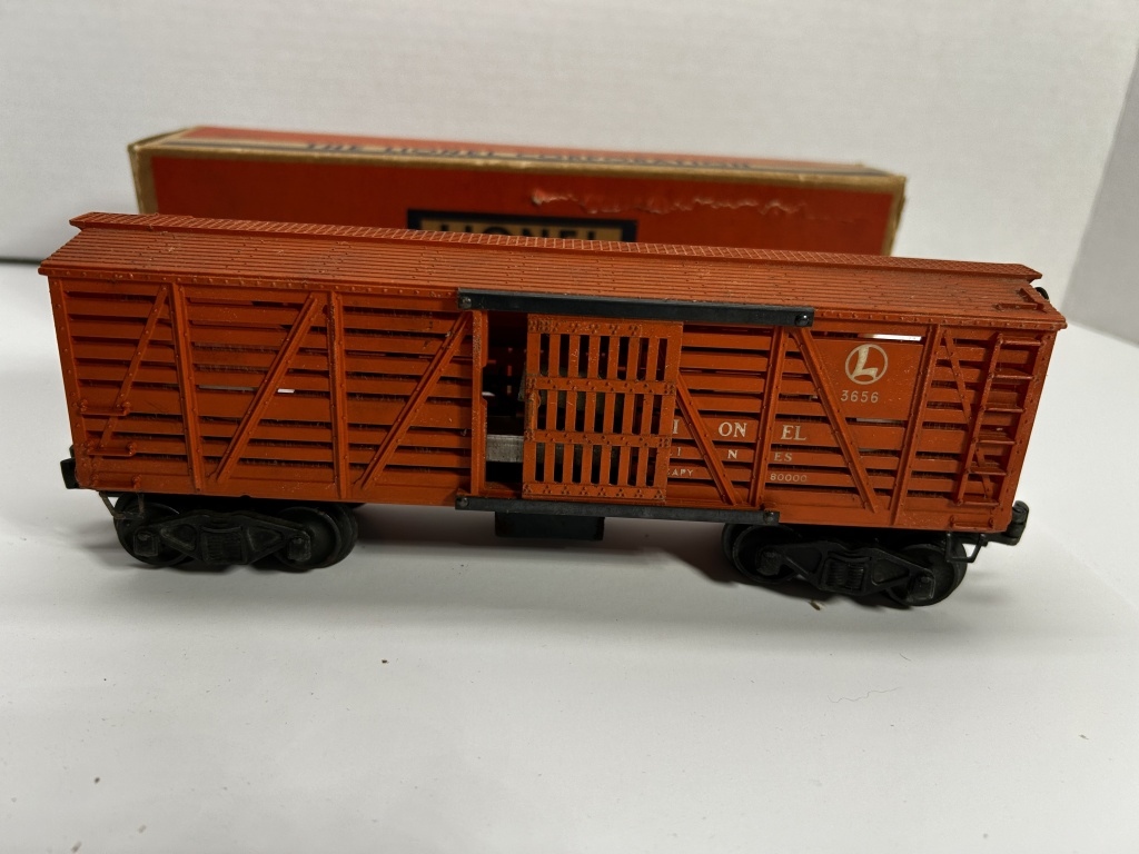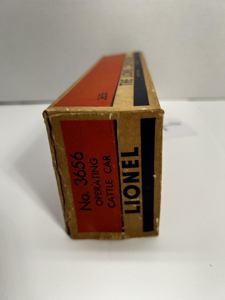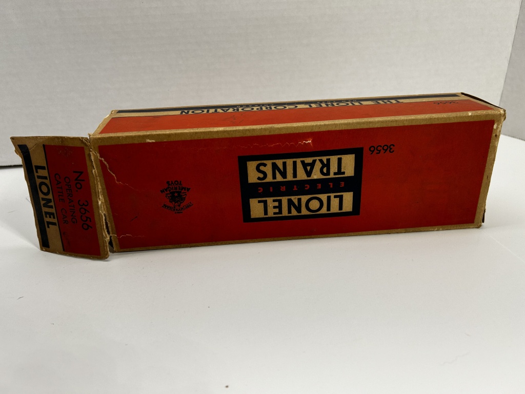 LIONEL ELECTRIC TRAINS 3656 CATTLE CAR IN BOX. BOX HAS SOME WEAR AS SHOWN