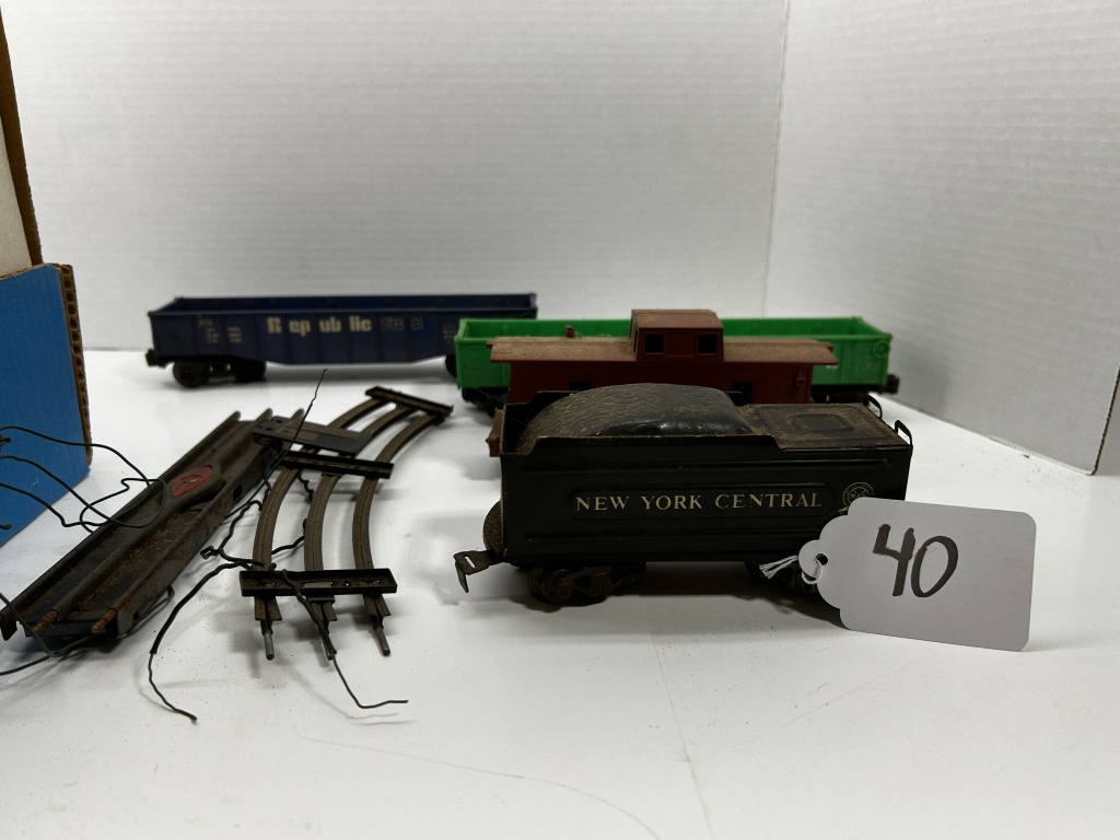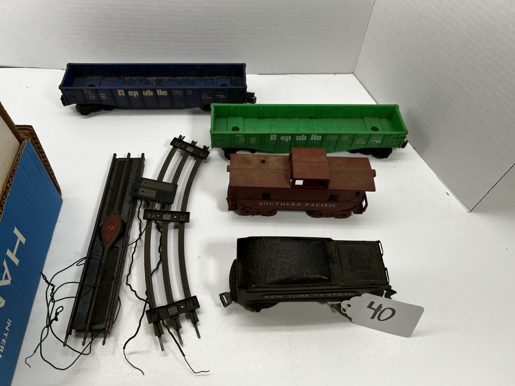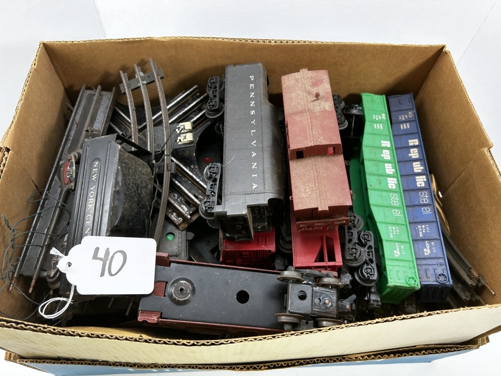 LOT OF VARIOUS TRAIN CARS, TRACKS AND MORE