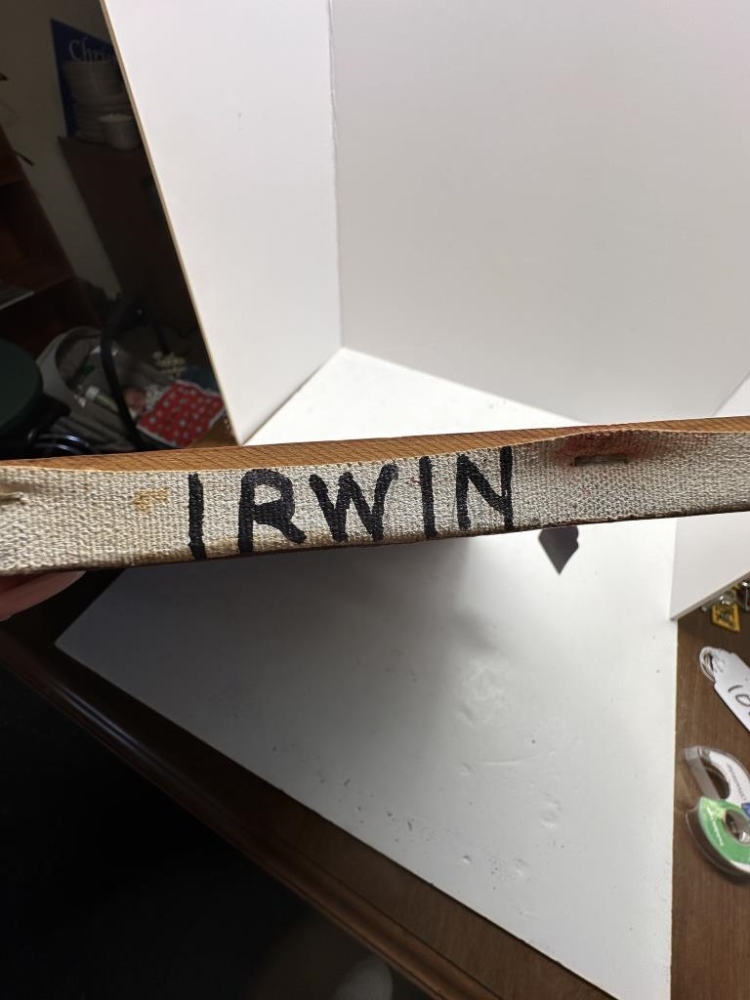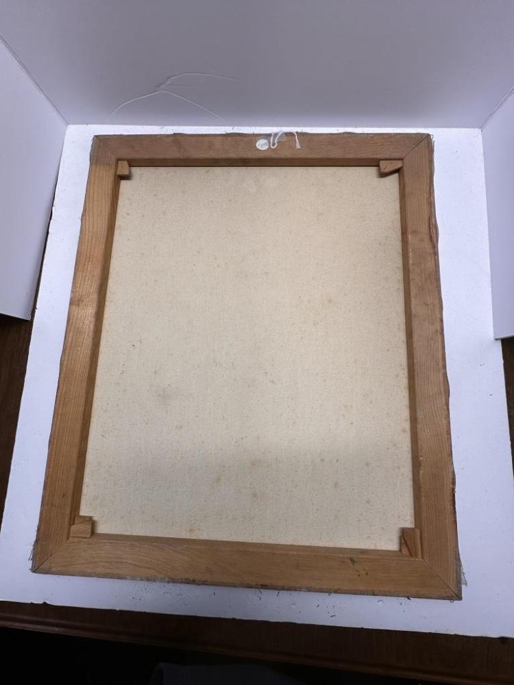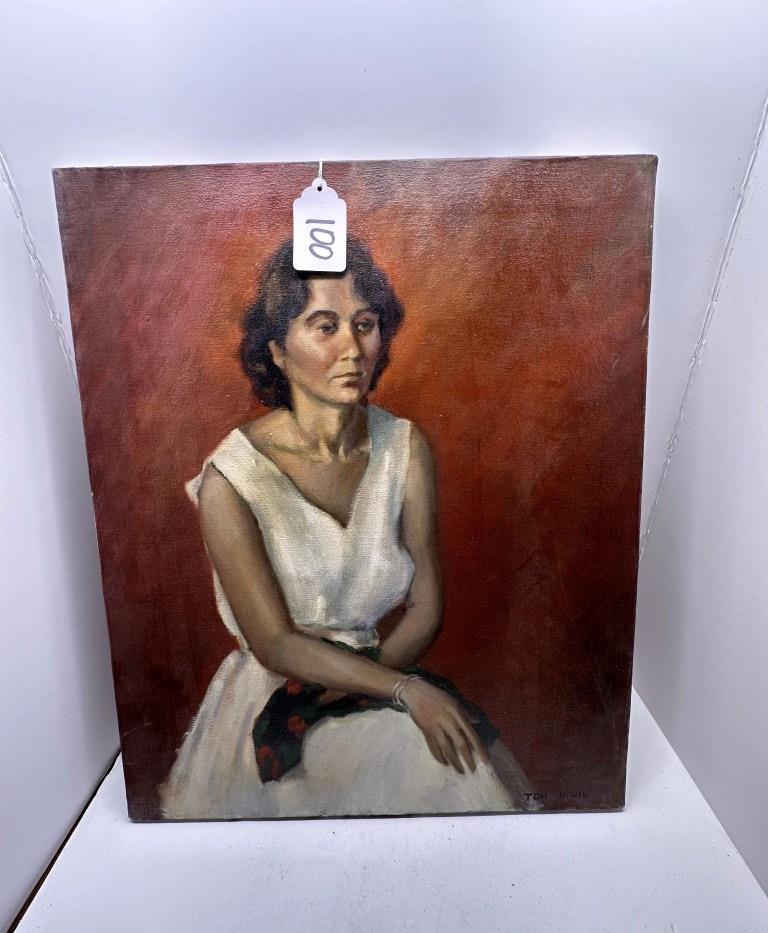 PAINTING ON CANVAS OF WOMAN IN A WHITE DRESS, “IRWIN” WRITTEN ON THE EDGE (ARTIST)