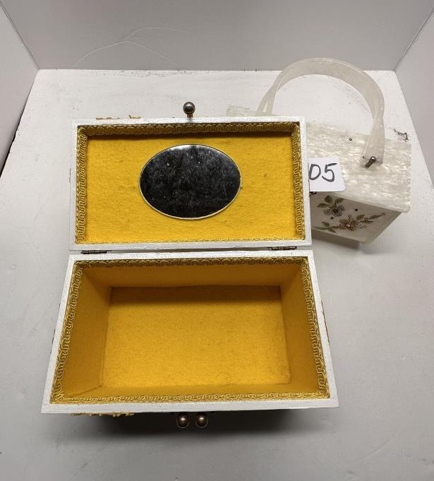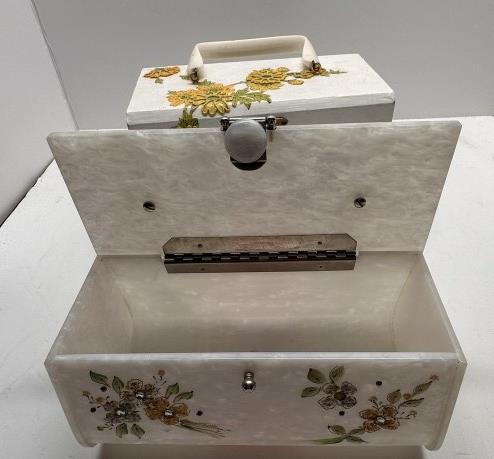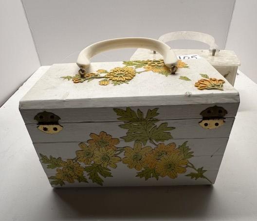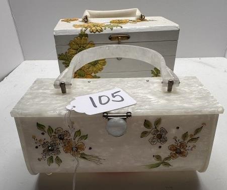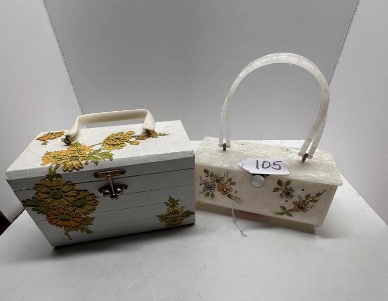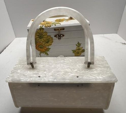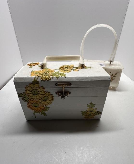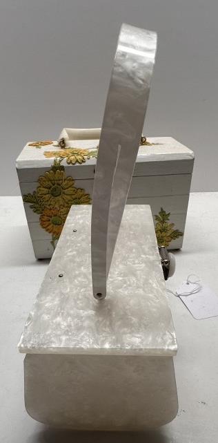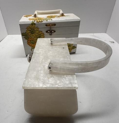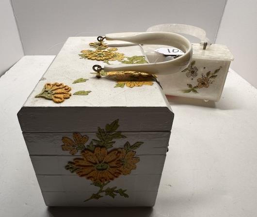 TWO VINTAGE BOX BAGS, ONE WOODEN 1950S FLORAL BOX BAG WITH YELLOW INTERIOR, ONE ACRYLIC FLORAL BOX BAG