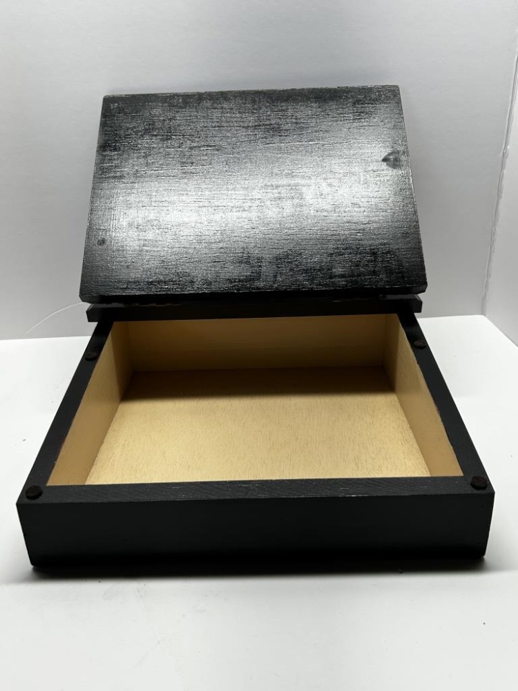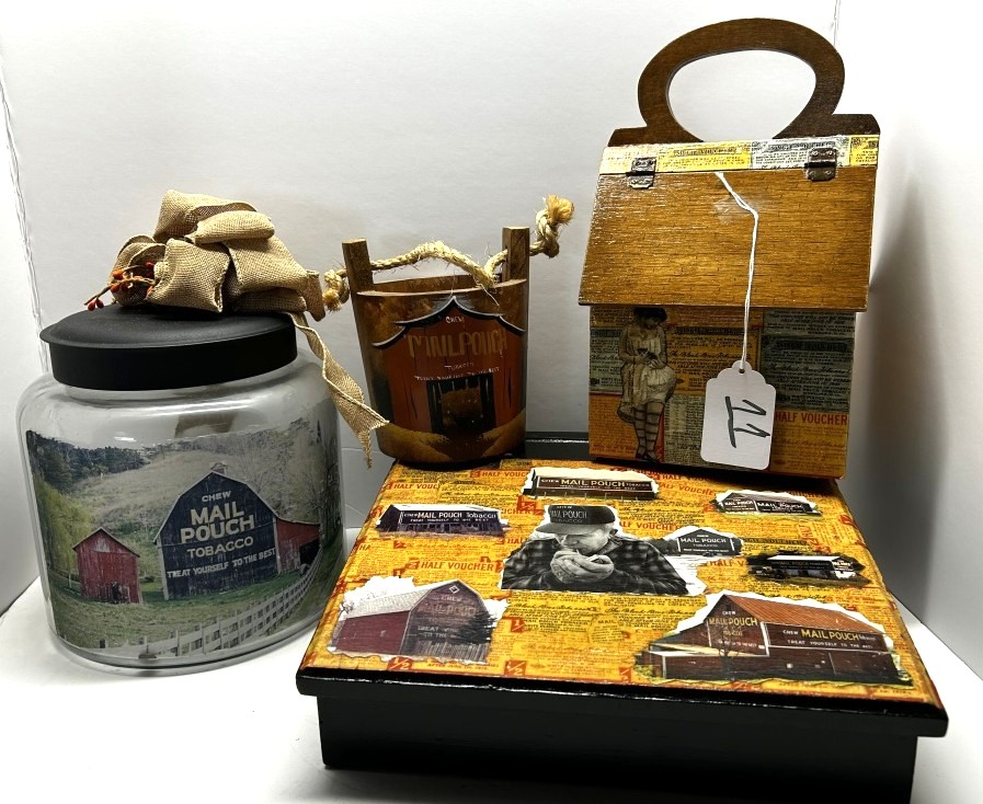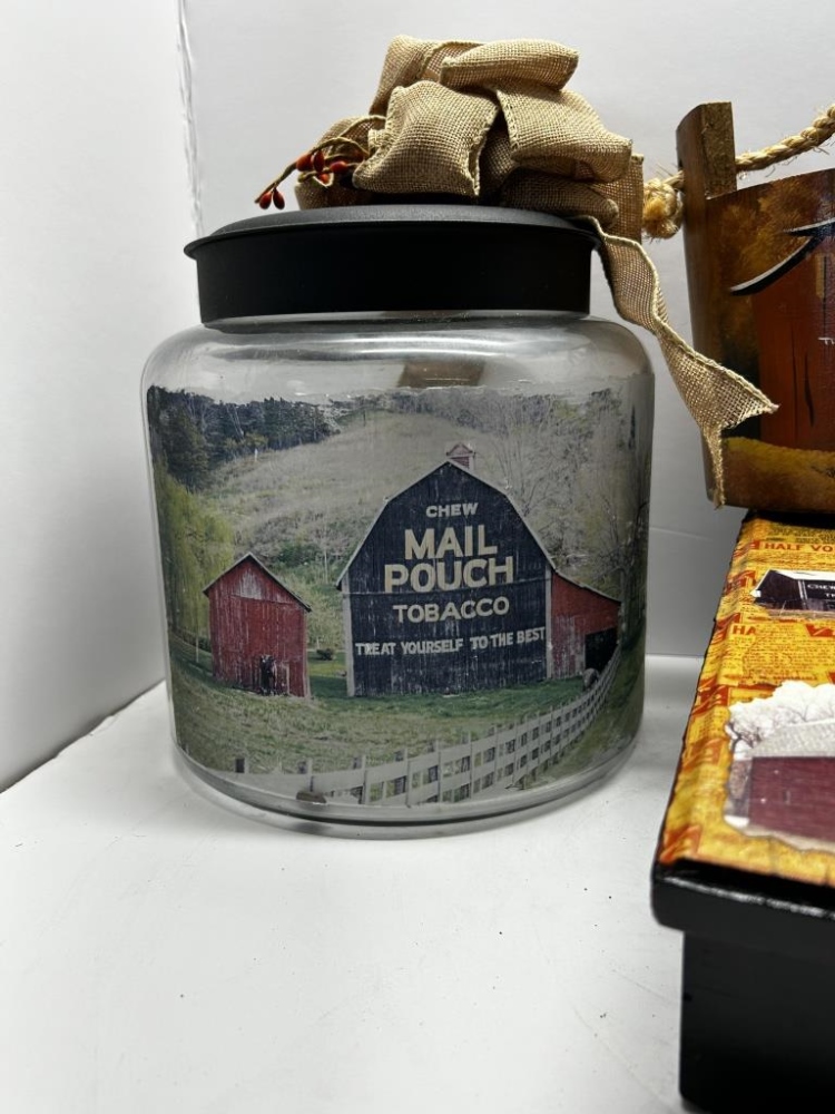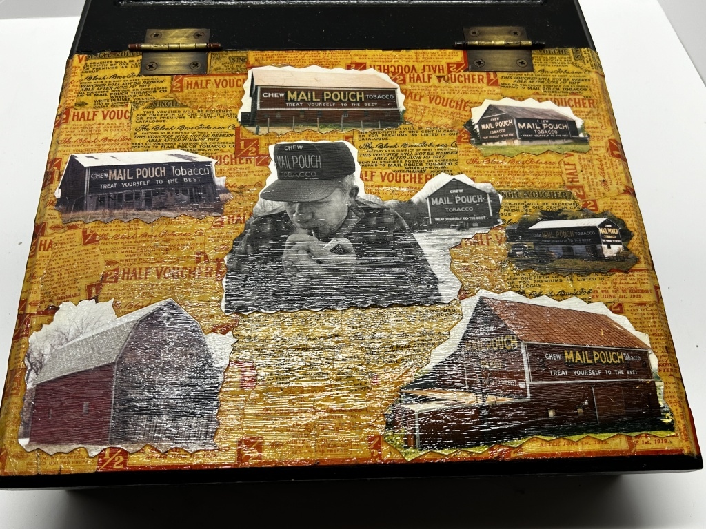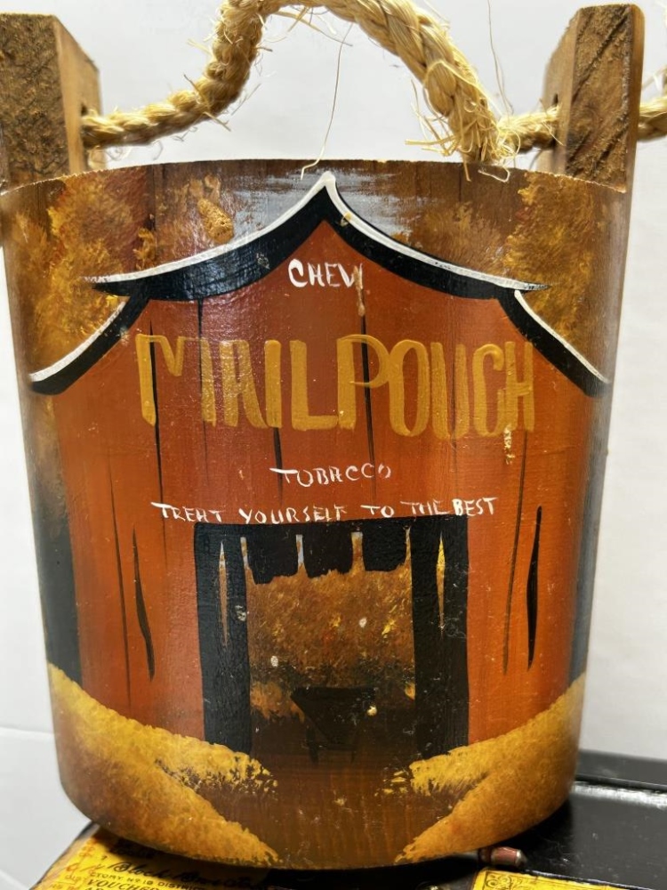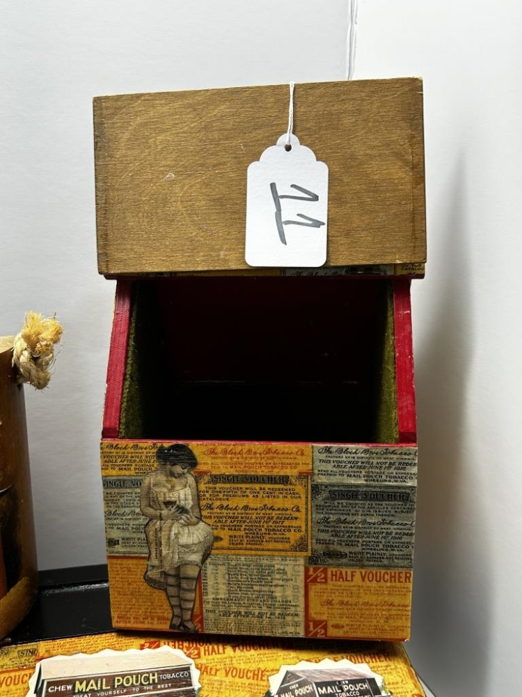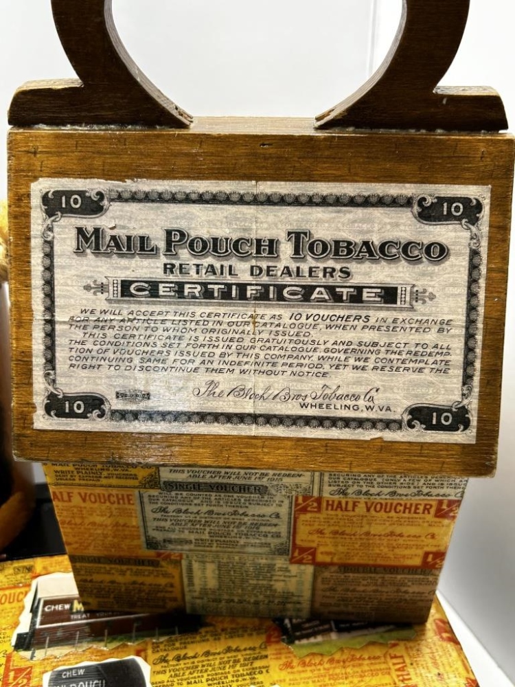WOODEN STORAGE BOX WITH HANDLE, “MAIL POUCH TOBACCO DEALERS CERTIFICATE” PRINTED ON LID, COVERED IN VOUCHER DESIGNS, MAIL POUCH TOBACCO WOODEN BOX AND PAIL, GLASS JAR WITH LID