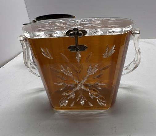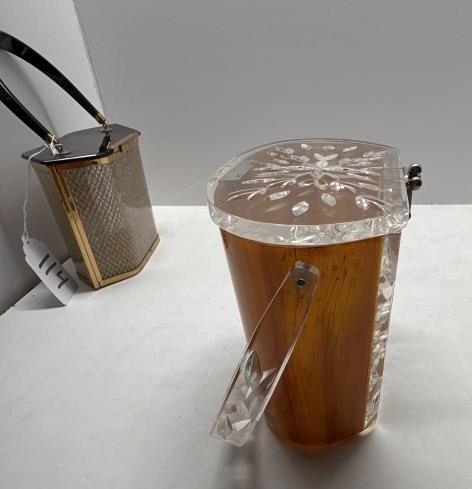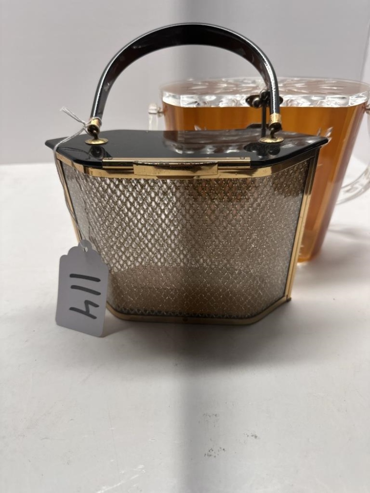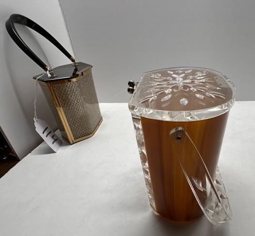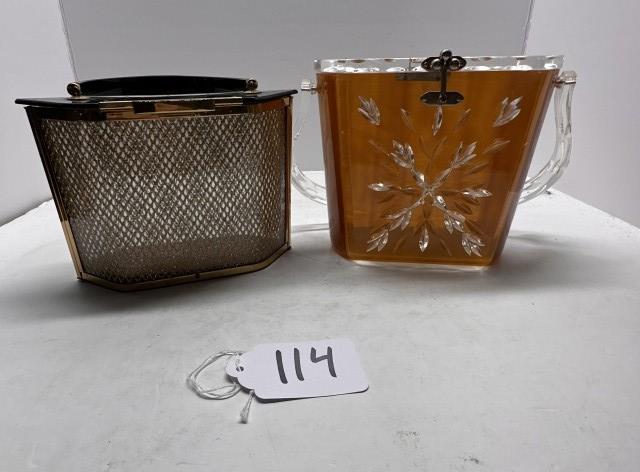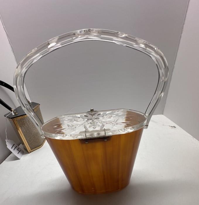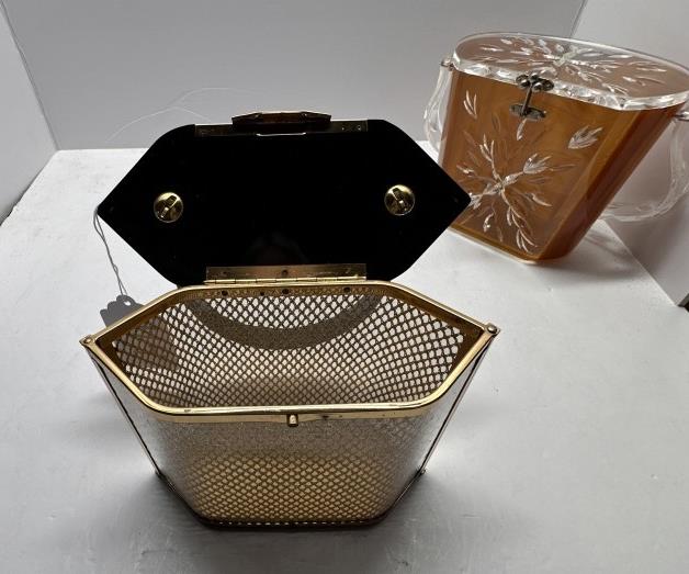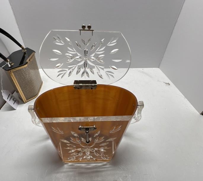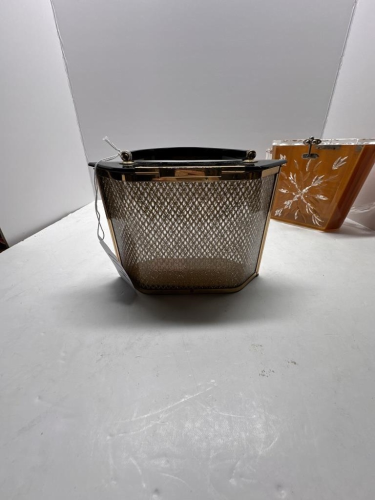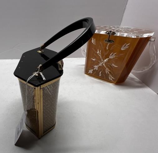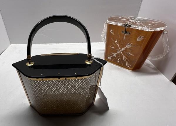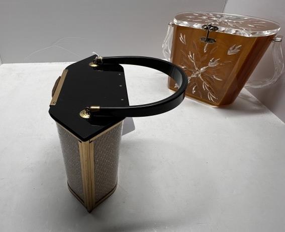 TWO VINTAGE LUCITE ACRYLIC BOX PURSES, ONE BLACK AND GOLD HEXAGONAL, ONE WOODEN BODY