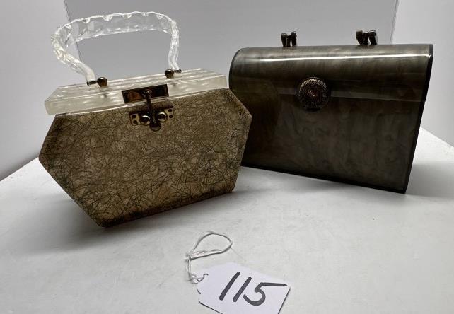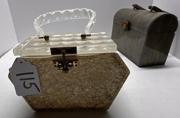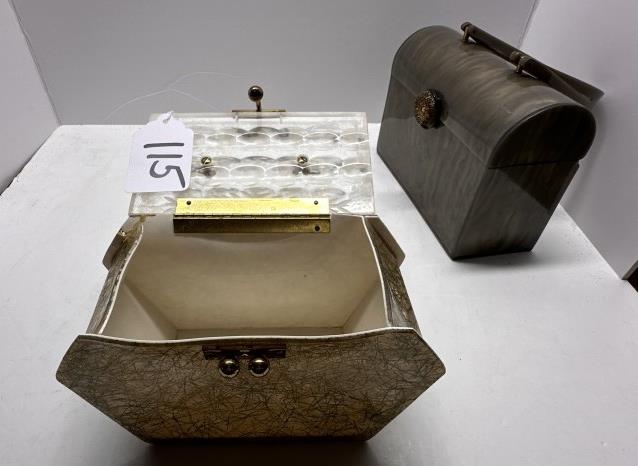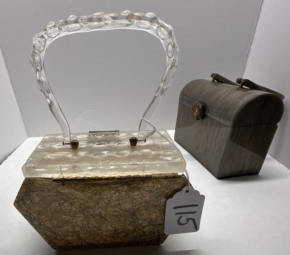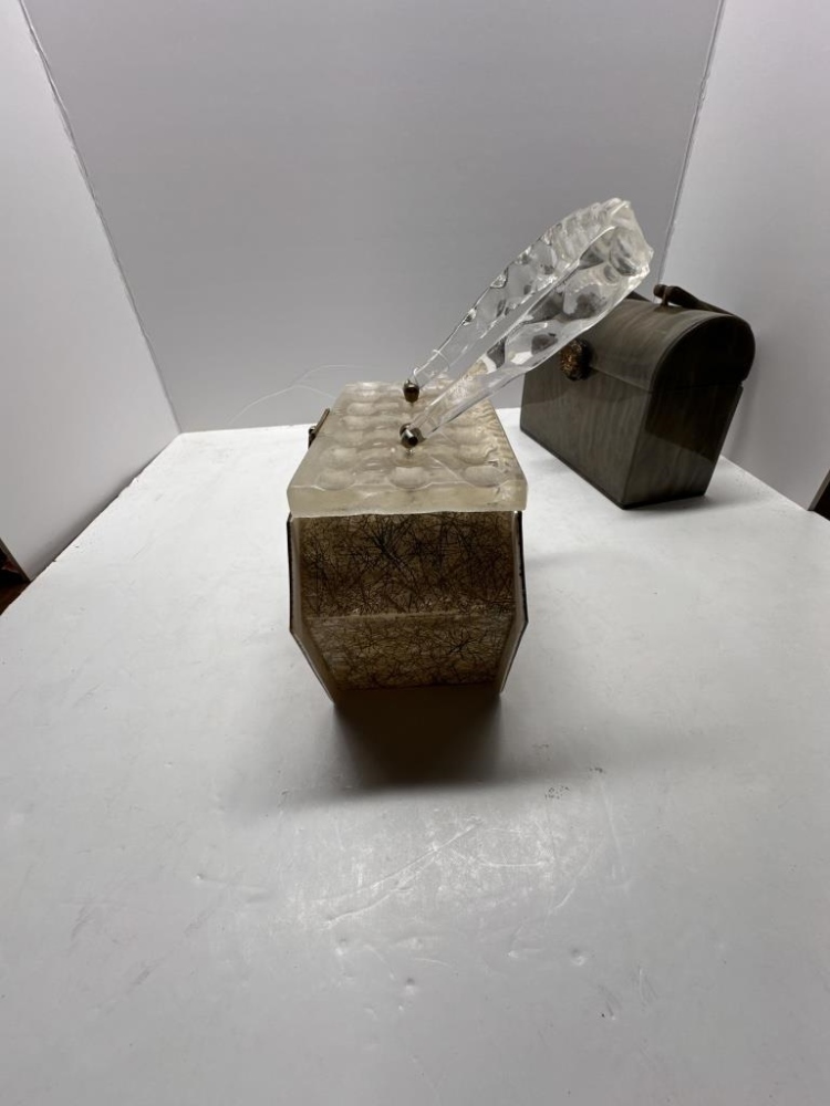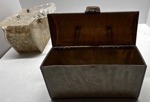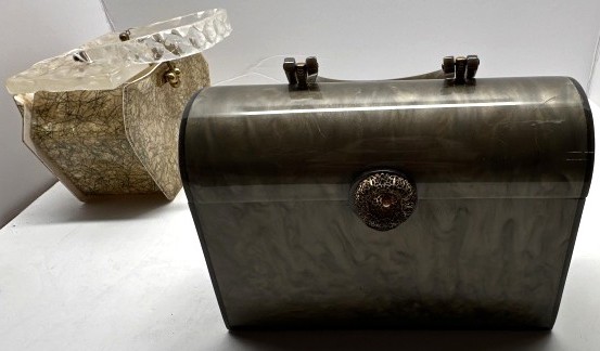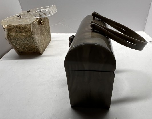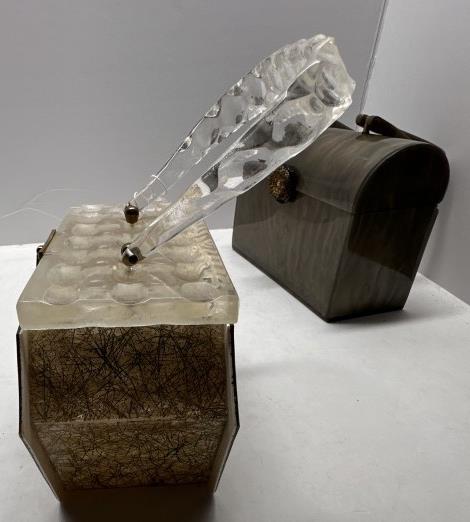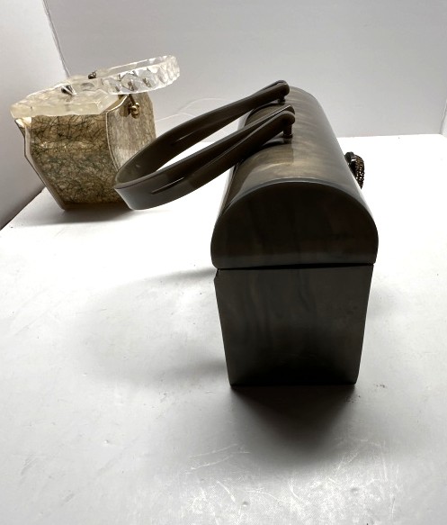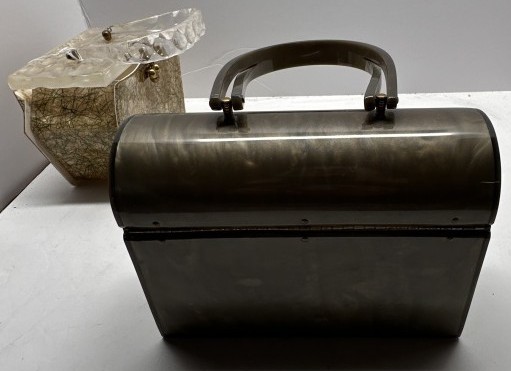 TWO VINTAGE LUCITE ACRYLIC BOX PURSES, ONE GREY LUCITE, ONE GOLD CONFETTI