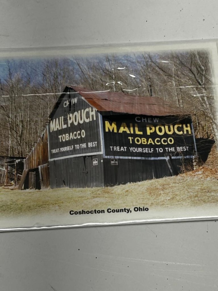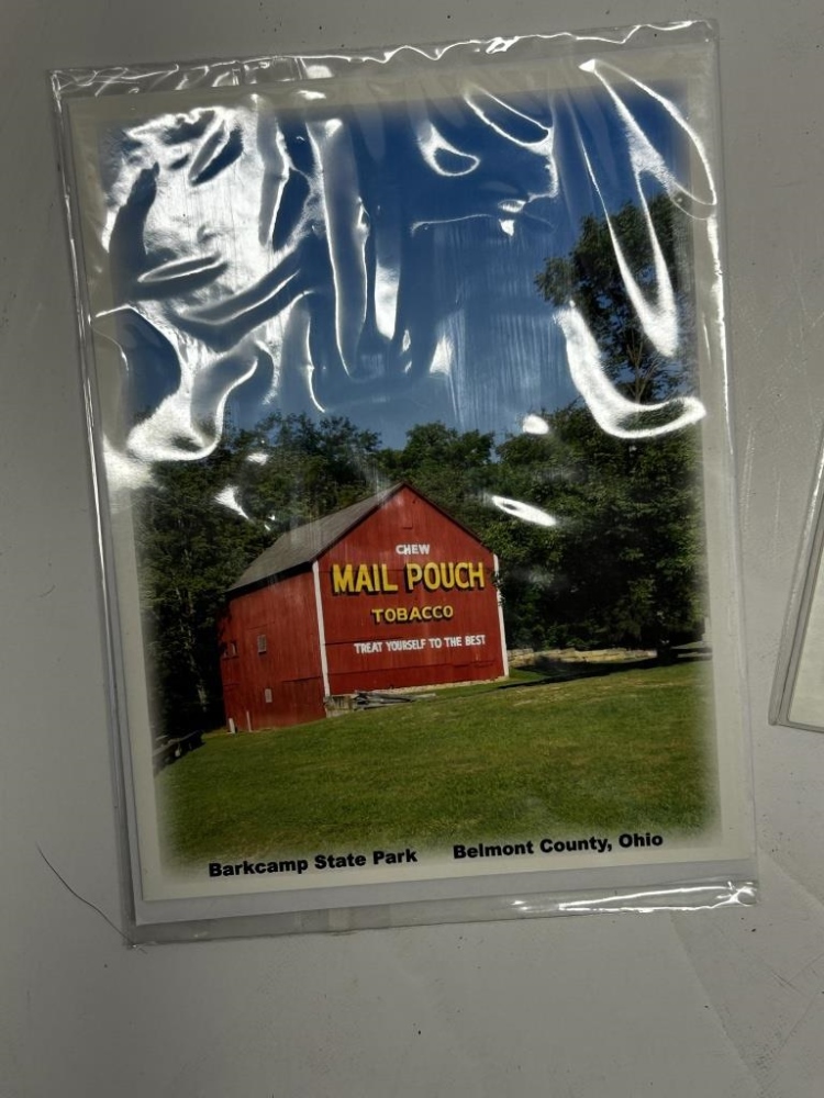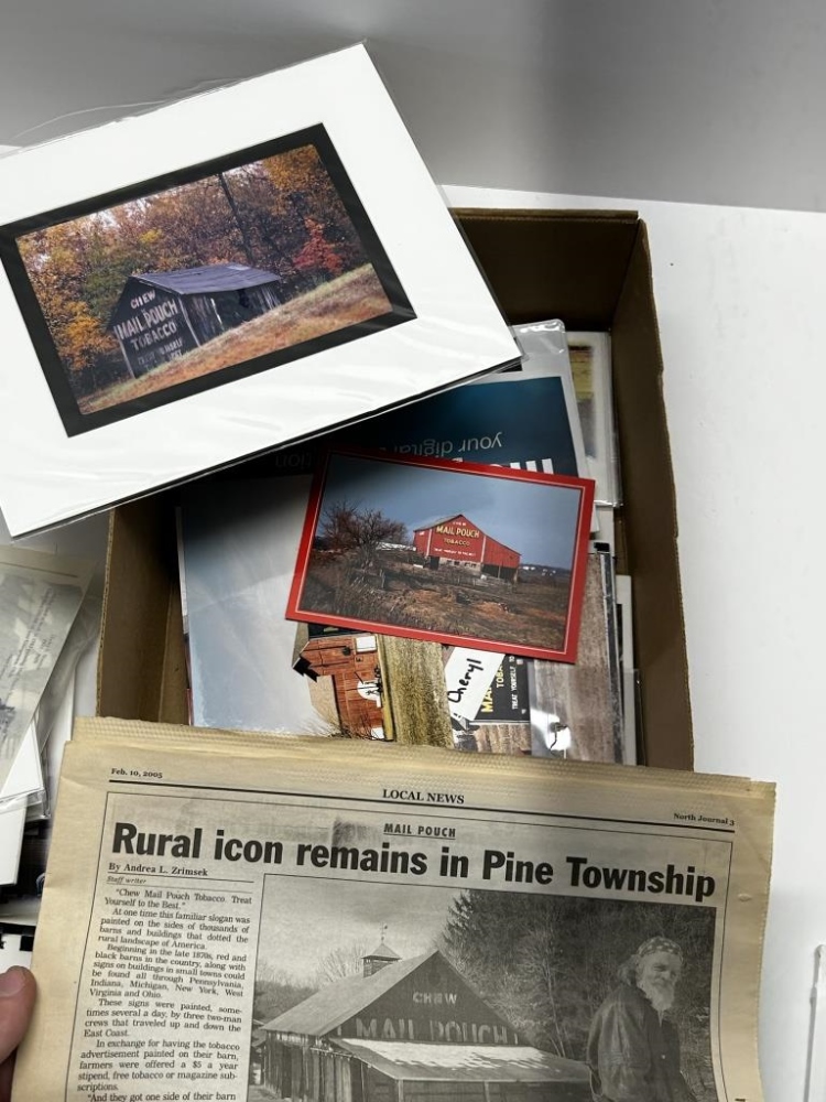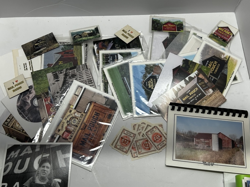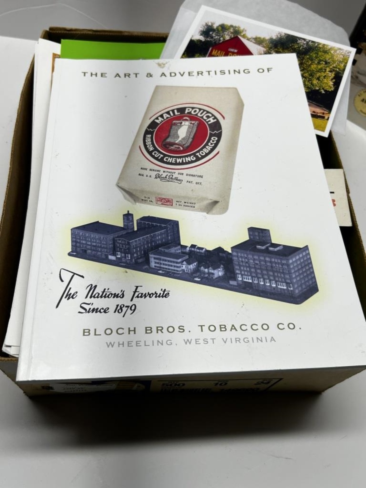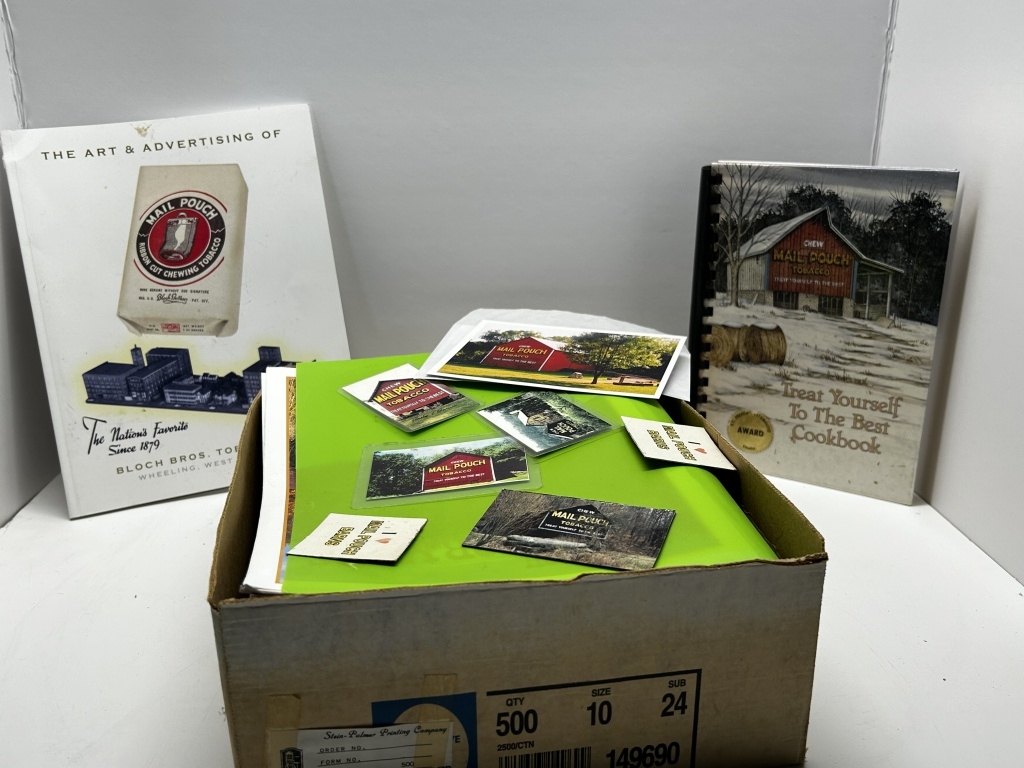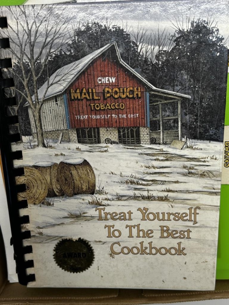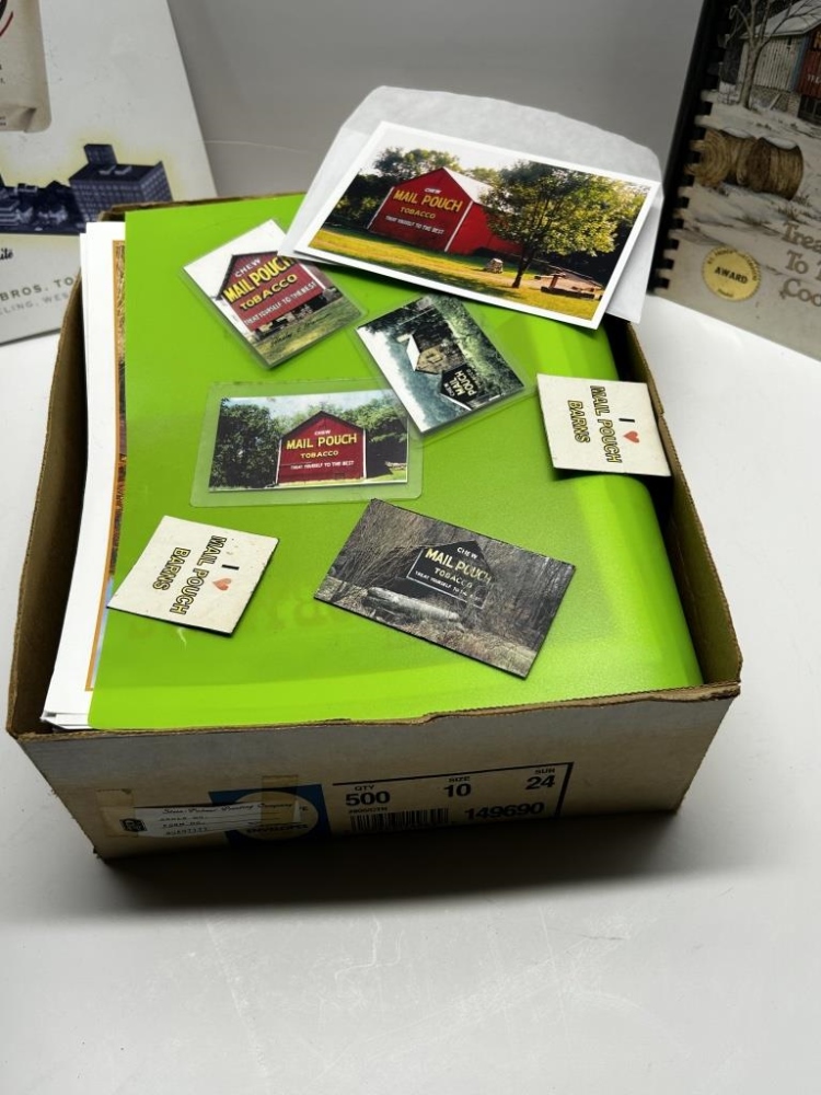 BOX OF MISCELLANEOUS BOOKS: COOKBOOKS, OLD CALENDARS, MAIL POUCH TOBACCO BARN THEMED MAGNETS/ POSTCARDS, CALENDARS, POSTCARDS FROM LOCAL AREAS