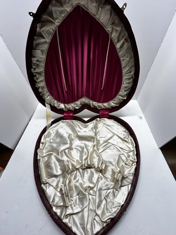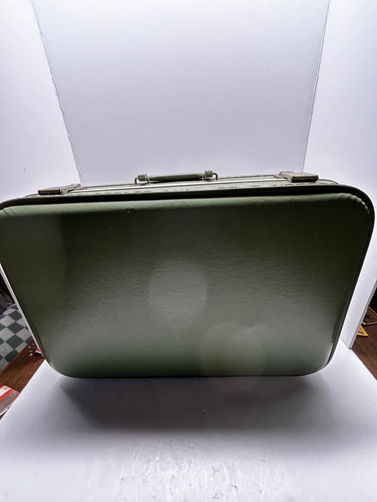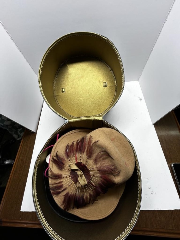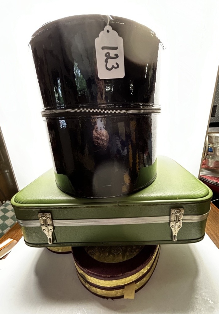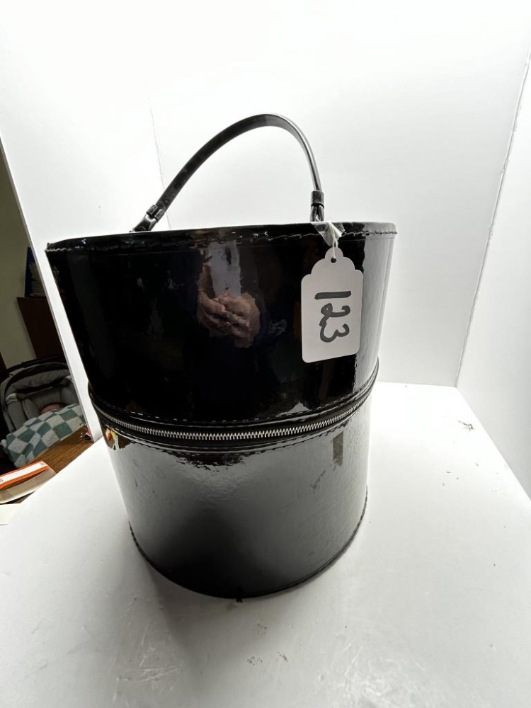 BLACK PATENT LEATHER HATCASE WITH VARIOUS VINTAGE WOMEN’S HATS, GREEN VINTAGE CLIP SUITCASE, HEART SHAPED CLASP BOX