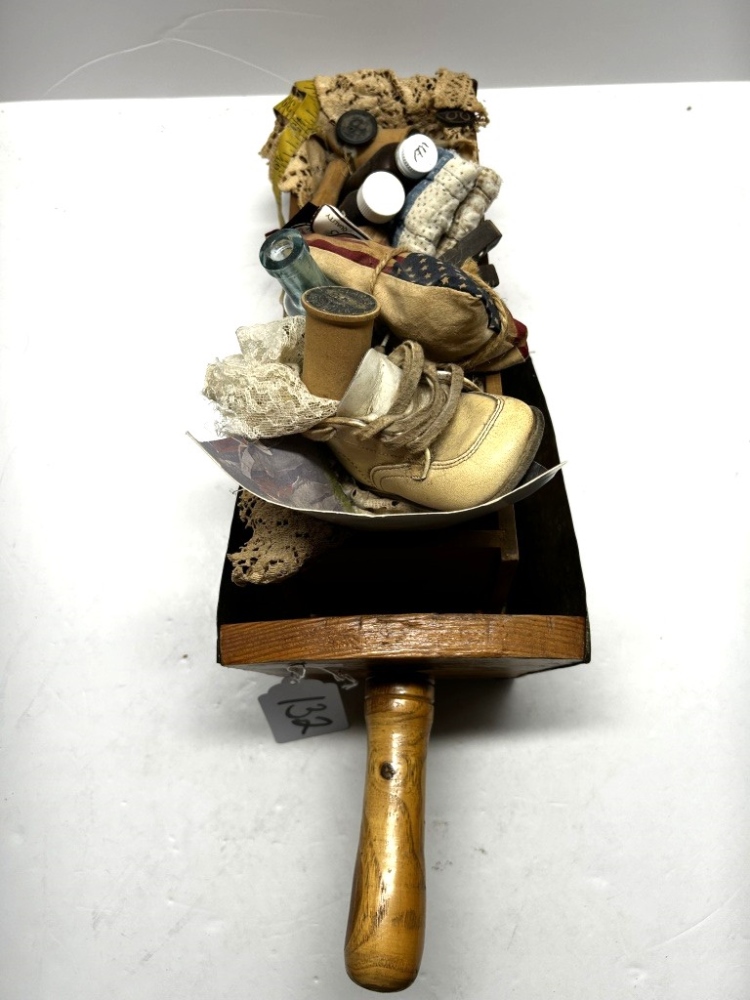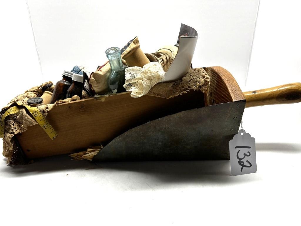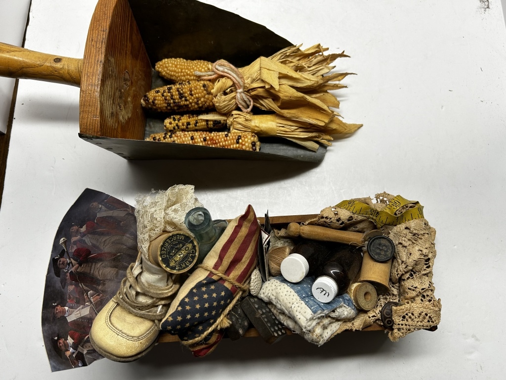 TWO RUSTIC DECORATIVE ITEMS, ,ETAL SHOVEL WITH FAKE CORN, WOODEN DRAWER WITH DECORATIVE PATRIOTIC ITEMS AND SEWING ITEMS