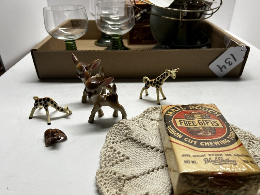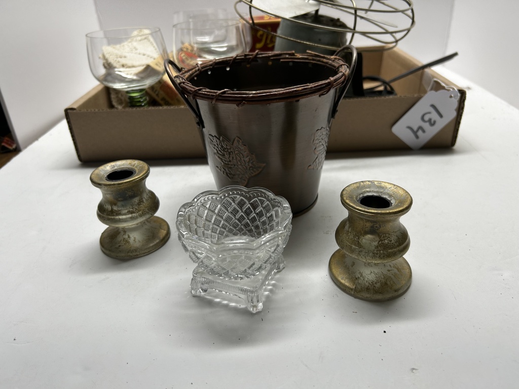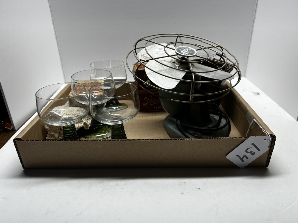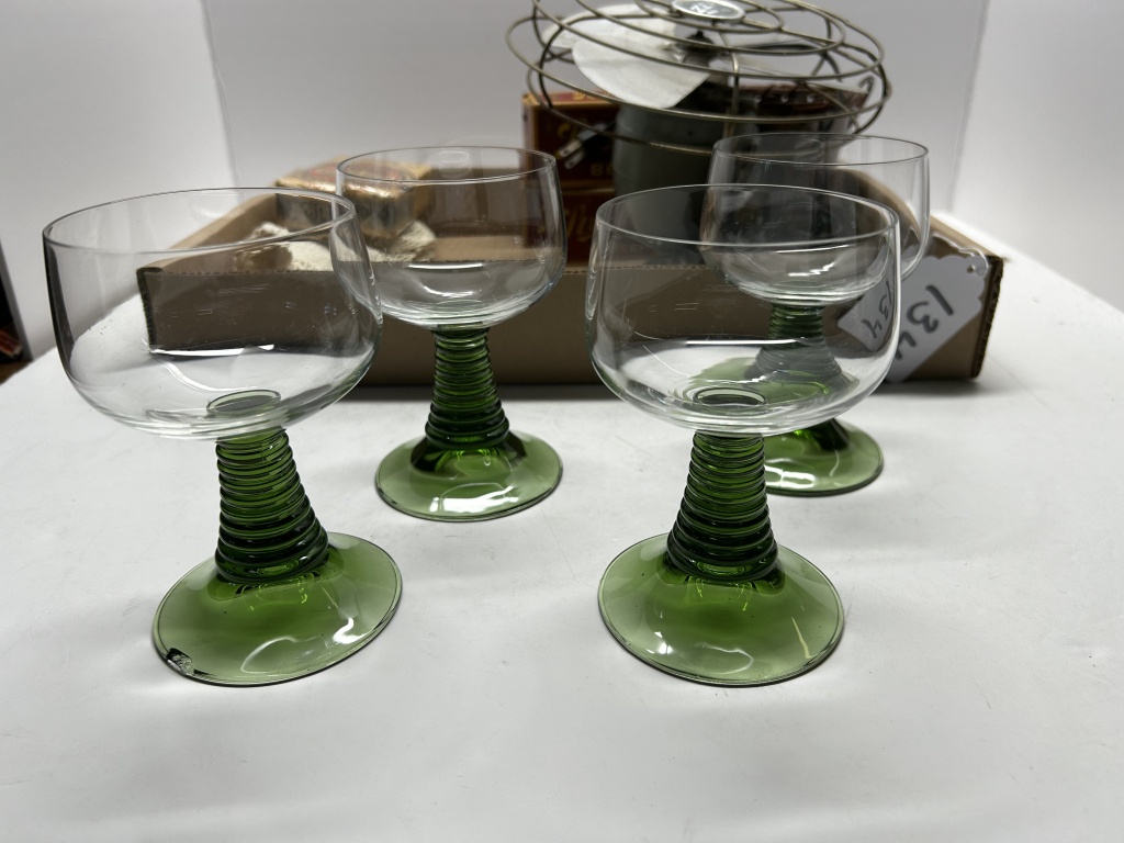 BOX OF MISCELLANEOUS ITEMS, FOUR GLASSES WITH GREEN STEM, ANTIQUE FAN, DECORATIVE CHEWING TOBACCO PACK, SILVER BUCKET WITH LEAF PATTERN, ETC.