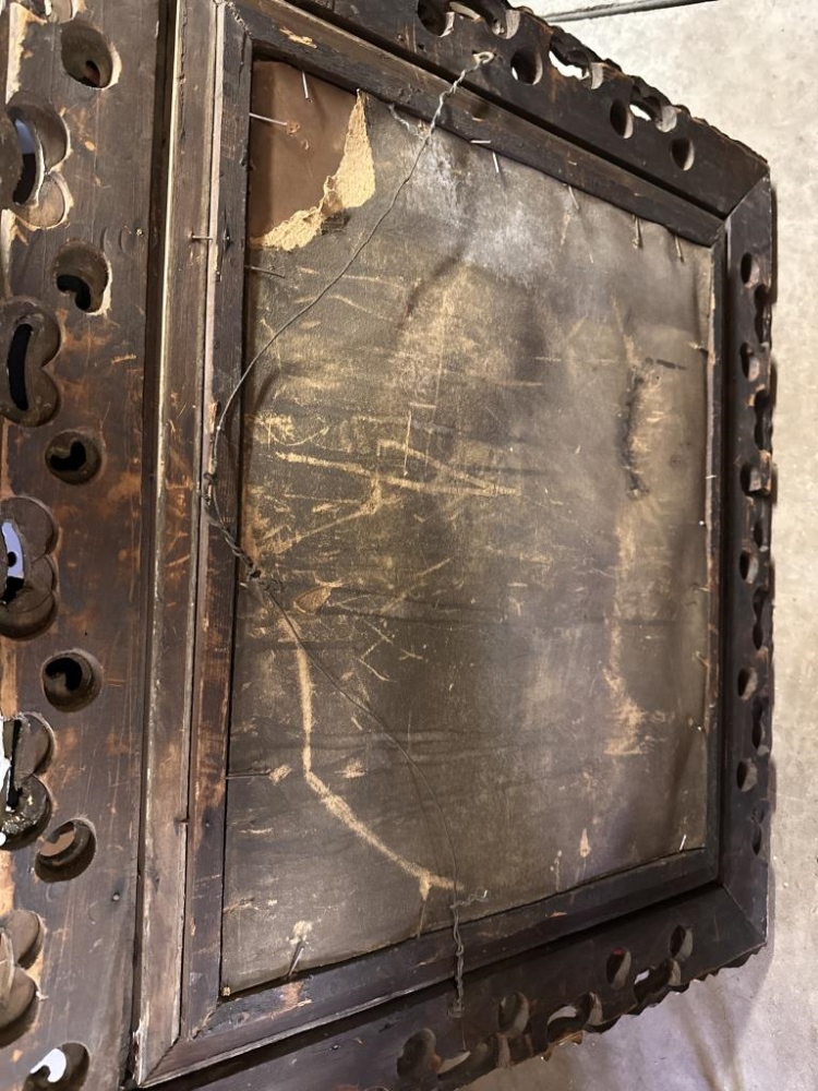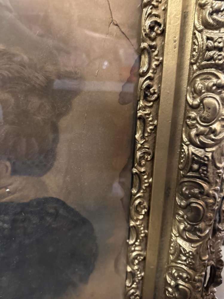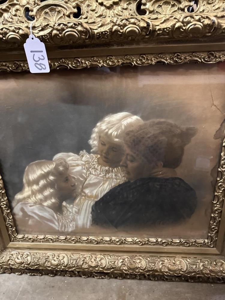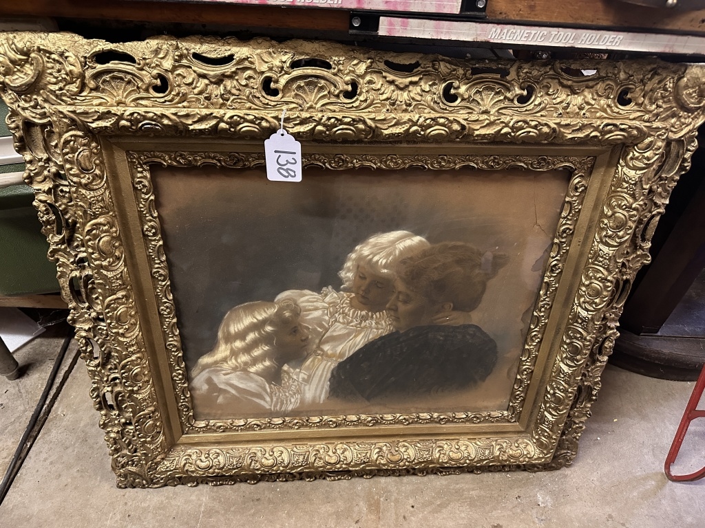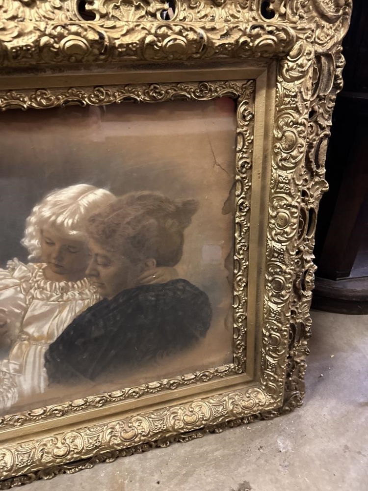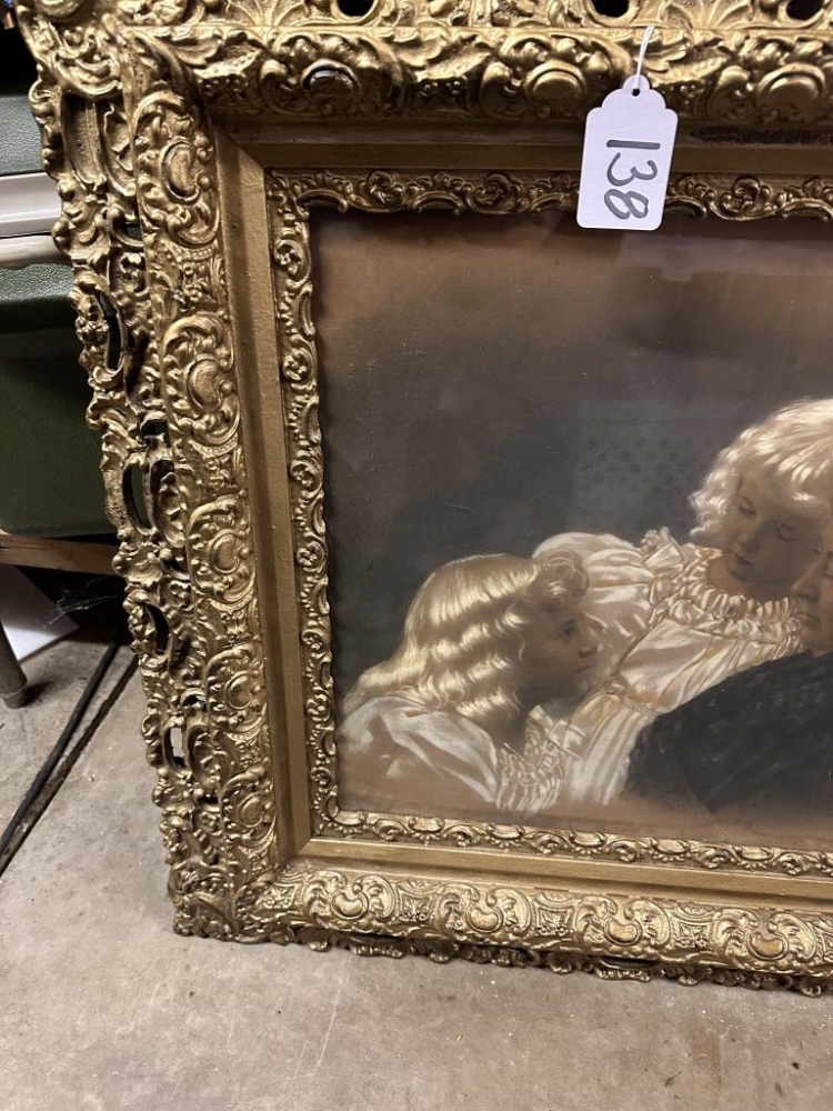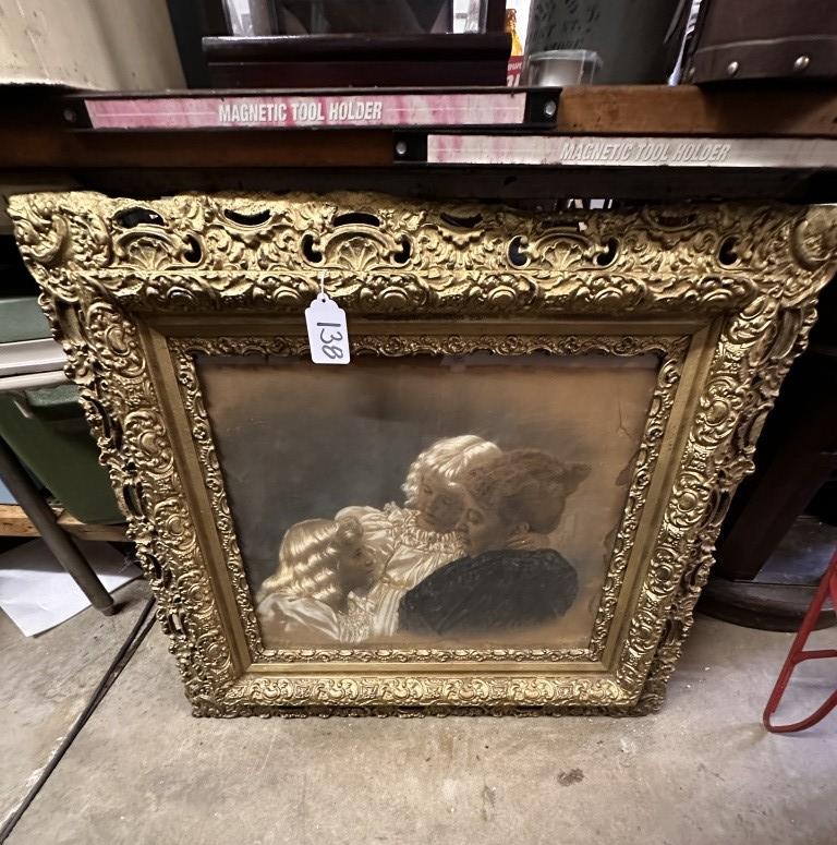 GOLDEN FRAMED PAINTING OF THREE GIRLS, TWO GIRLS WITH MATCHING OUTFITS AND HAIR