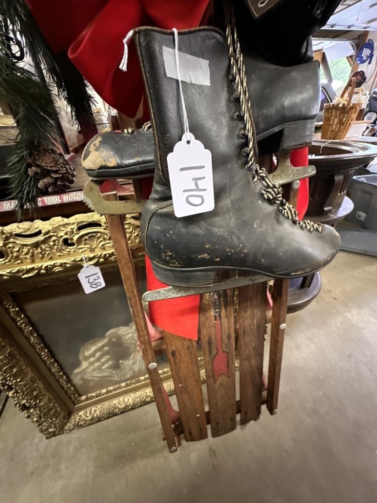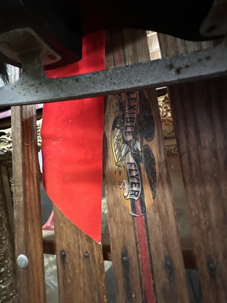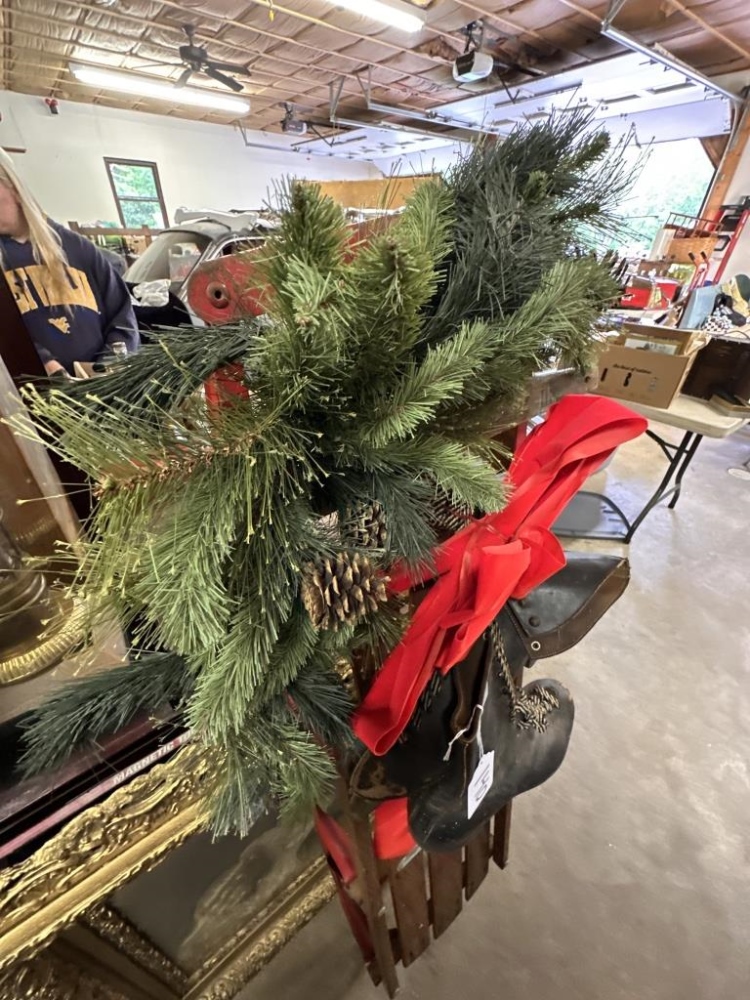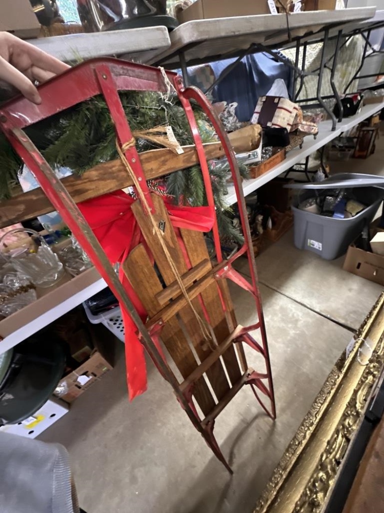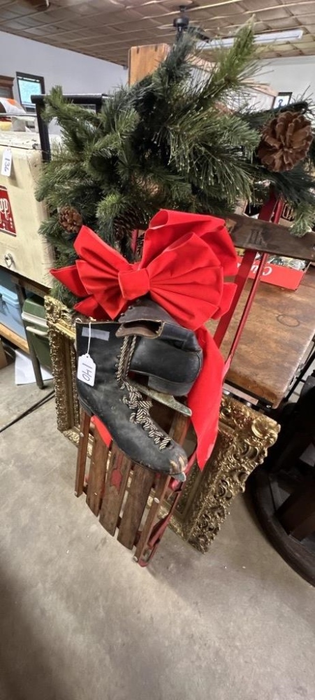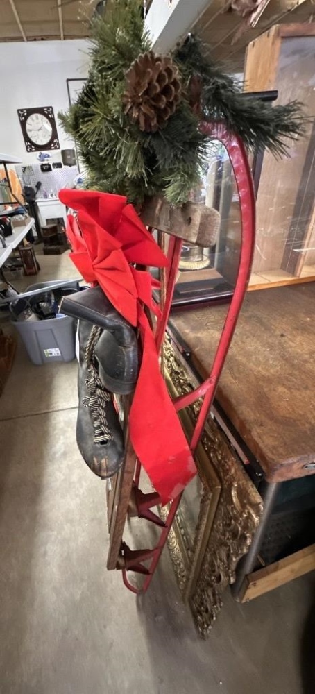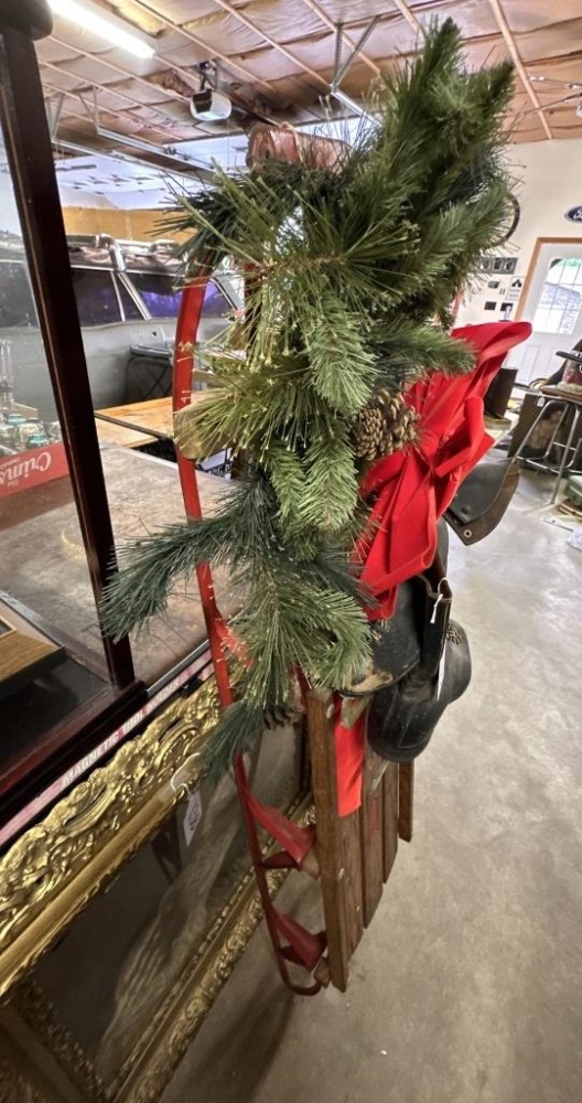 DECORATIVE BOBSLED WITH BLACK SKATES, RED BOW, AND WREATH