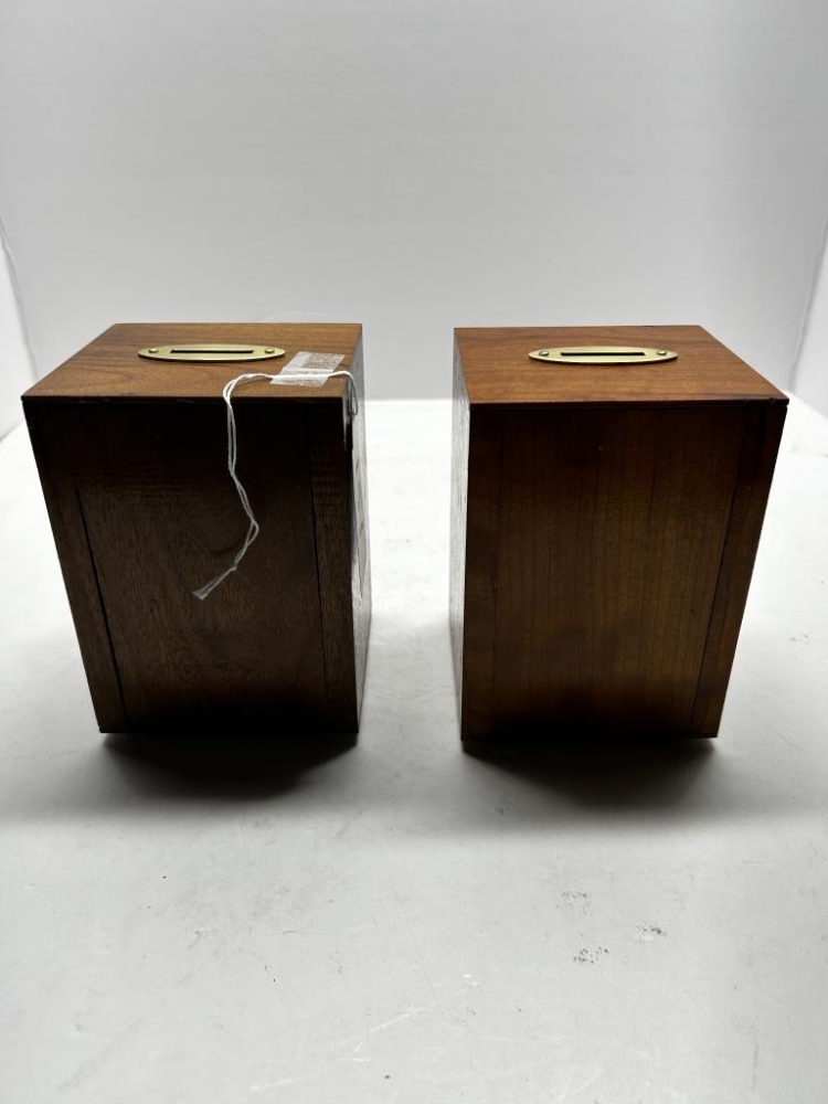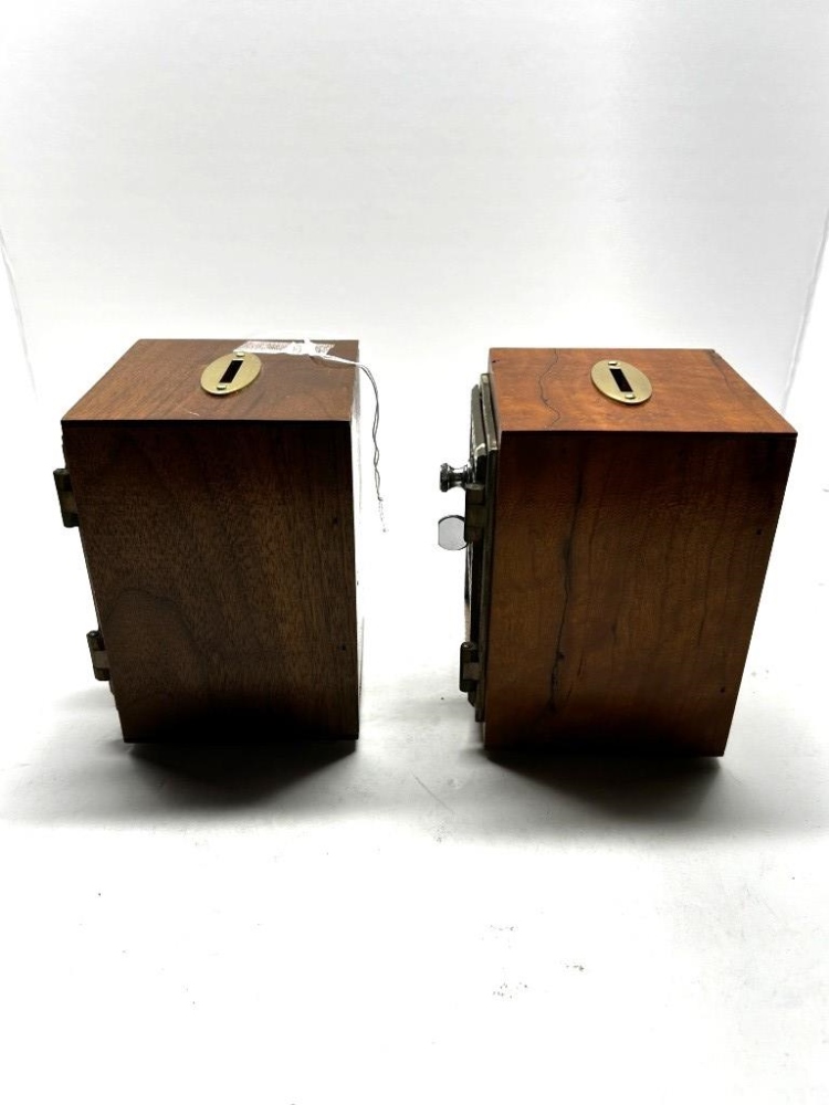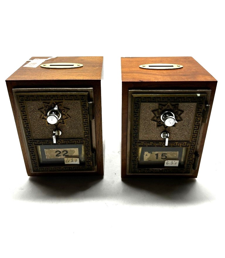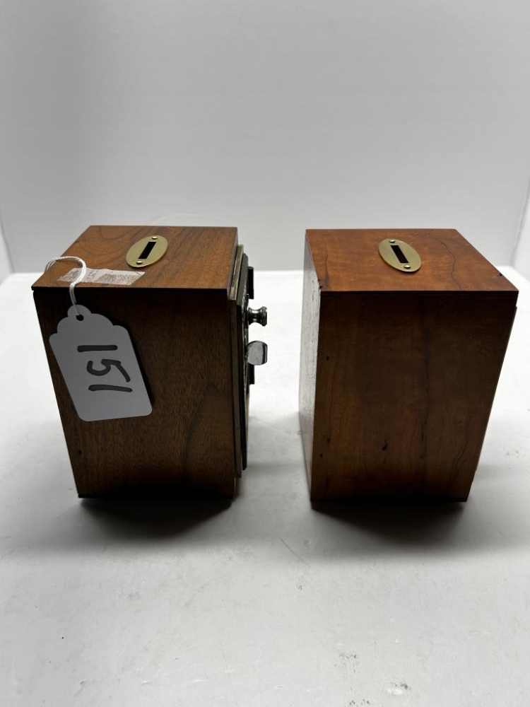 TWO WOODEN ANTIQUE COIN BANKS FROM NEW ATHENS, OH., METAL PADLOCK CODE