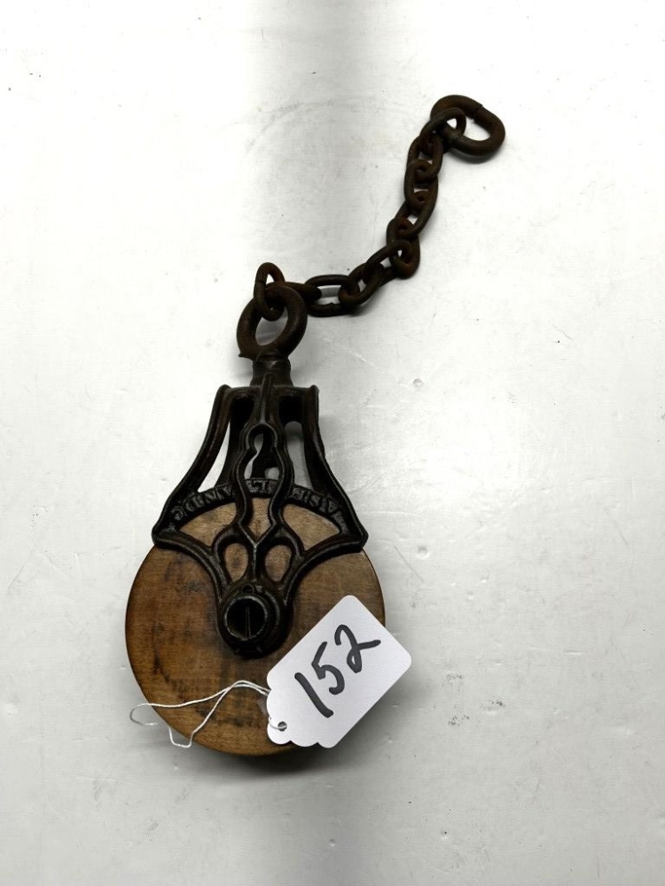 ANTIQUE PRIMITIVE PULLEY, CAST IRON CHAIN, WOODEN WHEEL