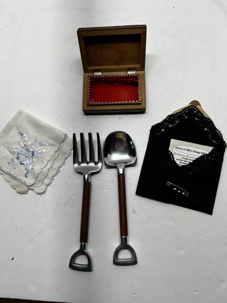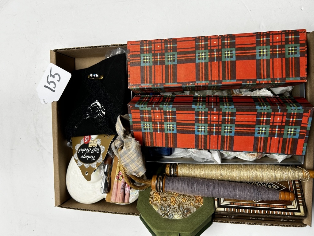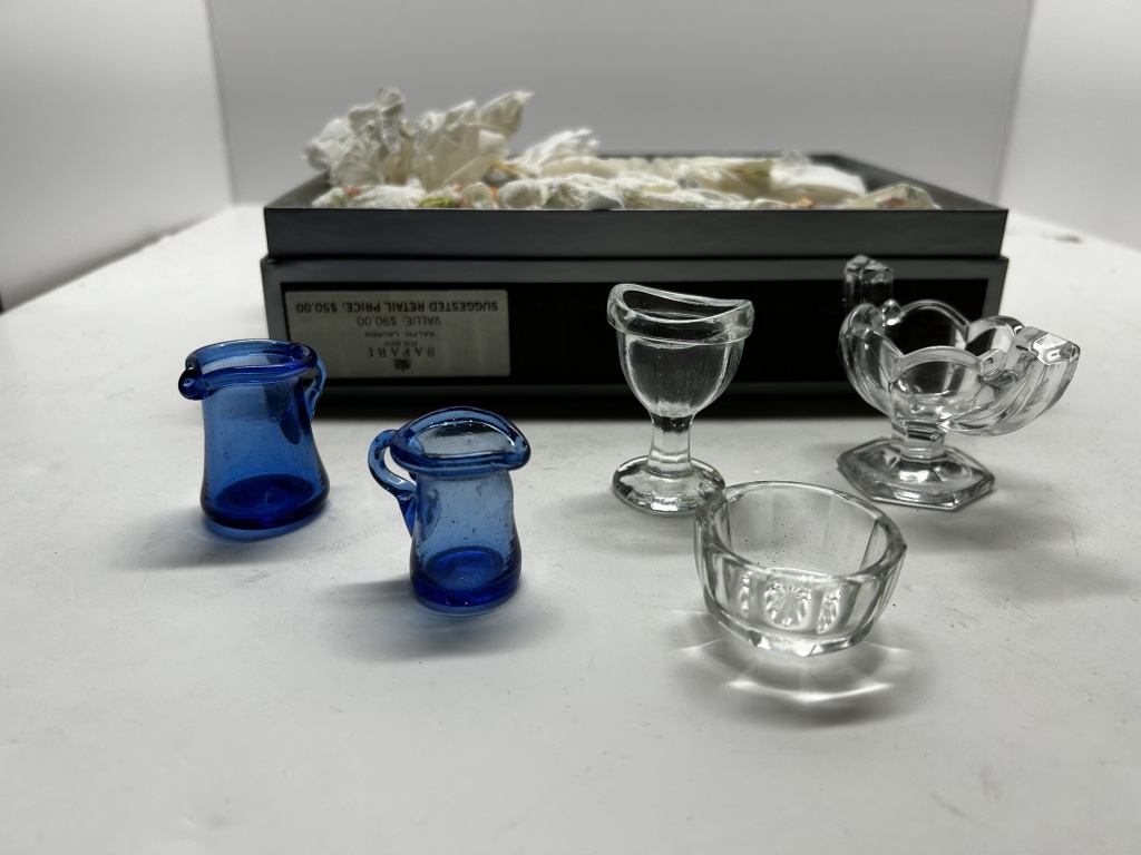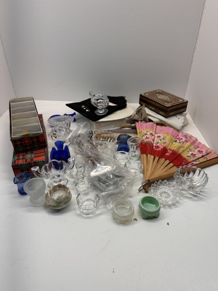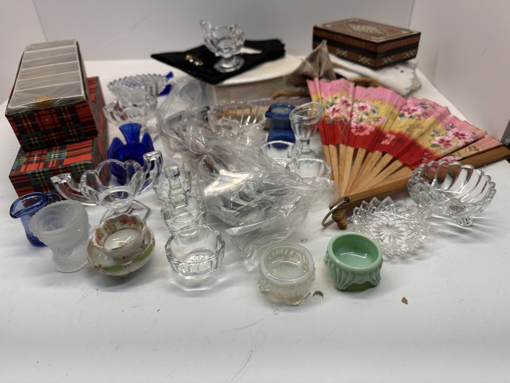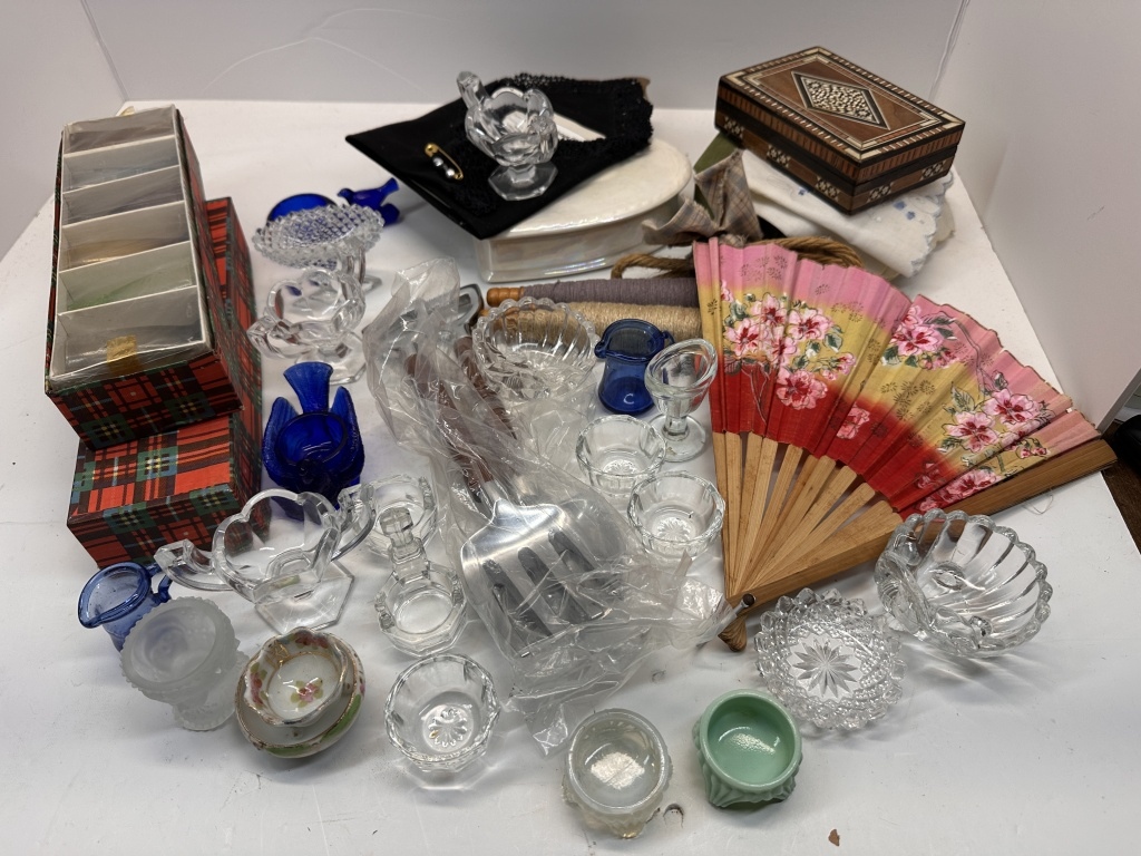 BOX OF MISCELLANIES, MINI COLORED SHOT GLASSES, FOLDABLE HAND-FAN, SMALL JEWELRY ORGANIZERS, HANDHELD PITCHFORK AND SHOVEL, ETC.