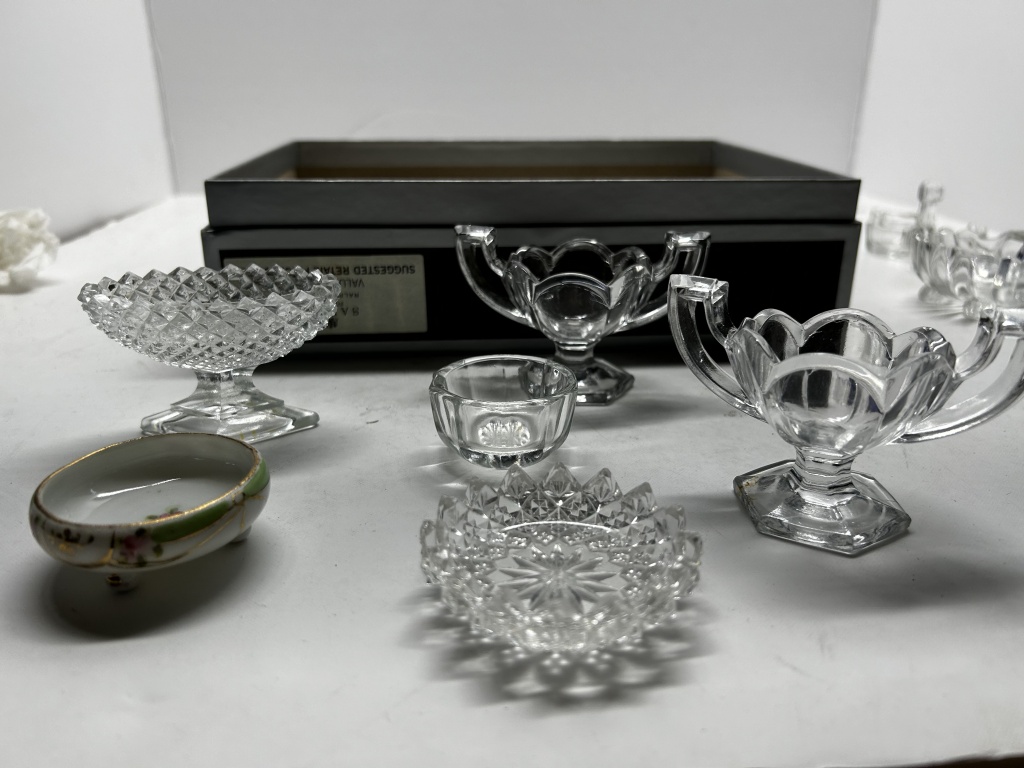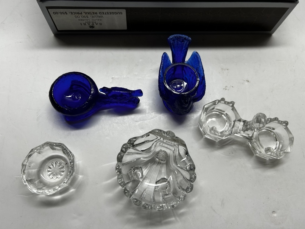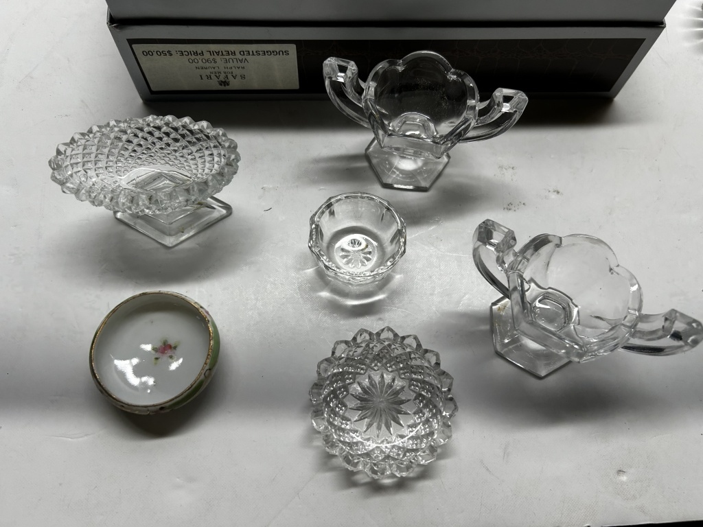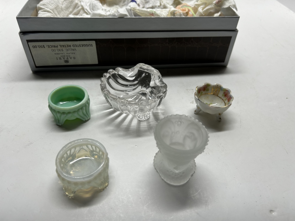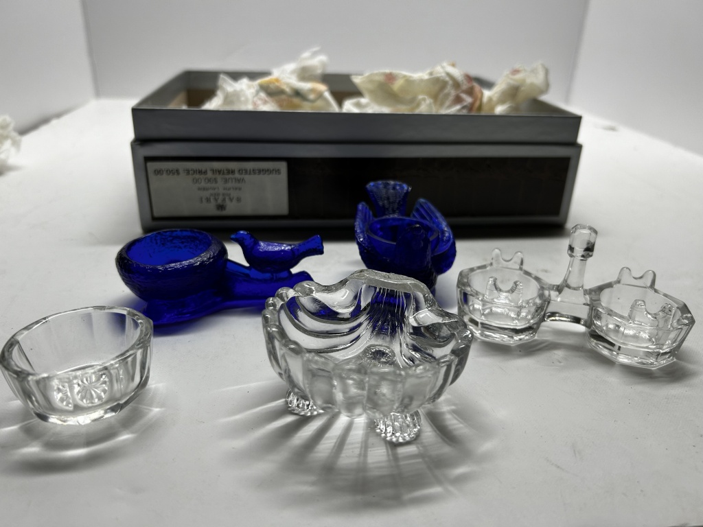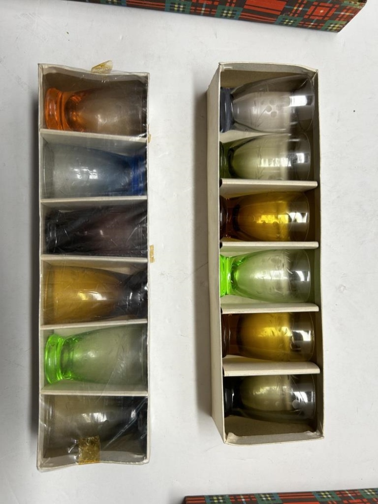 BOX OF MISCELLANIES, MINI COLORED SHOT GLASSES, FOLDABLE HAND-FAN, SMALL JEWELRY ORGANIZERS, HANDHELD PITCHFORK AND SHOVEL, ETC.