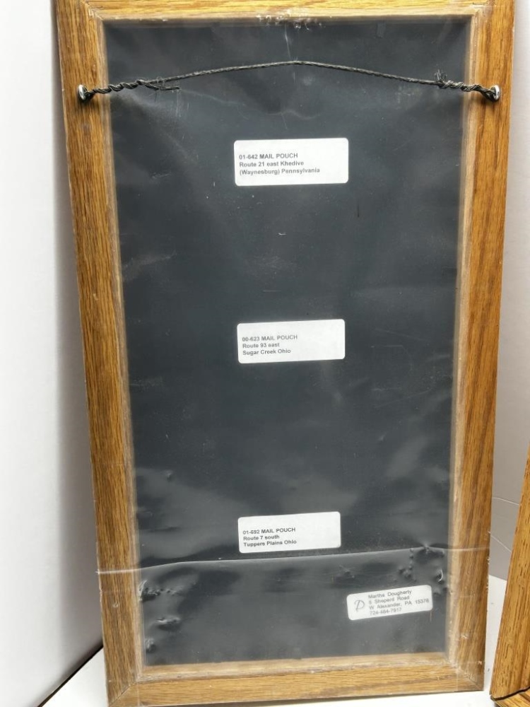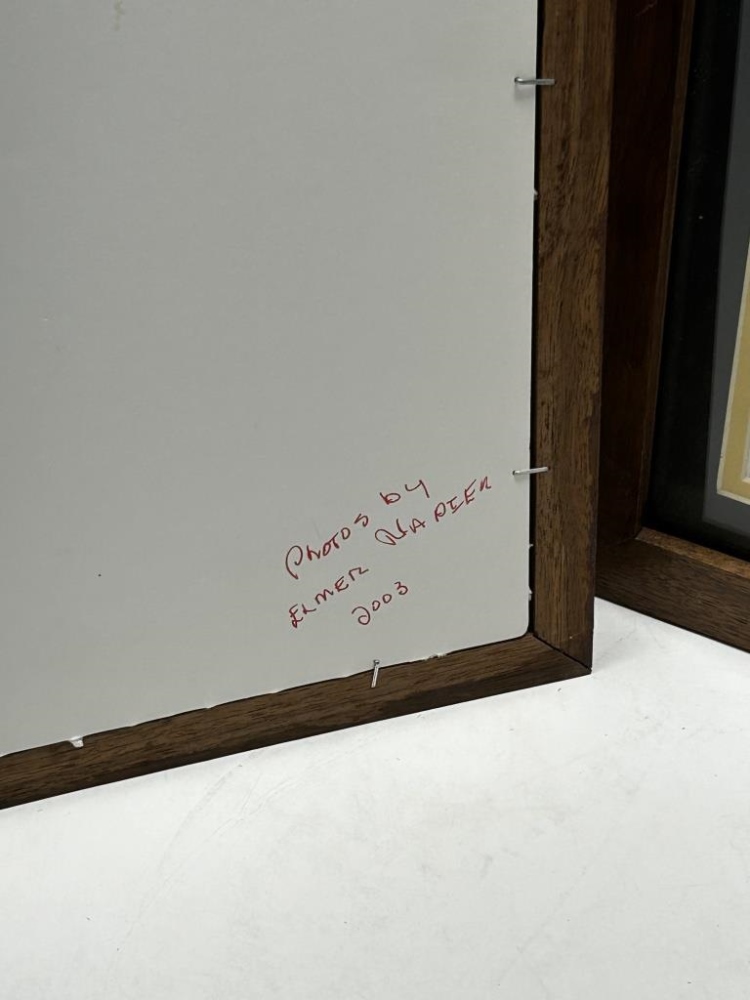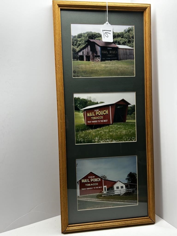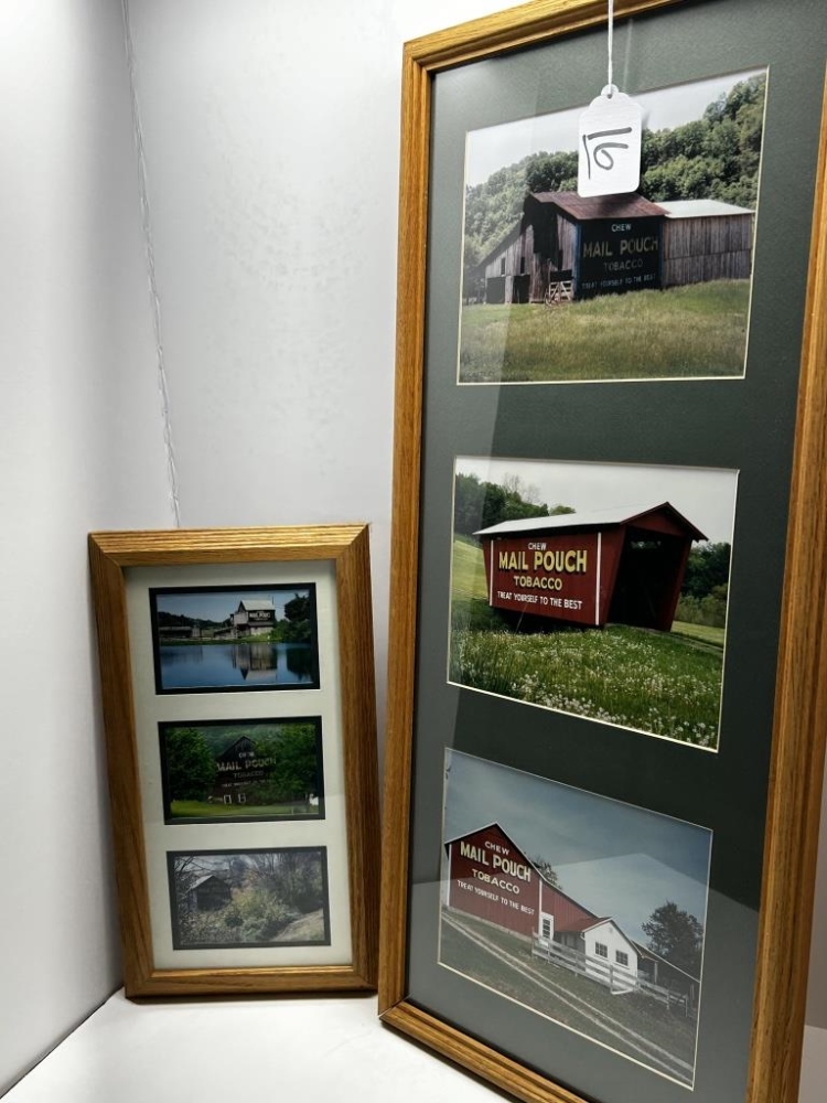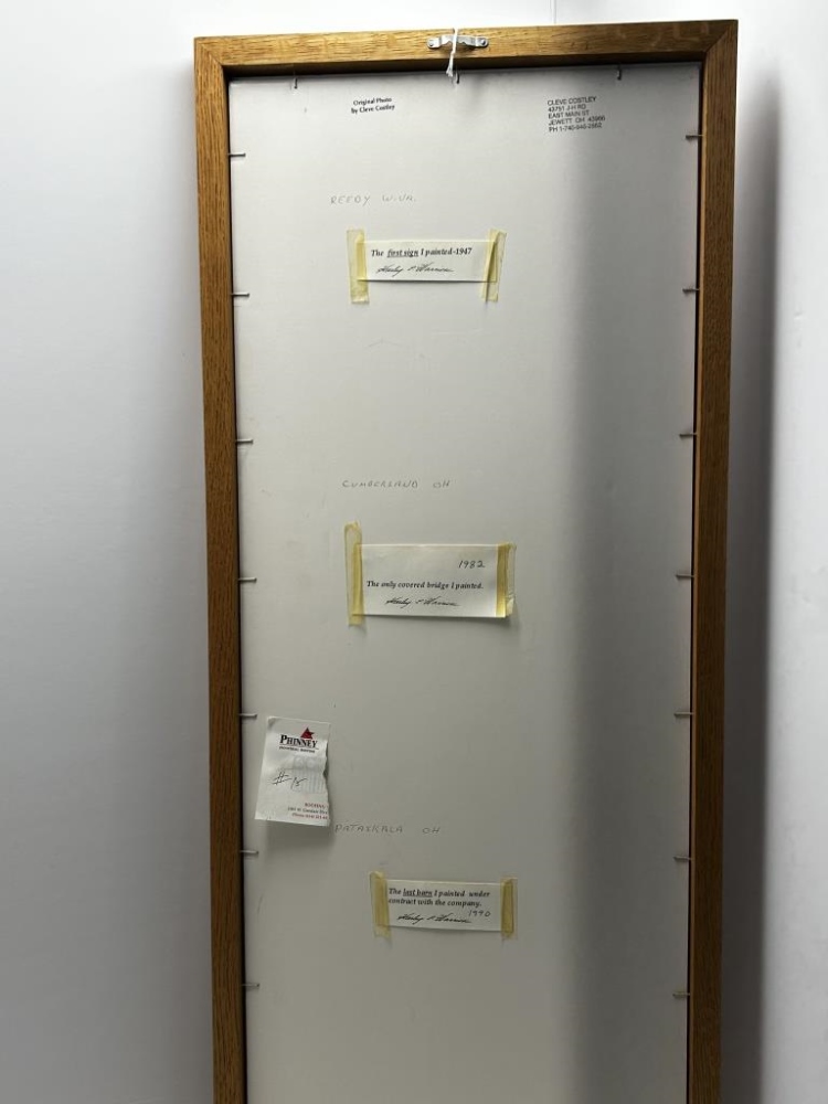 TWO FRAMES WITH THREE PICTURES IN EACH, PHOTOS IN LARGE FRAME: 1.) “THE FIRST SIGN I PAINTED IN 1947” 2.) “THE ONLY COVERED BRIDGE I PAINTED-1982” 3.) “THE LAST BARN I PAINTED UNDER CONTRACT WITH THE COMPANY-1990”, ALL