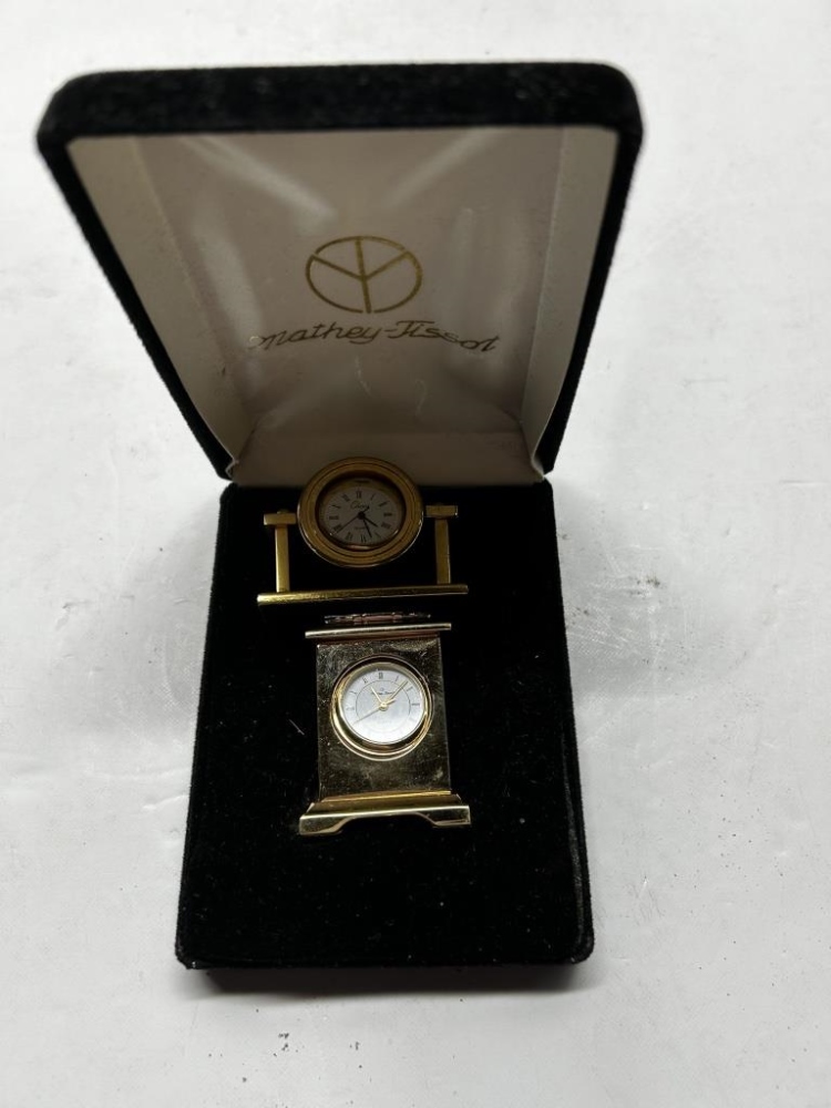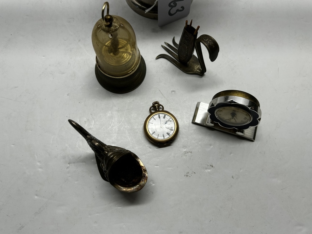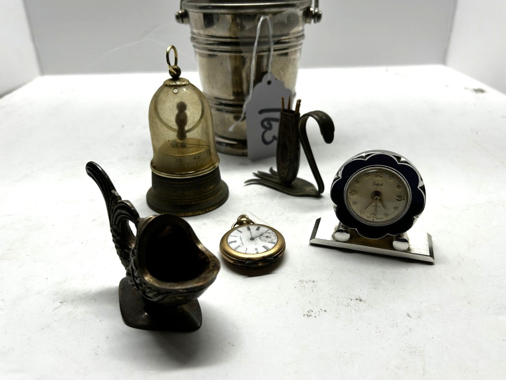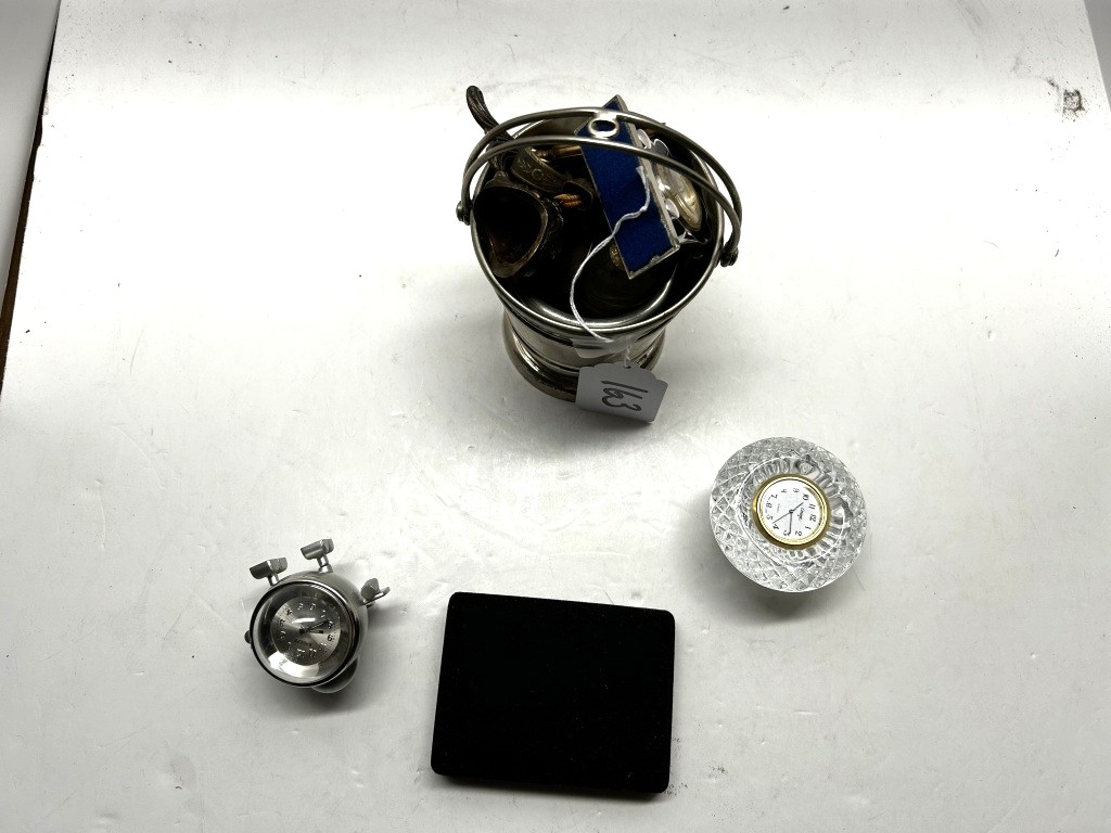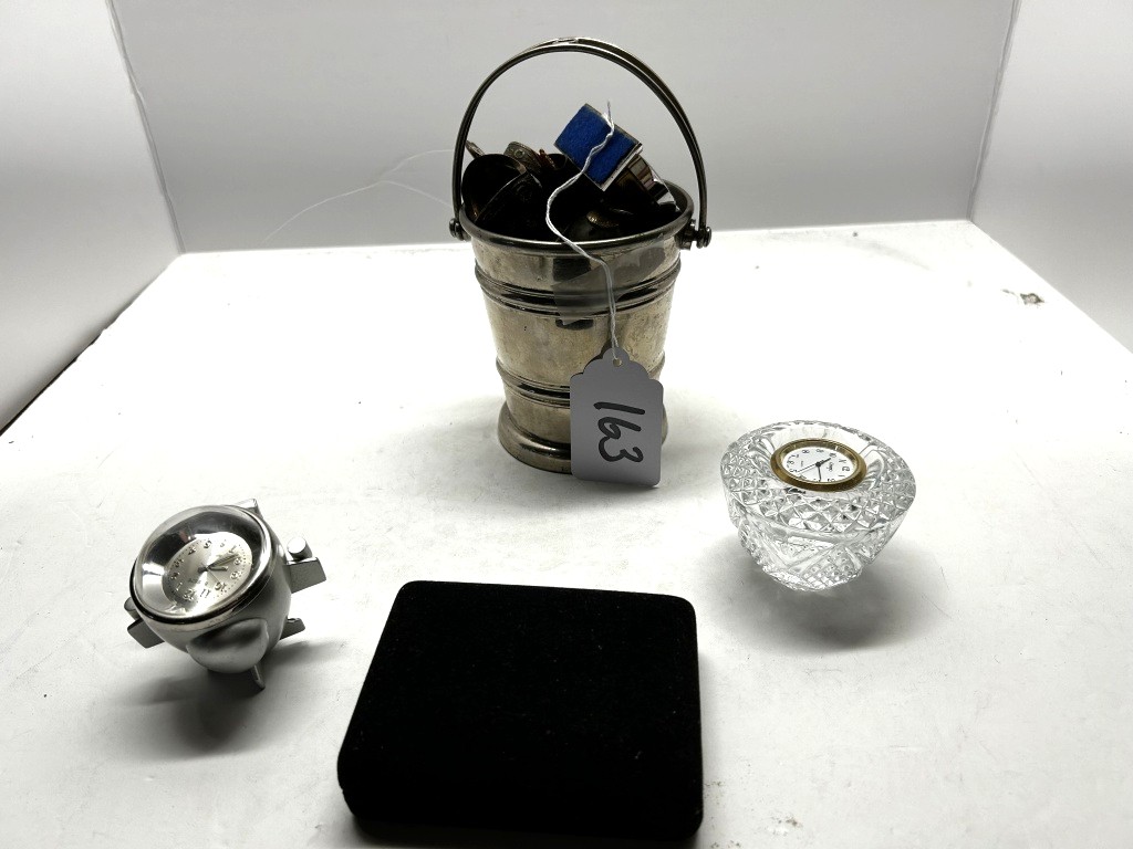 SILVER BUCKET FULL OF ANTIQUES, MINI GLASS CLOCKS, TOOTHPICK HOLDER, ETC.