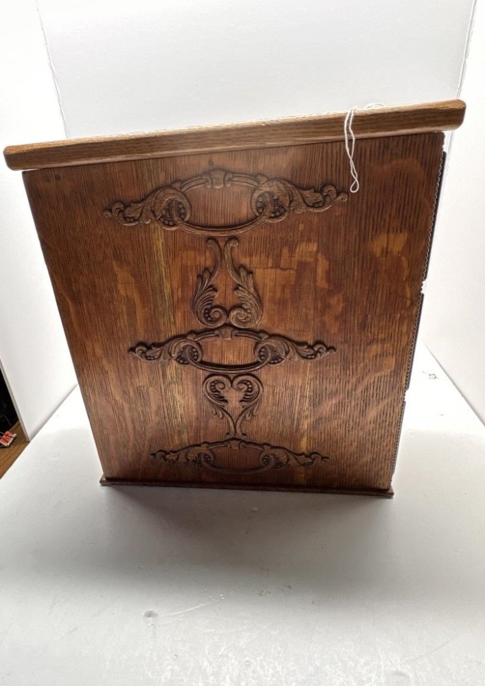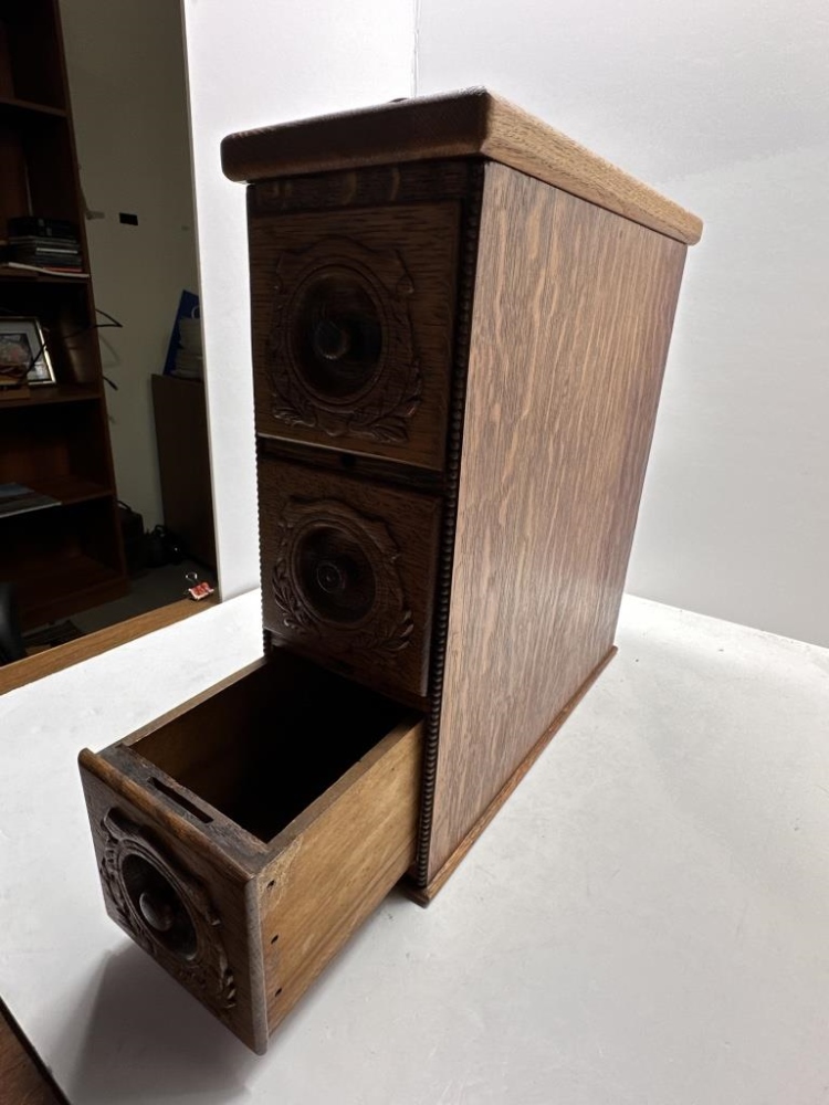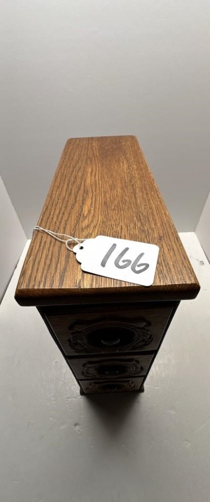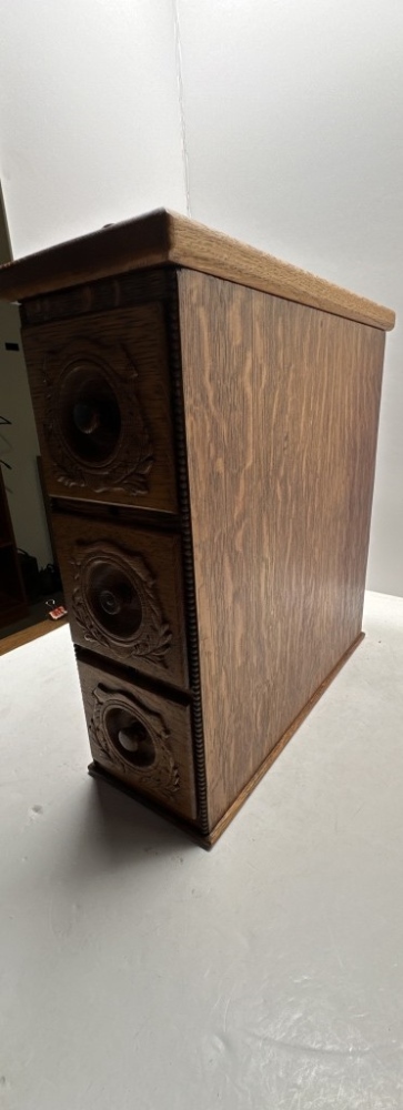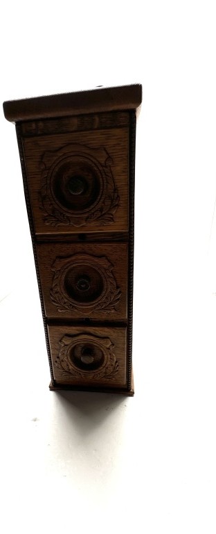 MINI SET OF WOODEN DRAWERS, THREE NARROW DRAWERS, ORNAMENTAL DESIGN ON SIDE