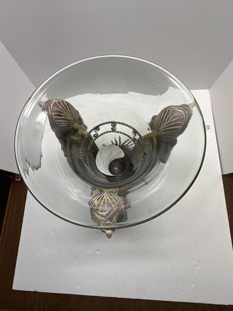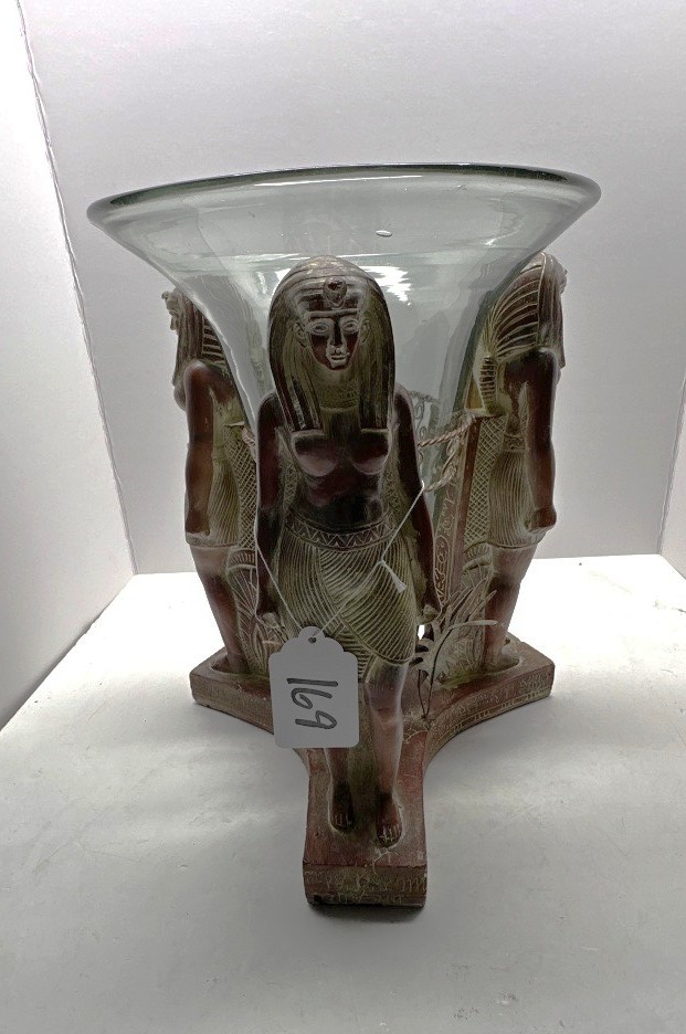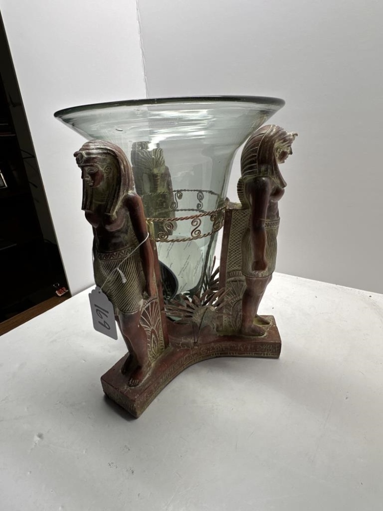 EGYPTIAN STYLE VASE, THREE FIGURINES HOLDING GLASS VASE, WOODEN CARVING DESIGNS
