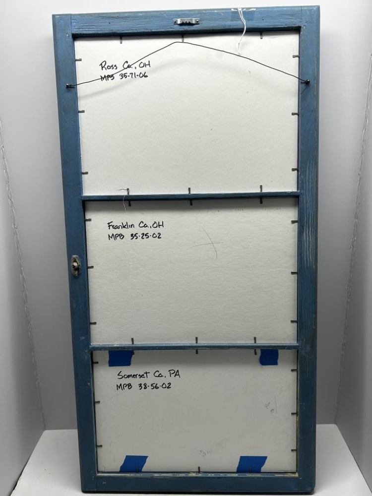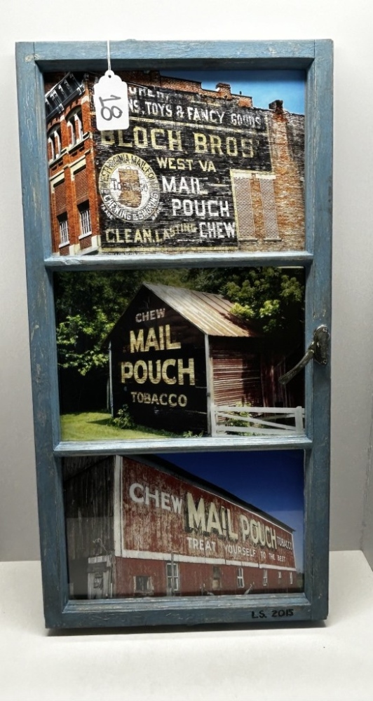 THREE MAIL POUCH TOBACCO BARN PHOTOS IN AN OLD BLUE WINDOW, 1.) ROSS CO. OHIO MPB 35-71-06, 2.) FRANKLIN CO. OHIO MPB 35-25-02 3.) SOMERSET CO. PA MPB 38-56-02