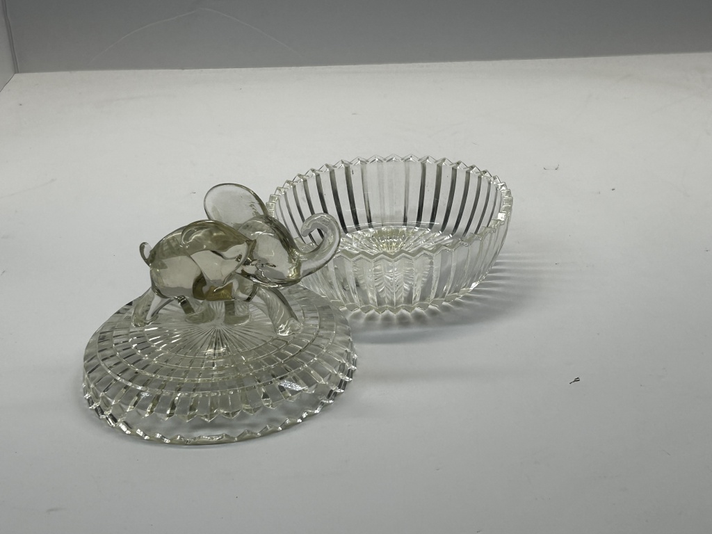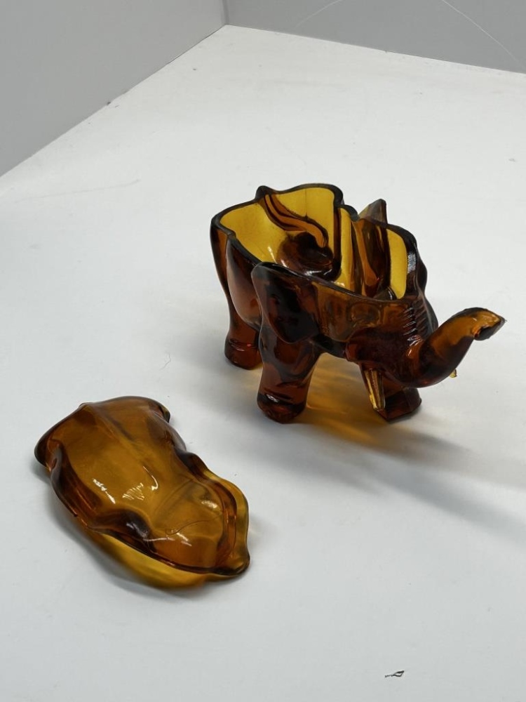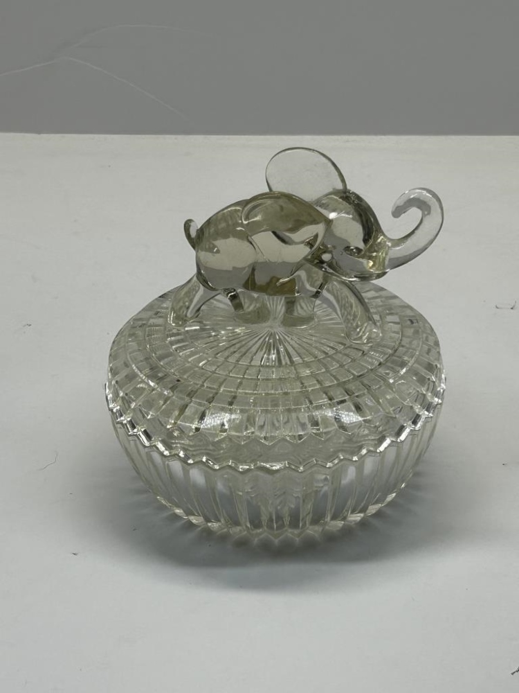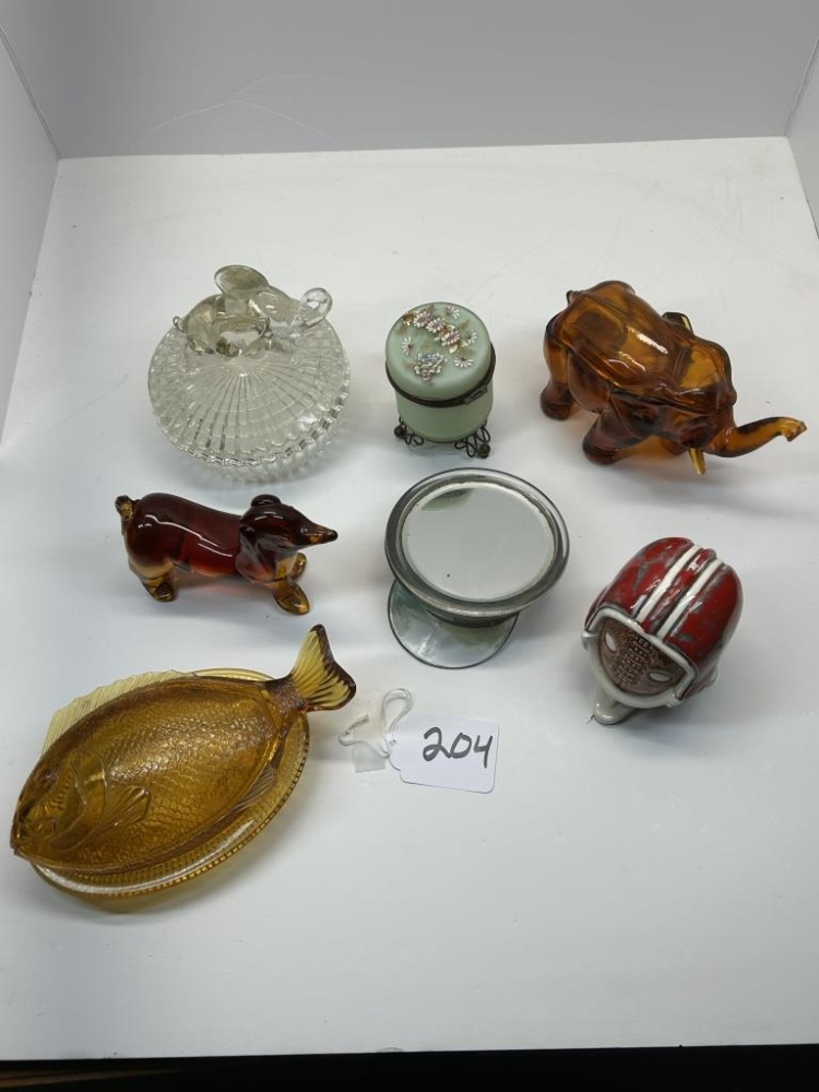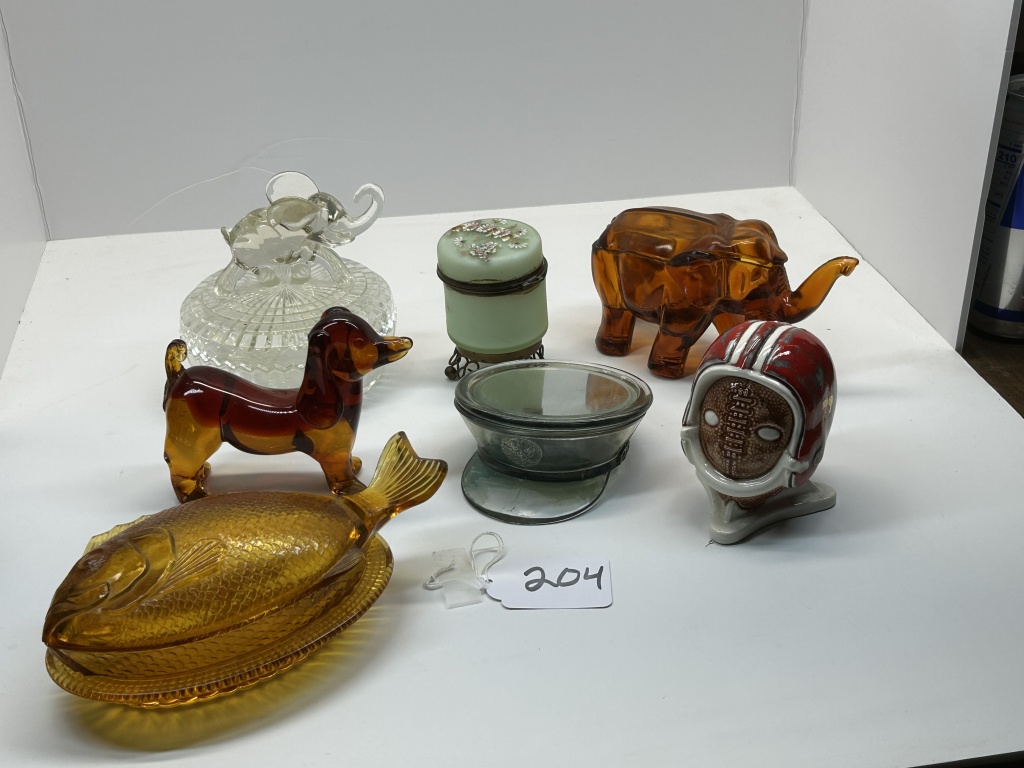 ELEPHANT DISH WITH LID, FISH DISH, FOOTBALL HELMET, DOG, ELEPHANT, JEWLREY BOX, POLICE HAT