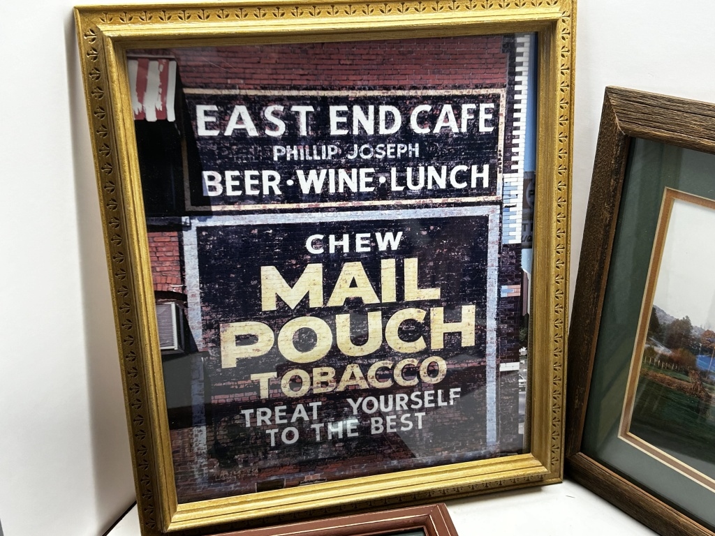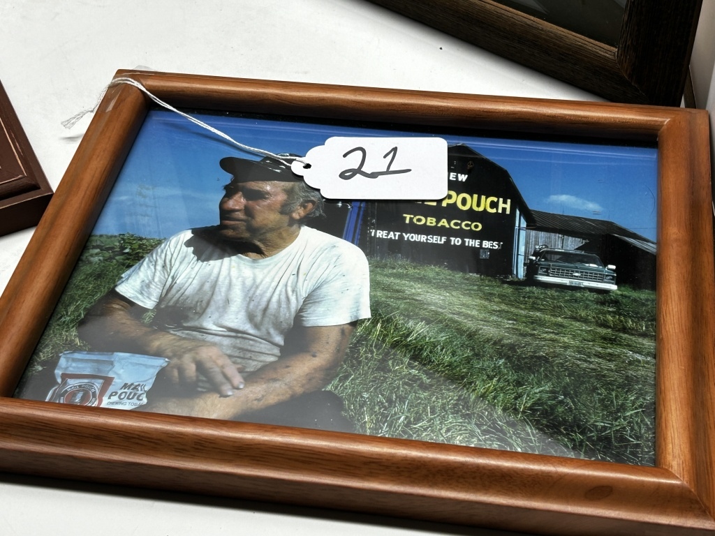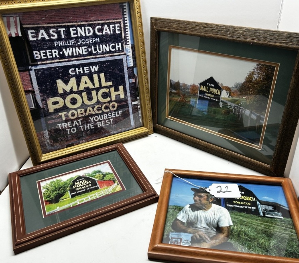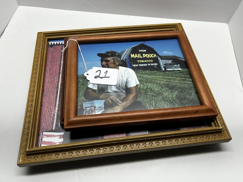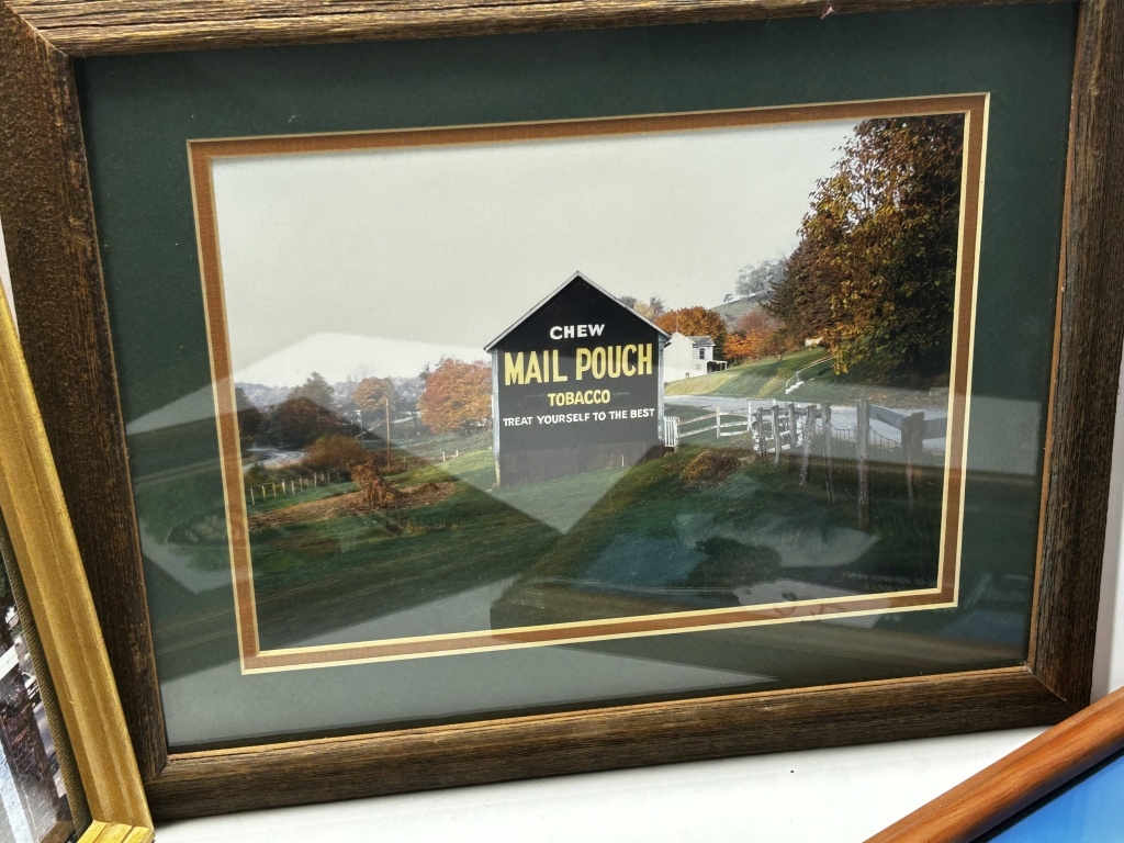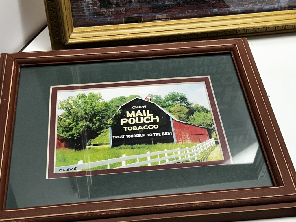 FOUR WOODEN FRAMED PHOTOS OF MAIL POUCH TOBACCO BARNS, BARN IMAGE WITH “CLEVE” WRITTEN IN BOTTOM LEFT CORNER FROM SANDYVILLE W.VA., IMAGE WITH MAN SITTING IN FRONT OF A BARN BY MICHAEL MAUNEY FOR PEOPLE MAGAZINE