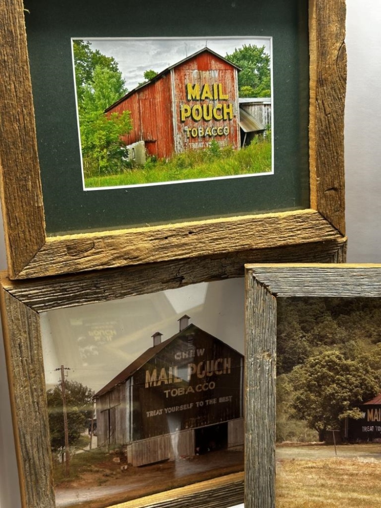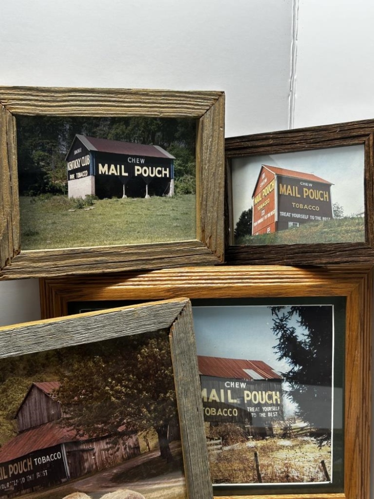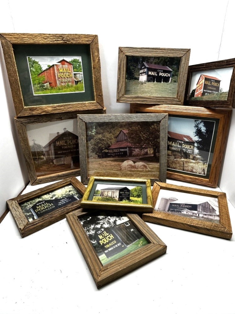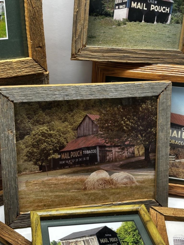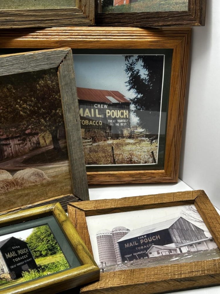 9 PHOTOS OF MAIL POUCH TOBACCO BARNS, WOODEN FRAMES, 5 FRAMES WITH WRITING/DESCRIPTION ON BACK