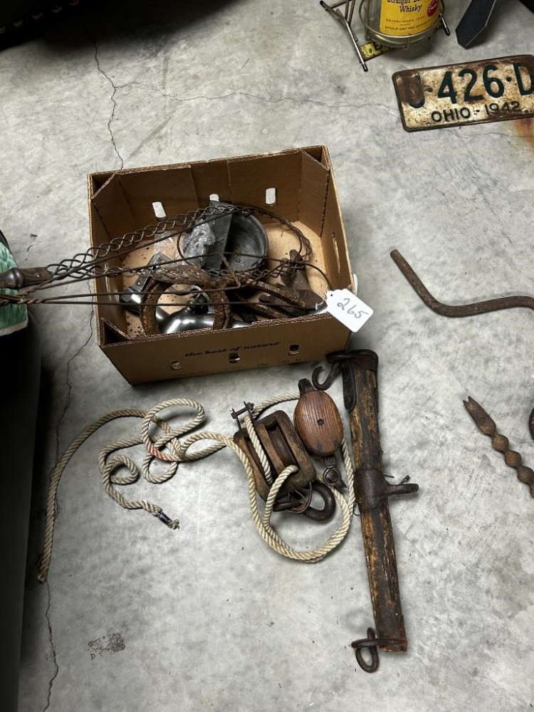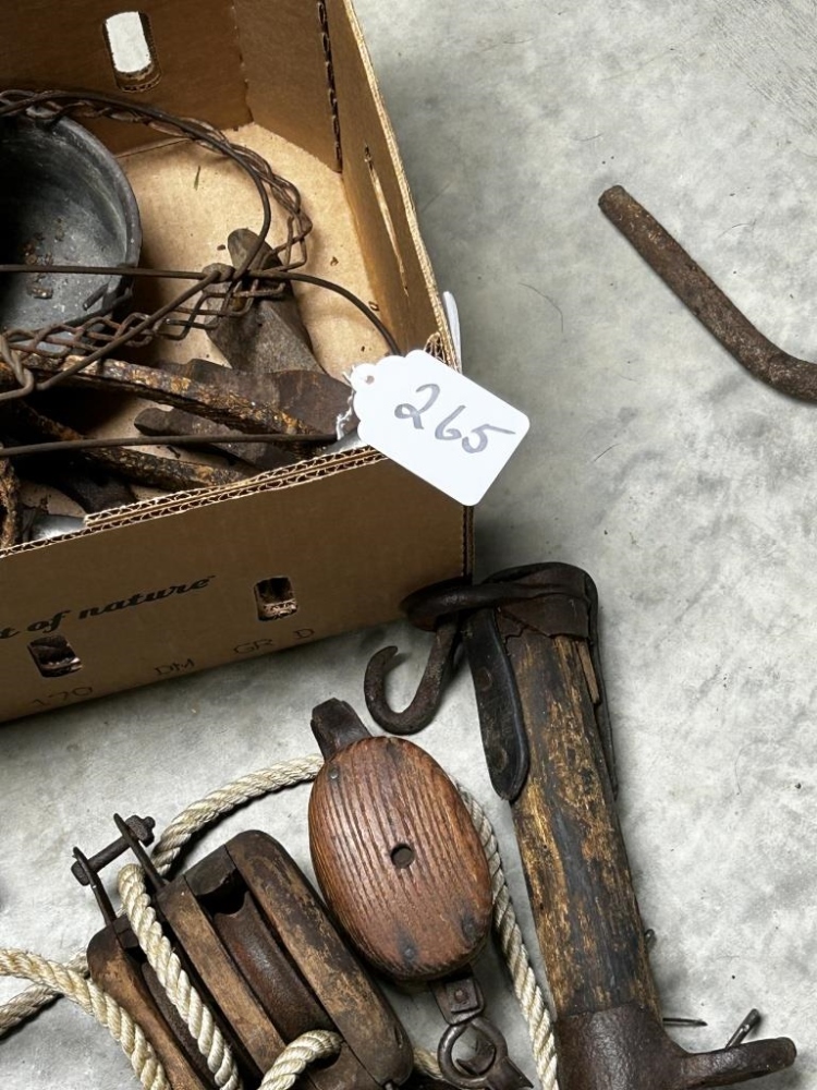 ANTIQUE TAXIDERMY MOUNTED PHEASANT, ROPE, HOOKS, ETC