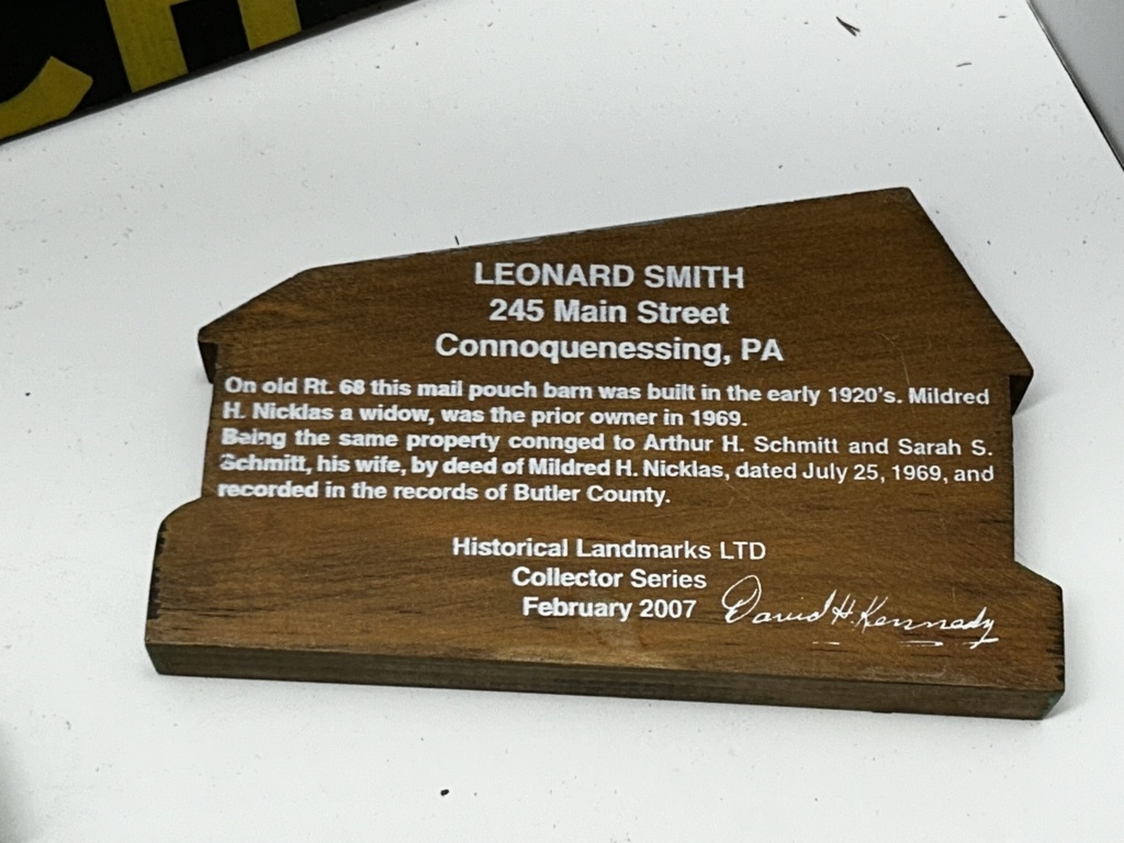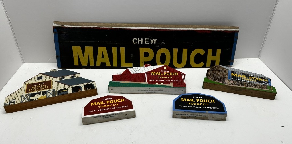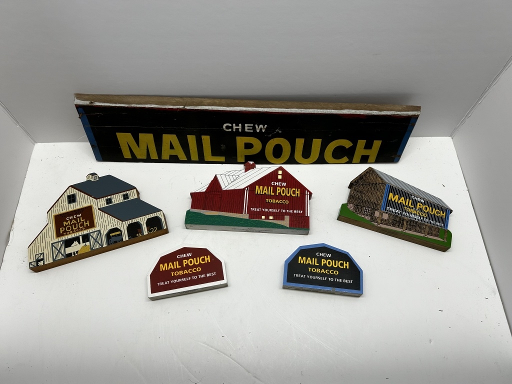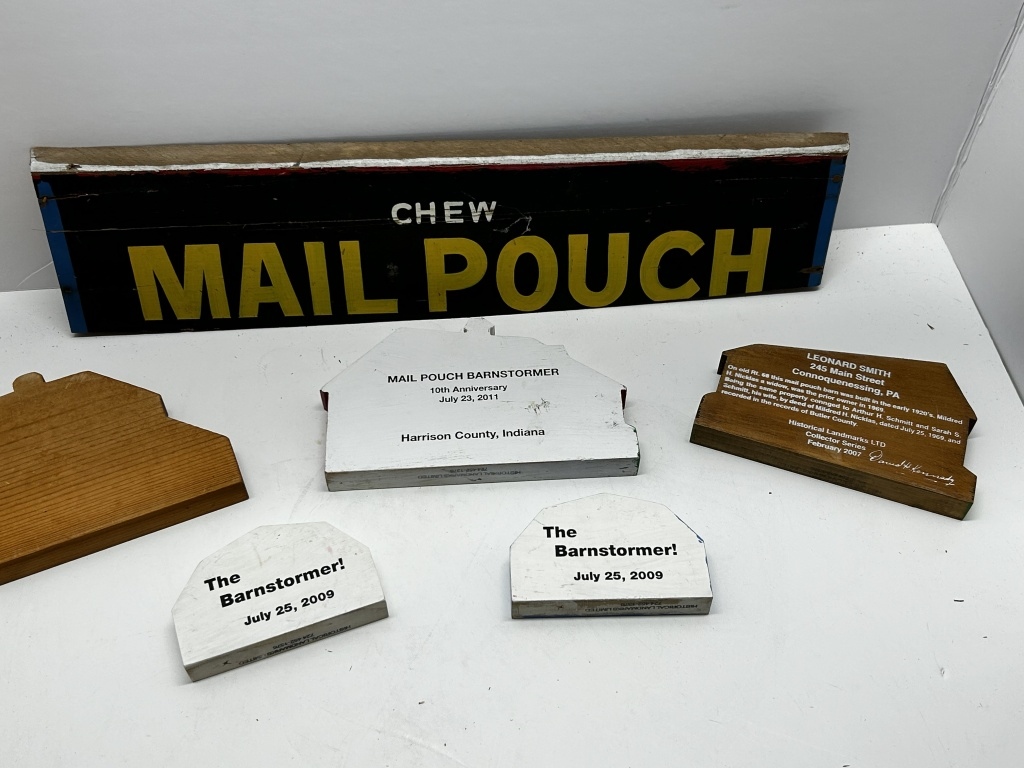 BOX OF MAIL POUCH TOBACCO SIGN AND BARN WALL HANGINGS, ALL WOODEN